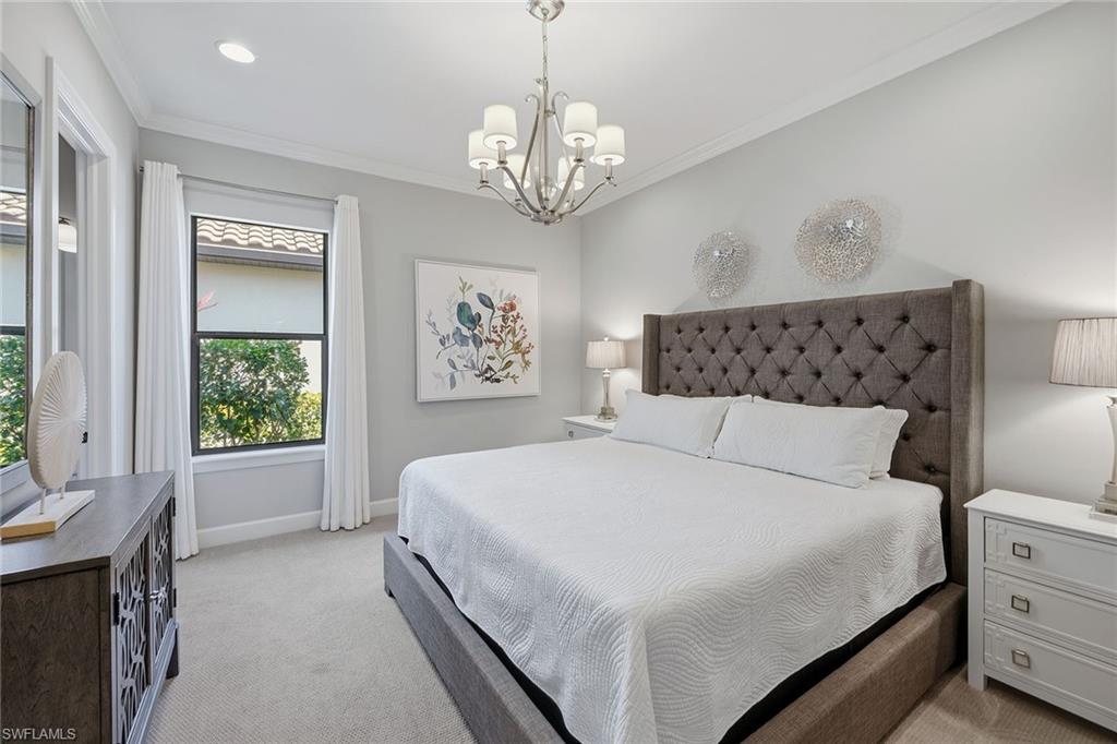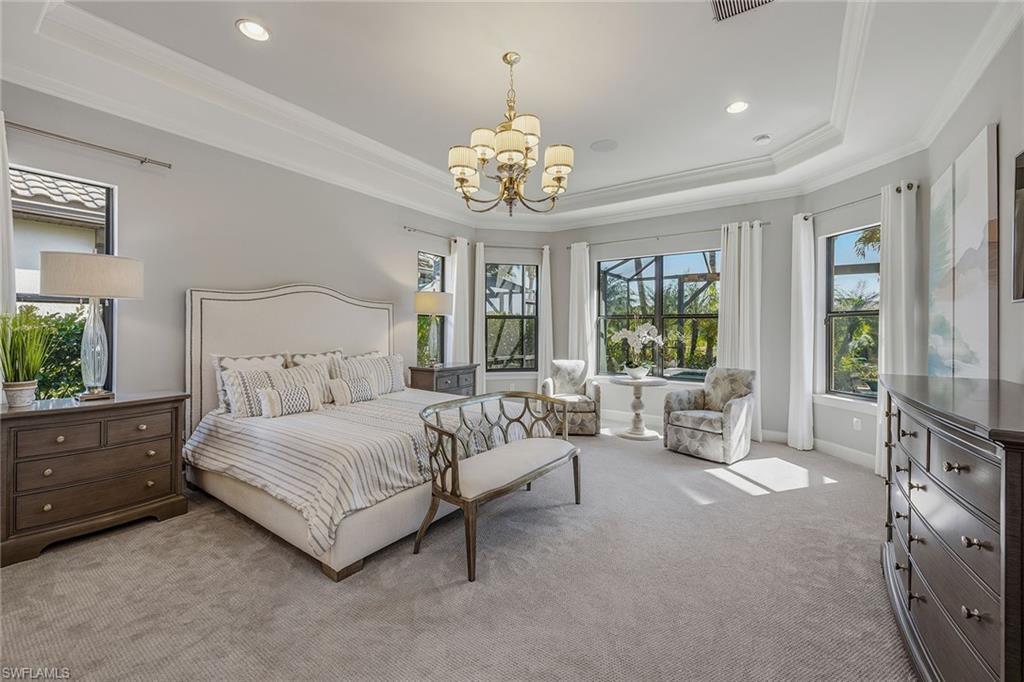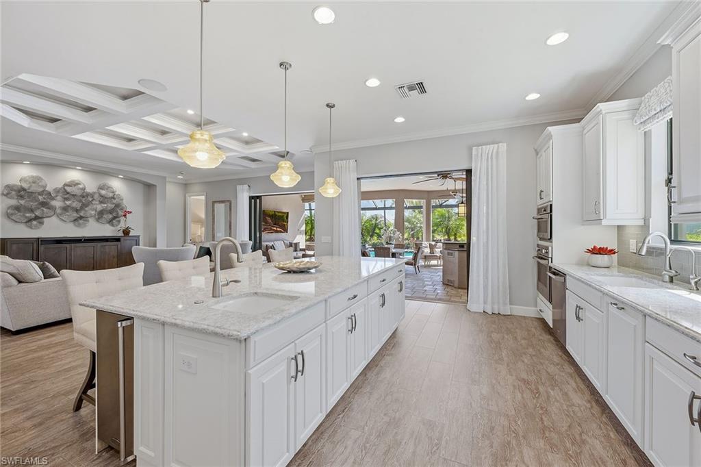 At the end of a quiet cul-de-sac in highly regarded Oyster Harbor, this lushly landscaped, beautifully furnished, extensively upgraded residence occupies an exceptional homesite with southern and western exposures, filling the home with natural light and showcasing sweeping panoramic lake views and breathtaking sunsets. Surrounded by water on two sides and with no neighboring home directly to the right, the setting offers remarkable privacy and lives like a private peninsula, a rare combination in the community. The location offers tranquility and convenient access to world-class amenities. Designed for seamless indoor-outdoor living, the Palazzio floor plan features three bedrooms plus a study and three full baths, blending refined finishes with thoughtful upgrades in a serene waterfront setting. Exterior highlights include a paver driveway, tile roof and a gorgeous outdoor space including a heated saltwater pool and spa with cascading water features. The screened lanai offers a picture-window enclosure, summer kitchen with granite bar, five-burner grill, refrigerator, gas fireplace, in-ceiling speakers and dual ceiling fans, ideal for sunset entertaining. Impact windows, pocketing sliders and an electric storm screen provide protection and privacy, while landscape lighting, security system, tankless gas water heater and a 32-kilowatt liquid-cooled whole-house generator add peace of mind. Inside, 35-by-8-inch wood-look porcelain tile flows throughout, enhanced by crown molding and arched walkways. The living room features a coffered ceiling with crown detail and accent lighting, recessed wall detail, LED lighting, in-ceiling speakers and soaring 10 ½-foot ceilings that enhance the open feel, while the dining area continues the elegant finishes. The kitchen is appointed with quartz countertops, glass tile backsplash, large island, under-cabinet lighting and walk-in pantry, along with premium stainless appliances, including a five-burner natural gas cooktop with griddle and hood, wall microwave and convection oven, dishwasher, French-door refrigerator, wine cooler and separate ice maker. The primary suite offers a tray ceiling, crown molding, recessed lighting and in-ceiling speakers, opening to a spa-inspired bath with walk-through shower, rain head, quartz dual vanities and custom walk-in closet. Two guest bedrooms provide comfortable accommodations, one en-suite, with both guest baths featuring quartz vanities and walk-in showers. The den includes built-in desks and custom cabinetry, ideal for a home office. A well-equipped laundry room offers quartz counters, utility sink and cabinetry. The garage features a painted floor and water softener system. Residents enjoy a sought-after gated community with resort-style pools, fine and casual dining, fitness, pickleball, tennis, ample sidewalks for walking and bicycling, and a full array of activities and events. Optional golf, beach and marina memberships also available.