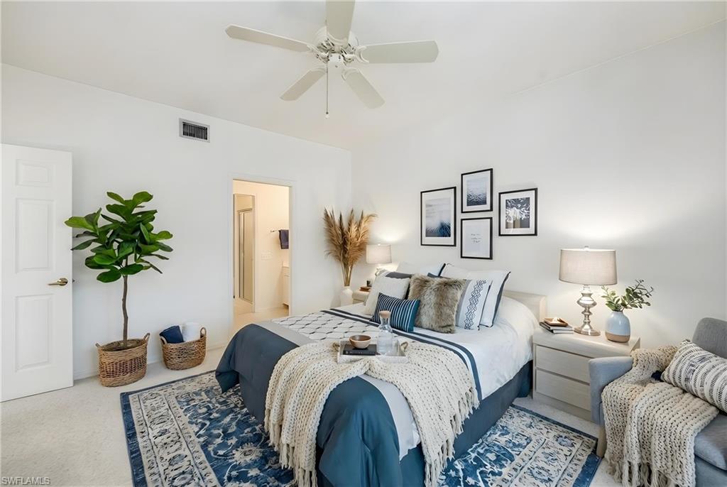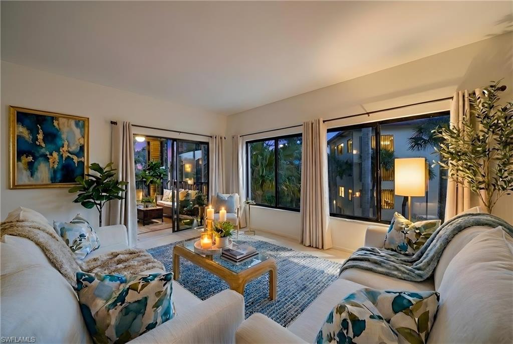 Welcome to this beautifully maintained residence offering serene golf course views and effortless indoor-outdoor living in one of Naples’ most sought-after communities. This spacious condominium features a bright, open floor plan with expansive windows, abundant natural light, and a soothing coastal palette throughout. The living area is generous and inviting, complete with large sliders that open to a glassed in, screened lanai, perfect for morning coffee or evening dining while overlooking lush tropical landscaping and manicured fairways. The dining space flows seamlessly into the living room and kitchen, creating an ideal setting for entertaining. The kitchen offers granite countertops, ample cabinetry, stainless steel refrigerator, tray ceiling detail, and a convenient pass-through to the dining area. A dedicated laundry space with additional storage shelving adds everyday convenience. The primary suite features lanai access, large windows, and an en-suite bath with dual vanities, soaking tub, and separate shower. The guest bedroom is bright and welcoming, ideal for visitors or a home office. Additional highlights include: • Screened lanai with tropical and golf course views • Multiple large windows providing exceptional natural light • Neutral finishes throughout • In-unit laundry • Assigned covered parking (as shown in aerial imagery) Interlachen at Pelican Bay offers a peaceful setting surrounded by golf course and lake views, just moments from all of Pelican Bay’s premier amenities. Residents of Pelican Bay enjoy private beach access with attended services, beachfront dining, fitness center, tennis, walking paths, and a vibrant community lifestyle — all centrally located near Waterside Shops and Artis–Naples. A wonderful opportunity to enjoy the Pelican Bay lifestyle in a bright, move-in ready residence.