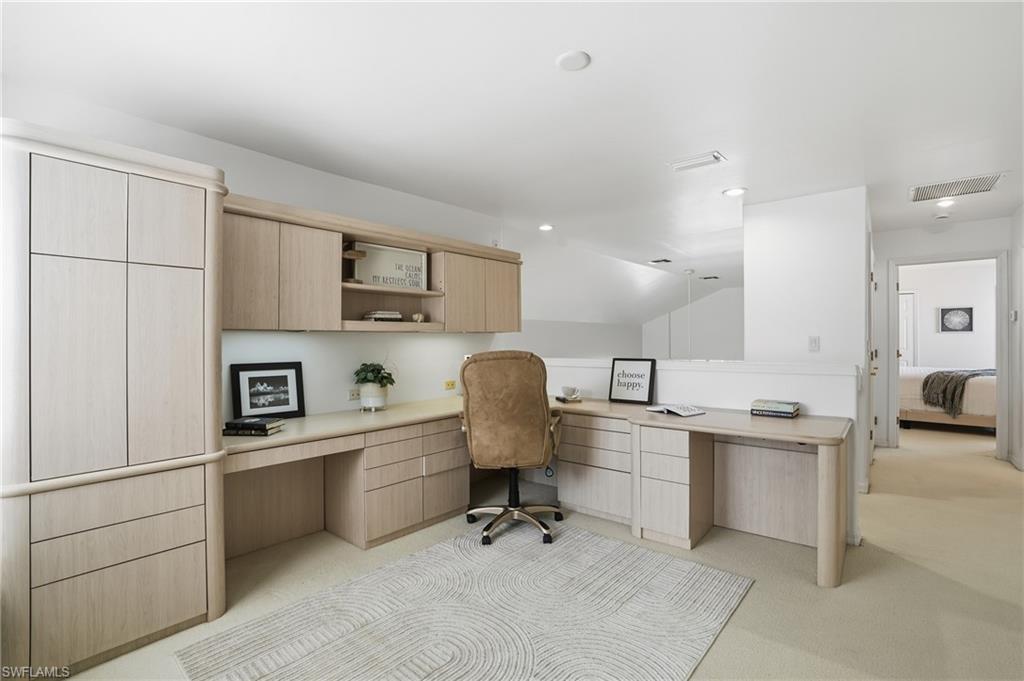 Welcome to Savanna, an exclusive enclave of just 36 homes within Pelican Marsh. This 2,660+ square-foot, two-story residence offers space, flexibility, and exceptional value and potential. Lovingly maintained by its original owner, the home features three bedrooms plus a den, along with an upstairs bonus space currently configured as a dual workstation office — easily adaptable to a media room, lounge, or playroom. The open, functional floor plan flows seamlessly between the main living areas, formal dining space, and a separate breakfast nook — ideal for both everyday living and entertaining. The kitchen offers generous workspace, a walk-in pantry, and a layout designed for gathering. The spacious primary suite features dual vanities, a walk-in shower, soaking tub, private water closet, and a large walk-in closet — offering a well-designed footprint ready for your personal touch. Outdoor living includes a private pool overlooking lush landscaped views, creating a peaceful and private setting. Electric storm shutters provide added protection, and the home is located in Flood Zone X (no flood insurance required).