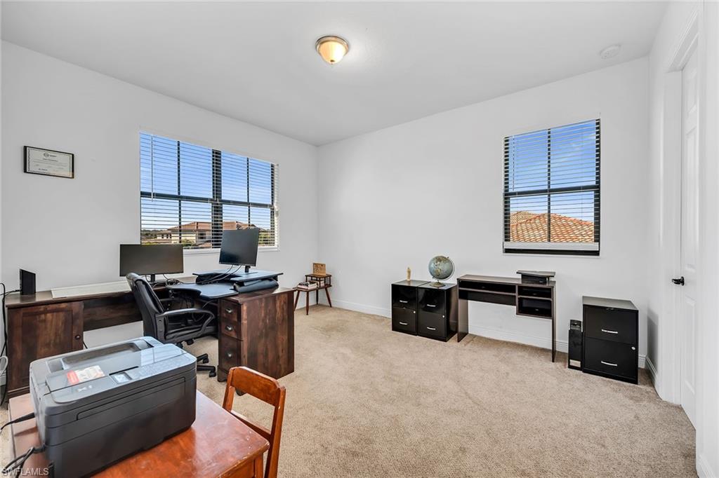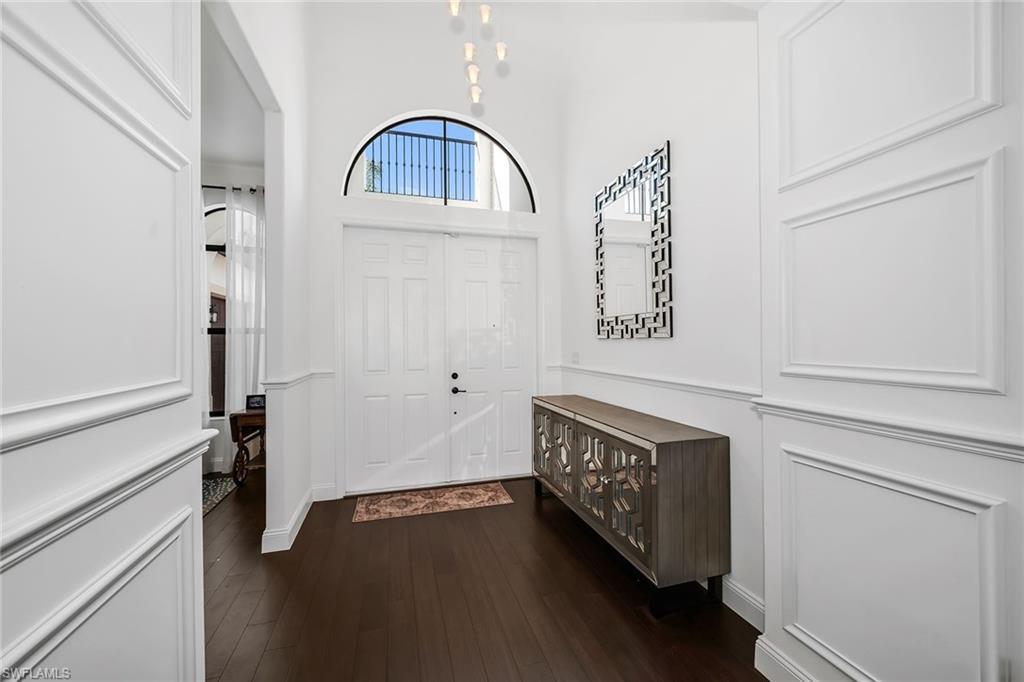 In the exclusive Maple Ridge Reserve in Ave Maria, this exceptional Elsinore floor plan showcases private garden views, custom upgrades and a spacious oversized homesite with a large backyard offering partial lake and preserve views. Designed for elegance and comfort, the two-story residence features four bedrooms plus a den, three full baths and a three-car garage. Hardwood flooring flows throughout the main living areas, complemented by custom wall trim and modern light fixtures that elevate the home’s refined aesthetic. The expansive backyard provides ample room for a custom pool, while the panoramic screened lanai creates a seamless connection between indoor and outdoor living. A grand double-door entry with an arched transom window welcomes you into a thoughtfully designed interior where natural light fills each space. The main living areas are enhanced by rich wood flooring and detailed millwork. Glass sliders open to the lanai from multiple rooms, offering tranquil views. The great room is highlighted by a stunning chandelier set within a tray ceiling and provides direct lanai access, while adjacent family room features a striking stacked stone entertainment center with fireplace, creating a warm and inviting gathering space. The chef’s kitchen blends timeless style with functionality, appointed with white cabinetry including glass-front upper cabinets and under-cabinet lighting, granite countertops, tile backsplash and a window above the sink for natural light. Stainless steel appliances include a range with hood, dishwasher, refrigerator/freezer and microwave. A formal dining area or den is positioned beside a large window, offering flexibility for entertaining or a private home office. A first-floor guest bedroom is conveniently adjacent to a full bath with walk-in shower and glass enclosure. Upstairs, the spacious primary suite offers a bonus area and two walk-in closets. The en-suite bath features dual vanities with a dedicated makeup counter, full-width framed mirrors, a walk-in shower with glass enclosure and a separate soaking tub. Two additional guest bedrooms share a Jack-and-Jill bath with shower and tub combination. A versatile flex room provides a setting for a media or game room. The laundry room is equipped with a Whirlpool front-load washer and dryer along with overhead cabinetry for added storage. Storm protection includes impact windows and shutters for added peace of mind. Residents of Maple Ridge Reserve enjoy resort-style amenities including a sparkling pool, fitness center, card and billiards rooms, as well as beautifully appointed event and meeting spaces. Ideally close to Ave Maria University and the vibrant Town Center’s dining and shopping, along with nearby parks, dog parks, scenic trails, pickleball and tennis courts, this home offers an exceptional opportunity to experience the best of Ave Maria lifestyle.