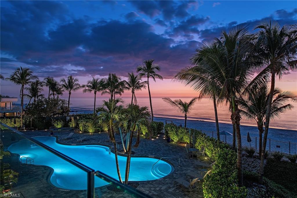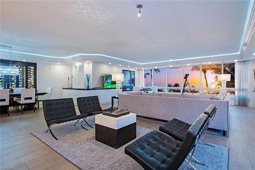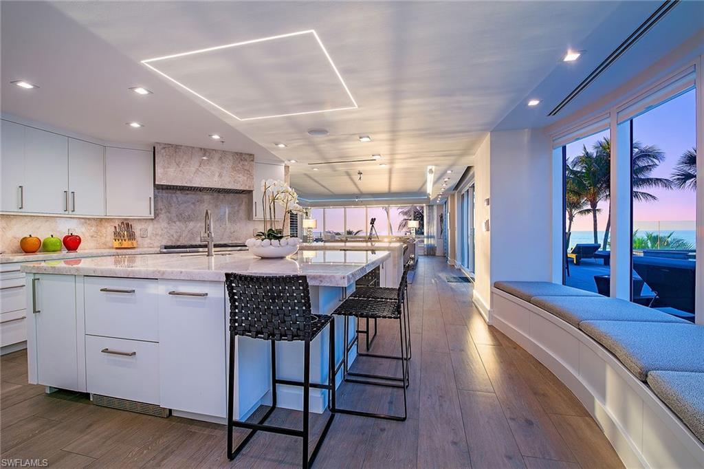 Prepare to be captivated by one of Naples exceptional and unique beachfront offerings. This completely reimagined residence lives with the comfort and privacy of a single-family home yet offers effortless convenience of luxury high-rise living. Arrive via private elevator directly into the residence, where sweeping, unobstructed Gulf views immediately set the tone. Encompassing over 6,100 square feet of air-conditioned living space, the thoughtfully designed floor plan includes three en-suite guest bedrooms, each with direct access to the expansive outdoor deck, a spacious den and an extraordinary primary suite. The primary wing offers a private office, a fireplace-accented bedroom and a lavish spa-inspired bath with an exquisite custom wardrobe. Floor-to-ceiling glass captures panoramic views of the Gulf and beach from nearly every vantage point. The chef’s kitchen is elegant and functional, featuring gas cooking, refrigerated drawers, dual dishwashers, climate-controlled wine storage and striking quartzite waterfall countertops. Just beyond the residence, and deeded to the unit, a separate guest suite provides complete independence for visitors. This fully equipped retreat includes a bedroom, bath, kitchen and living room. Seamless indoor-outdoor living defines the home, as the interiors flow effortlessly onto an extraordinary, private 5,700-plus-square-foot beachfront terrace. Exclusive to TL-2, this one-of-a-kind outdoor oasis features a heated pool/spa, summer kitchen, fire pit and generous entertaining areas, all with direct distance to the sand. Whether enjoying sunrise over the Gulf or evening sunsets along the shore, the setting is nothing short of spectacular. Completing this remarkable offering is a private lobby-accessible garage, with a lift, accommodating three vehicles, an exceptional amenity rarely found in beachfront high-rise living.
