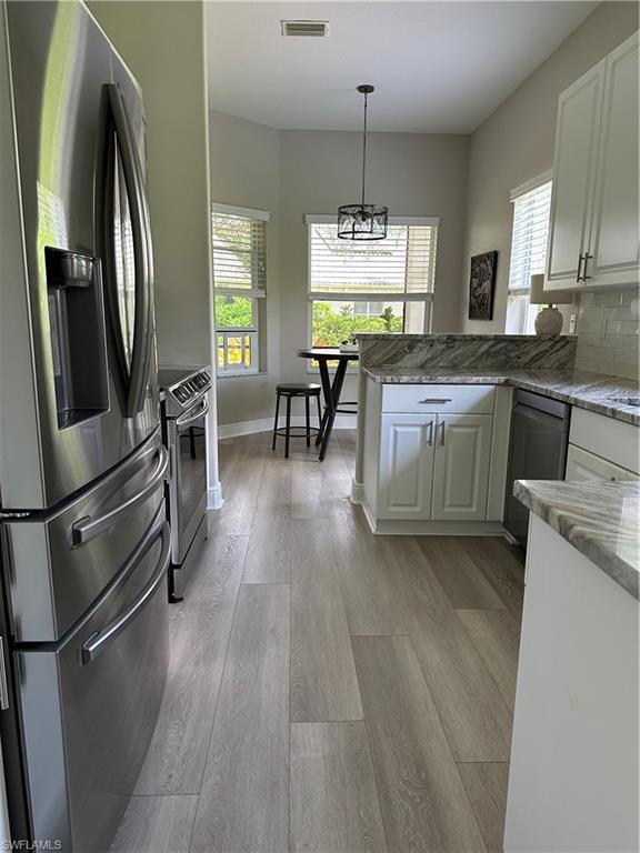 A freshly painted exterior welcomes you to this meticulously maintained three bedroom, two bath home in the private community of Villa Vistana just a half mile from the Vineyards North Gate. Luxury vinyl plank flooring and a beautiful neutral wall color throughout make it easy to decorate with your own personal style. A spacious breakfast nook overlooks the expansive landscaped back yard. A remodeled walk through galley kitchen includes stainless steel appliances and granite counters with an appealing and versatile color and design. The primary bath is appointed with marble and granite and the attached two car garage boasts extra overhead storage. Living in the Vineyards combines an idyllic setting with the conveniences of nearby shopping, dining, entertainment, healthcare, parks, and the beach. The private, nonequity Vineyards Country Club also offers several types of membership opportunities. HOA Maintenance includes roof pressure cleaning once a year. Maintenance fee includes exterior painting which was just completed this year.