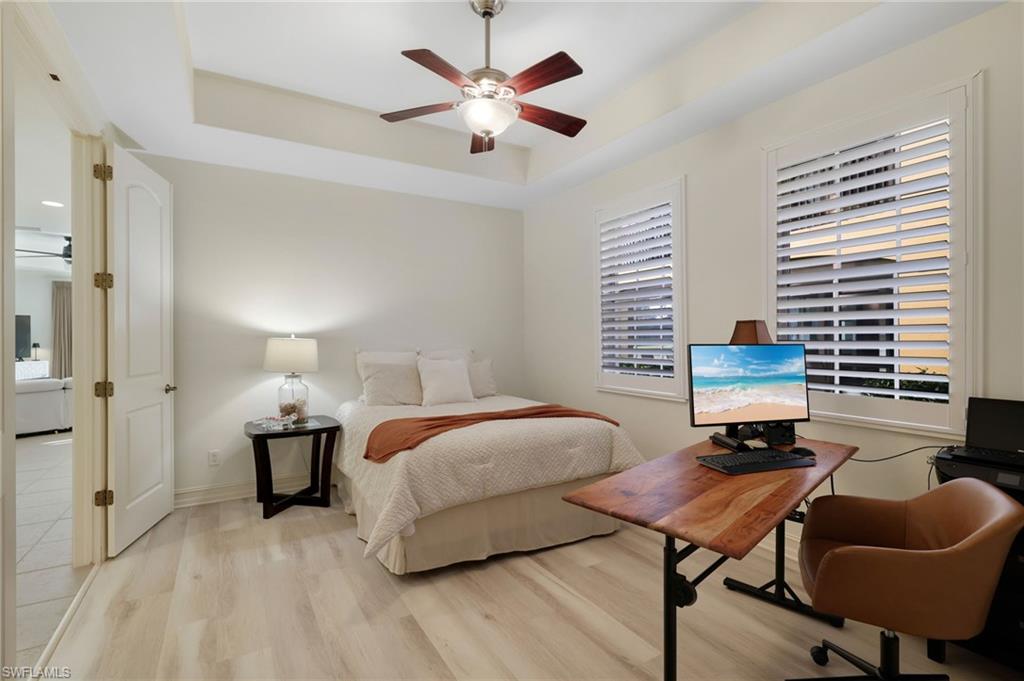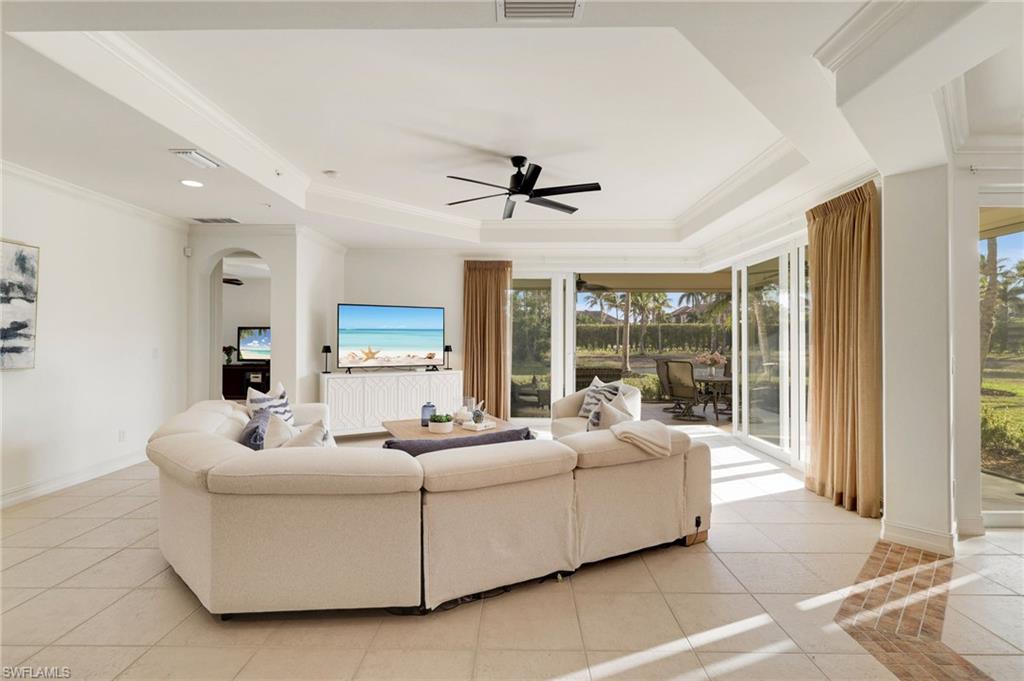 Welcome to this beautifully positioned first-floor Vivaldi residence in Miromar Lakes Beach & Golf Club, offering effortless lakefront living with desirable southern exposure and sweeping long lake views. Bathed in natural light throughout the day, this two-bedroom plus den condominium captures stunning sunsets and invites you to enjoy peaceful evening walks along the beach just steps from your door. The thoughtfully designed floor plan offers an open and inviting layout, ideal for both everyday living and entertaining. The spacious kitchen flows seamlessly into the living and dining areas, all oriented toward the water views. A versatile den provides the perfect space for a home office, media room, or additional guest accommodations. One of the most special features of this residence is the expansive wraparound lanai, complete with hurricane shutters for peace of mind and an outdoor kitchen that makes alfresco dining and sunset gatherings effortless. Whether hosting friends or enjoying a quiet morning coffee, the outdoor living space truly extends the home. Located directly across from the Vivaldi community pool, you’ll enjoy the convenience of resort-style relaxation just steps away, while still savoring the privacy of your own lakeside retreat. Beyond your front door, the award-winning community offers an extraordinary array of amenities designed to elevate everyday living. Residents enjoy a private white sand beach stretching along 700 acres of freshwater lakes, a full-service marina, boating, paddleboarding, and kayaking. The elegant clubhouse features waterfront dining, indoor and outdoor bars, and a vibrant social calendar filled with events and activities. Fitness enthusiasts appreciate the state-of-the-art fitness center, full-service spa, Har-Tru tennis courts, pickleball, and bocce. The championship golf course provides an exceptional experience for players of all levels, while scenic walking and biking paths wind throughout the community. With beach access nearby, panoramic water views, and world-class amenities at your fingertips, this Vivaldi residence offers the perfect blend of luxury, leisure, and the effortless coastal lifestyle that makes Miromar Lakes so special.