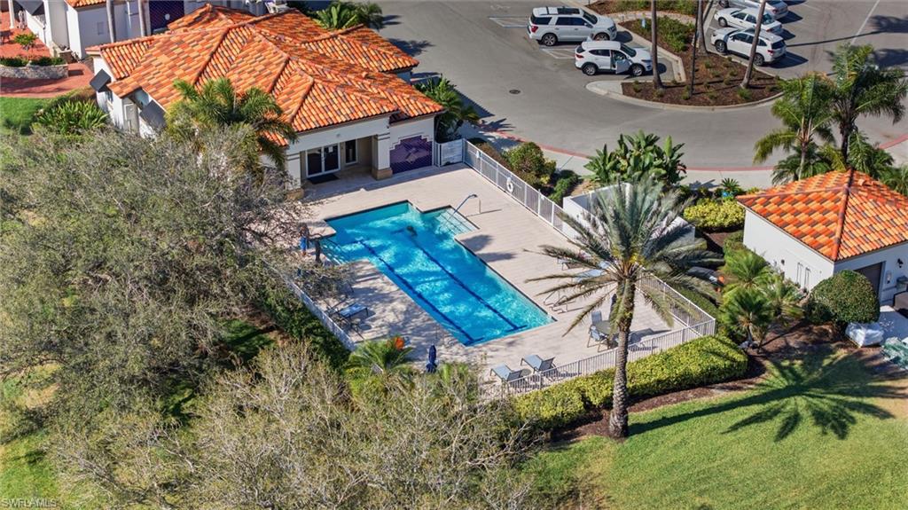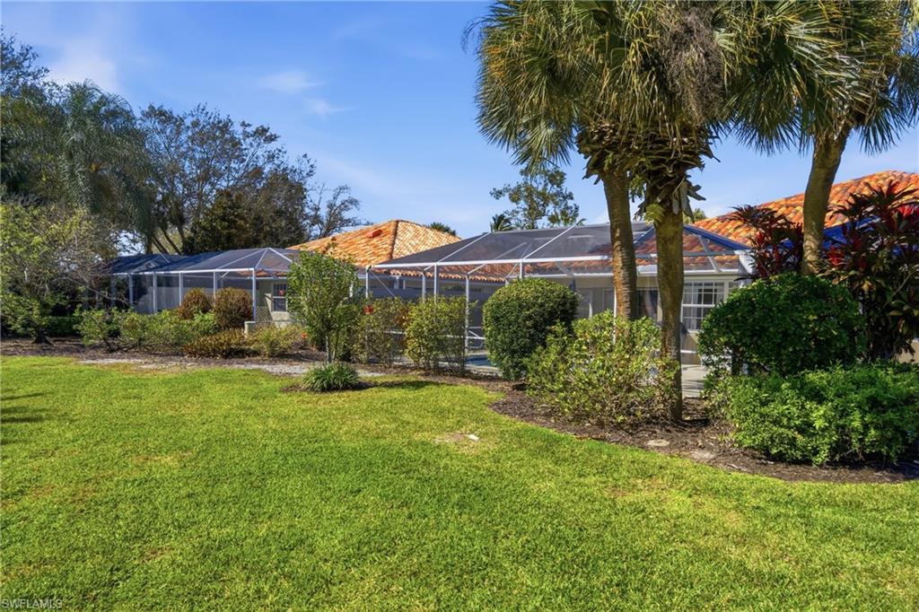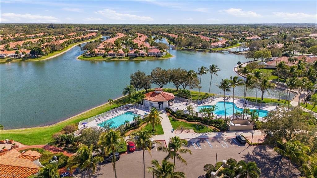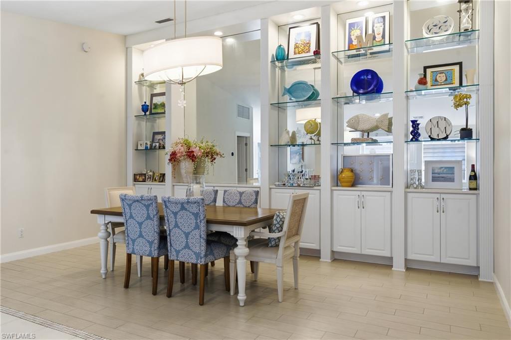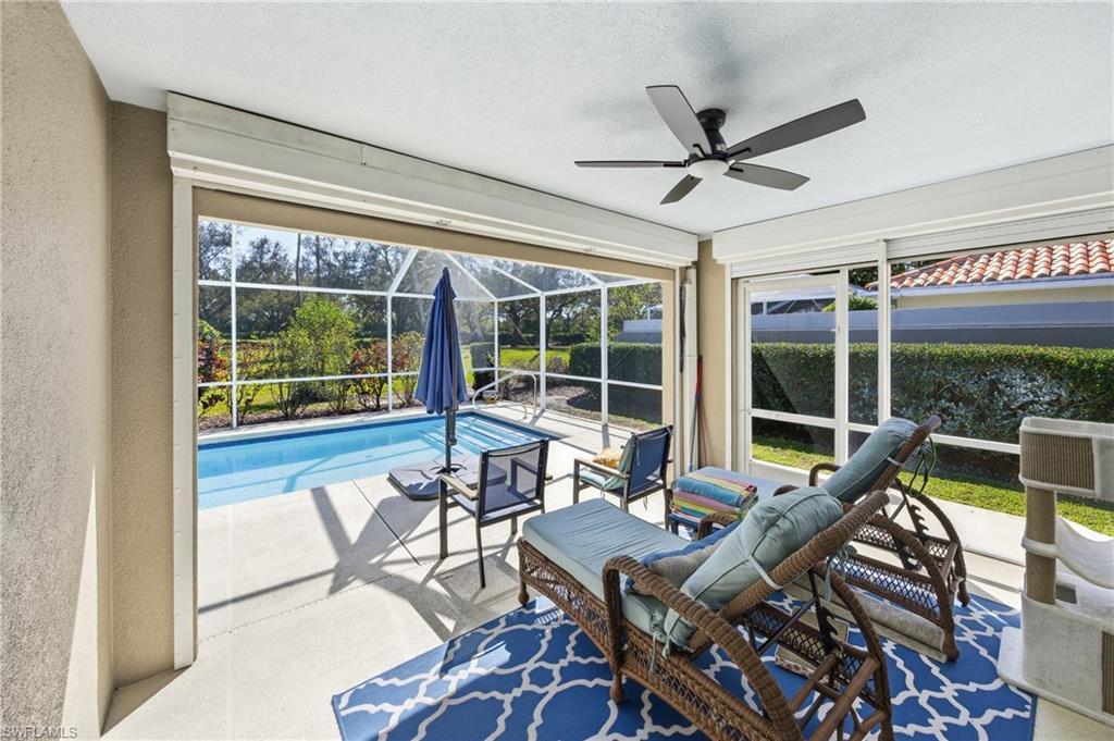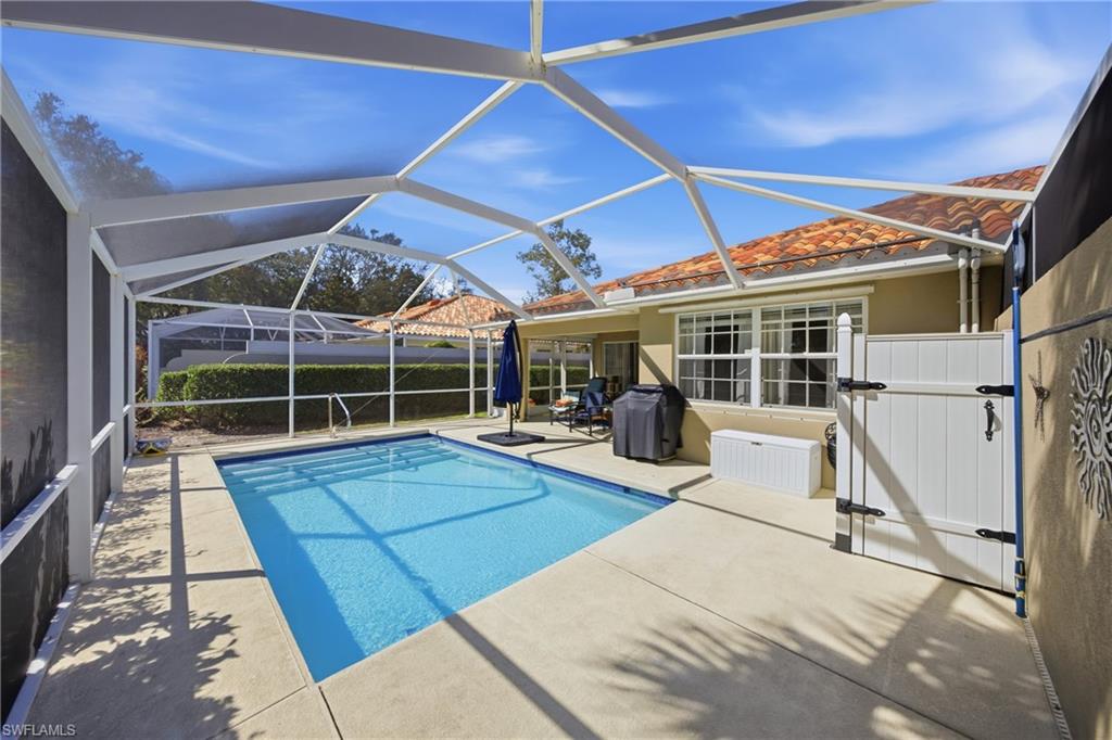 Rarely available Capri villa with a private solar-heated pool in the highly desirable North Naples community of Village Walk. Offering 1,540 square feet under air, this 2 bedroom plus den residence features the popular split bedroom floor plan, vaulted ceilings, and a two car garage. The home has been lightly updated and features tile flooring throughout the main living areas, carpet in the bedrooms, and an updated kitchen with quartz countertops. Sliding glass doors open to an oversized screened lanai with southern exposure and a private solar-heated pool, creating a peaceful outdoor setting ideal for relaxing or entertaining. Electric hurricane shutters on the lanai provide added convenience and storm protection. Major updates have already been completed including a newer roof, AC, water heater, and pool improvements, offering added peace of mind for the next owner. Positioned on a quiet street with lush landscaped views, the home provides privacy rarely found at this price point. Village Walk is a gated North Naples community known for scenic walking and biking paths connected by Venetian-style bridges over lakes and canals. Residents enjoy resort-style amenities including a town center with restaurant, fitness center, tennis, pickleball, bocce, resort and lap pools, and a full calendar of social activities. Ideally located just minutes to Vanderbilt Beach, Mercato, and some of the best shopping and dining in Naples. Private pool Capri villas in Village Walk are rarely available.