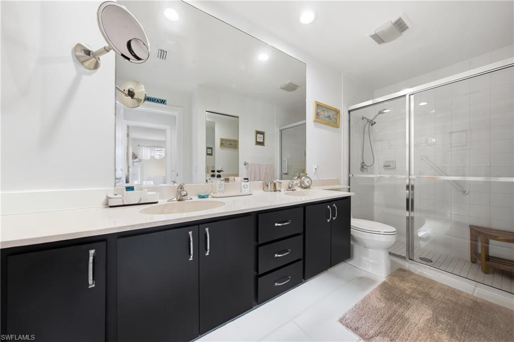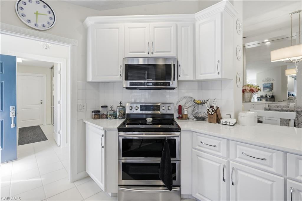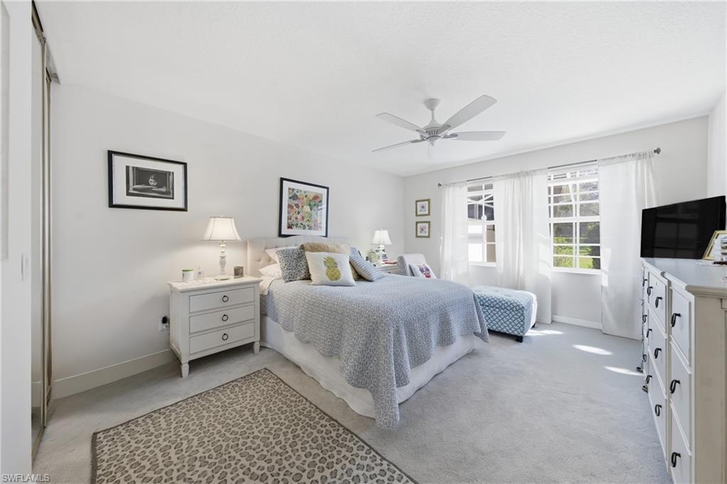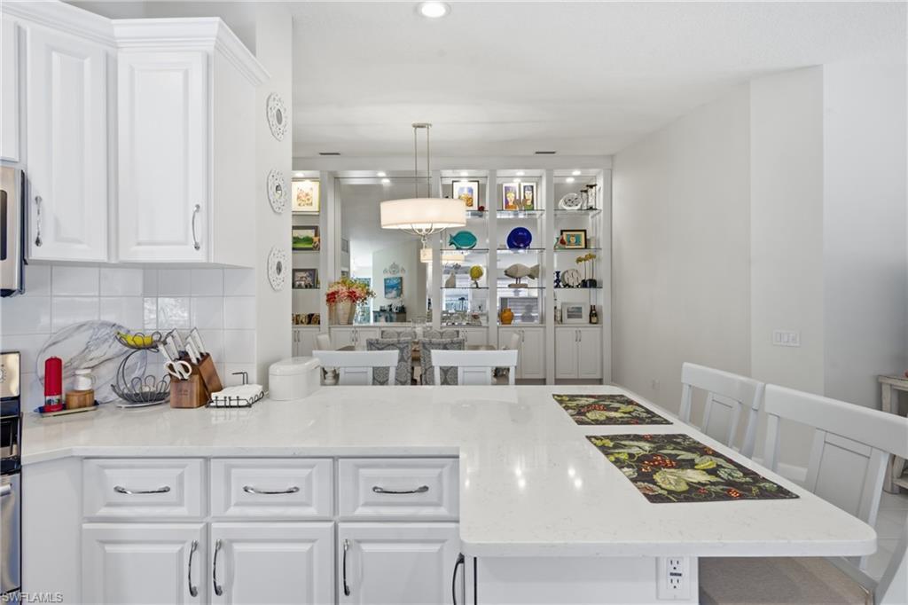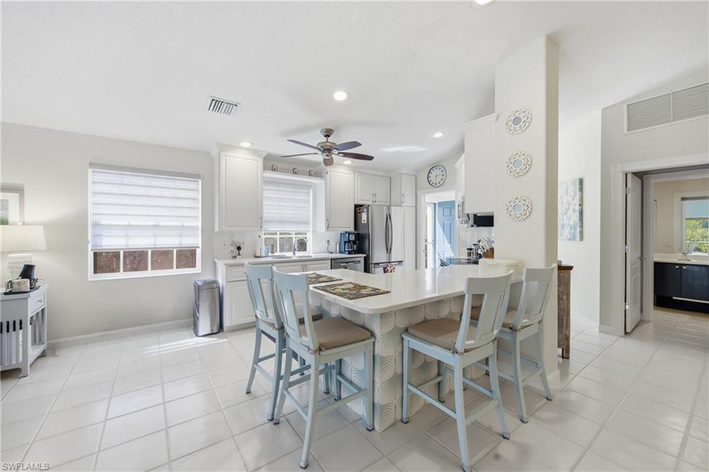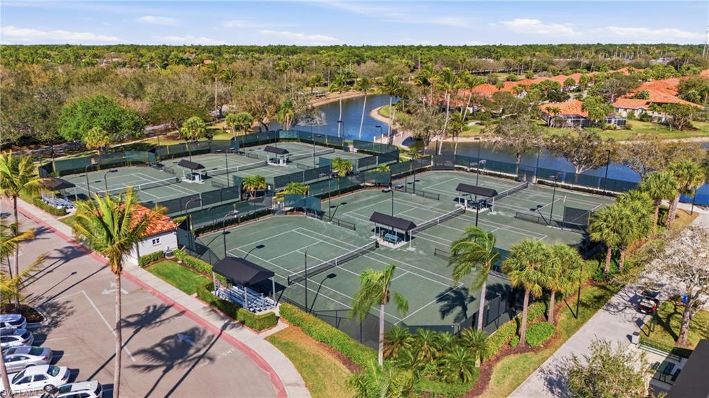 Rarely available Capri villa with a private solar-heated pool in the highly desirable North Naples community of Village Walk. Offering 1,540 square feet under air, this 2 bedroom plus den residence features the popular split bedroom floor plan, vaulted ceilings, and a two car garage. The home has been lightly updated and features tile flooring throughout the main living areas, carpet in the bedrooms, and an updated kitchen with quartz countertops. Sliding glass doors open to an oversized screened lanai with southern exposure and a private solar-heated pool, creating a peaceful outdoor setting ideal for relaxing or entertaining. Electric hurricane shutters on the lanai provide added convenience and storm protection. Major updates have already been completed including a newer roof, AC, water heater, and pool improvements, offering added peace of mind for the next owner. Positioned on a quiet street with lush landscaped views, the home provides privacy rarely found at this price point. Village Walk is a gated North Naples community known for scenic walking and biking paths connected by Venetian-style bridges over lakes and canals. Residents enjoy resort-style amenities including a town center with restaurant, fitness center, tennis, pickleball, bocce, resort and lap pools, and a full calendar of social activities. Ideally located just minutes to Vanderbilt Beach, Mercato, and some of the best shopping and dining in Naples. Private pool Capri villas in Village Walk are rarely available.