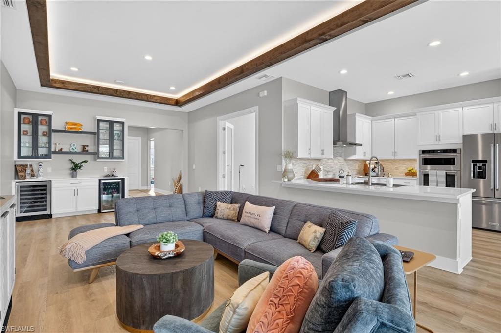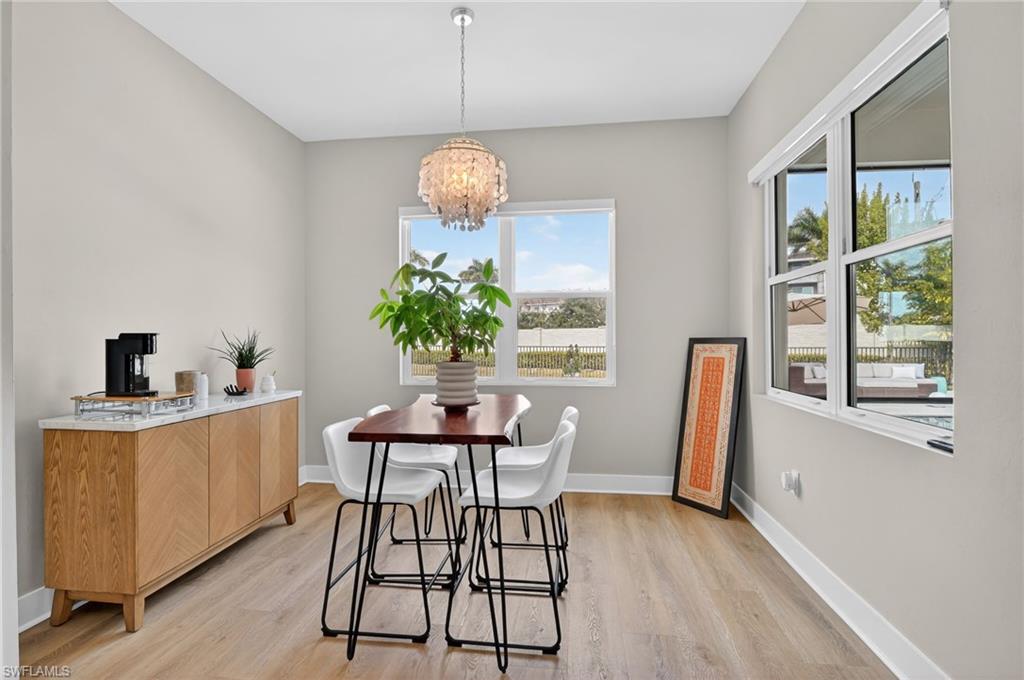 Introducing an exquisite 3-Bedroom + Den, 2-Bath residence in the prestigious Sapphire Cove community. Built in 2022 and meticulously enhanced since, this nearly new estate showcases a seamless fusion of contemporary elegance and bespoke craftsmanship. Set on an oversized, private homesite, the property offers an elevated sense of space and serenity. Recent enhancements including a custom-designed bar, upgraded bedroom flooring, and refined wood detailing accenting tray ceilings and walk-in closets—adding warmth and sophistication throughout. The open-concept floor plan is thoughtfully curated for both refined entertaining and everyday living. Expansive living areas are complemented by luxury vinyl plank flooring, while tray ceilings in the great room and owner’s suite introduce architectural depth and grandeur. At the heart of the home, a chef-inspired kitchen impresses with crisp white cabinetry, premium stainless steel appliances, a sleek statement range hood, quartz countertops, designer tile backsplash, and a generously sized pantry—creating a culinary space as functional as it is beautiful. The private den, accessed through elegant glass double doors, provides an ideal executive office or intimate lounge. The spa-caliber bathrooms feature quartz-topped vanities and contemporary tiled showers, while the owner’s retreat boasts a glass-enclosed shower designed for a tranquil, resort-style experience. Outdoors, the residence transforms into a private sanctuary. A covered, screen-enclosed lanai with tile flooring flows seamlessly to a custom-designed pool and spa. A generous seating area anchored by a built-in fireplace creates a striking setting for evening gatherings. The fenced backyard offers additional green space for recreation and relaxation. With its impeccable design, curated upgrades, and coveted location within Sapphire Cove, this exceptional home presents a rare opportunity to live, work, and entertain in uncompromising luxury.