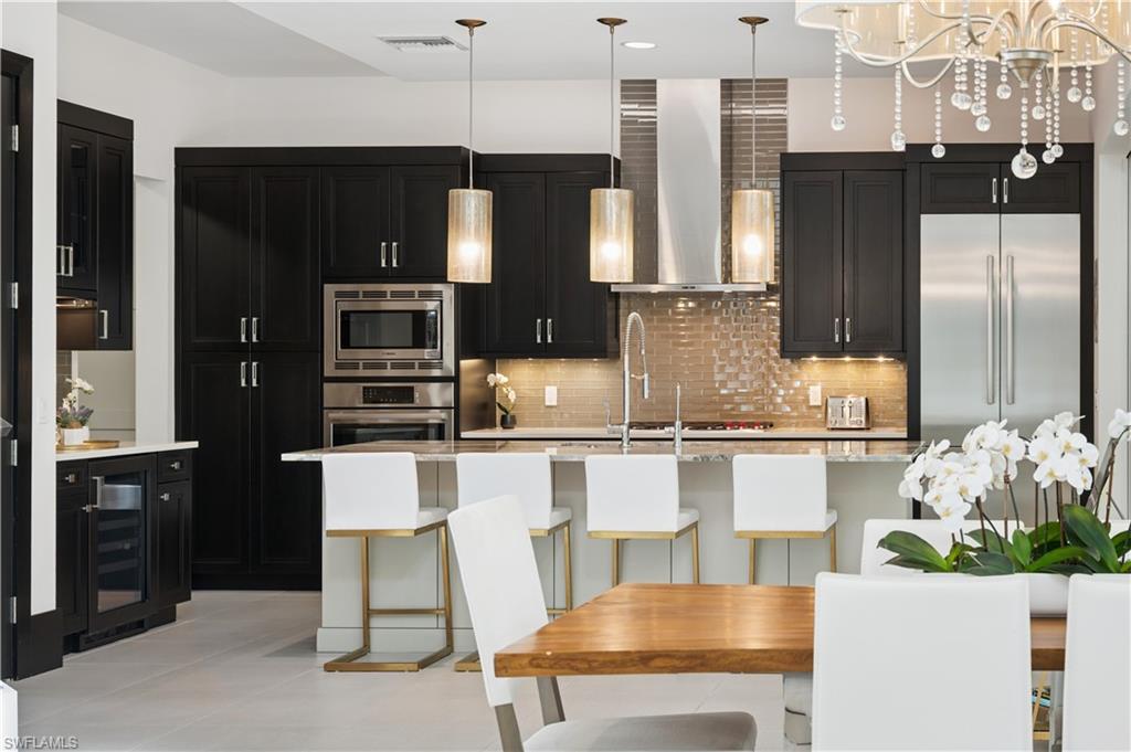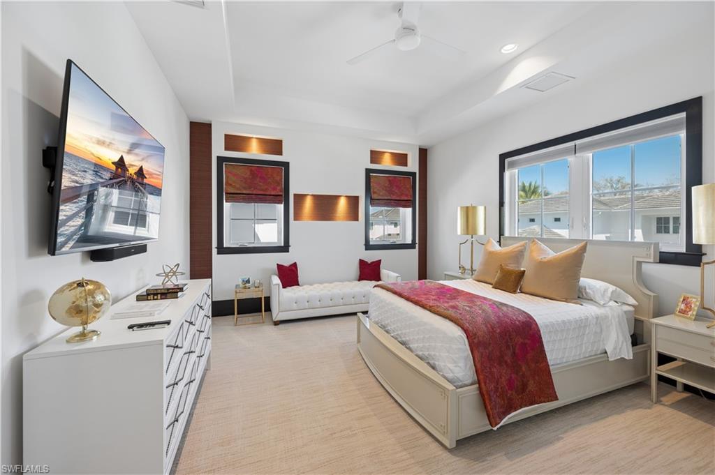 Positioned within The Residences at Mercato, this Lutgert-built coastal contemporary home offers 3 bedrooms plus a detached cabana with full bath, easily functioning as a fourth bedroom, along with 4 full and 1 half baths. The residence is offered fully furnished for immediate enjoyment. Soaring 24-foot ceilings define the main living and dining spaces, filling the home with natural light. A gas fireplace anchors the living room, adding warmth and architectural presence. The kitchen is appointed with a Wolf natural gas cooktop, premium Bosch appliances, wine bar, and a generous island designed for both daily living and entertaining. The main-level primary suite offers a private retreat. Full smart-home automation, motorized window coverings, Sonos sound system, decorator-inspired lighting, television and ceiling fans throughout, and a Kinetico whole house water treatment and filtration system provide luxury features for your ultimate comfort and convenience. Outdoor living centers around a private courtyard featuring a heated saltwater plunge pool, an air-conditioned and heated lanai with outdoor kitchen, and a second gas fireplace that enhances the year-round outdoor living experience. The detached cabana suite, complete with full bath and private sliders, functions seamlessly as a guest residence, office, fitness studio, or fourth bedroom. Just steps from your door, Mercato offers award-winning dining, upscale boutiques, cafés, Whole Foods Market, a luxury cinema, and a Pilates studio, with vibrant nightlife all within effortless reach. Experience the energy of Naples’ most dynamic district, just minutes from Vanderbilt Beach and The Ritz-Carlton.