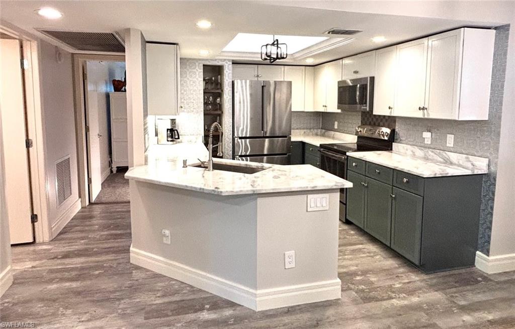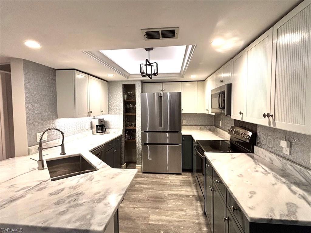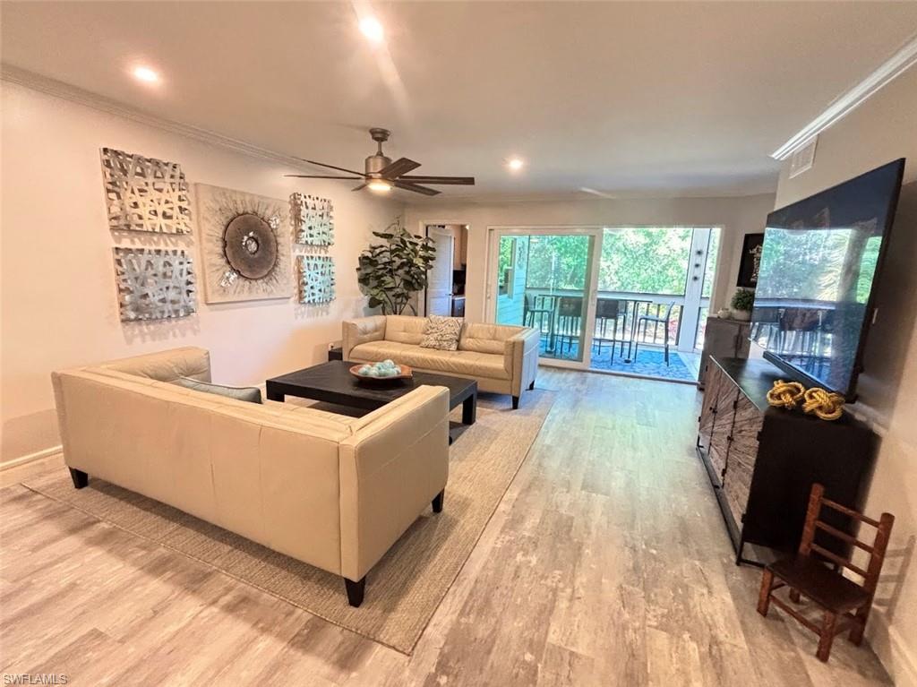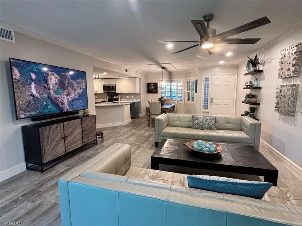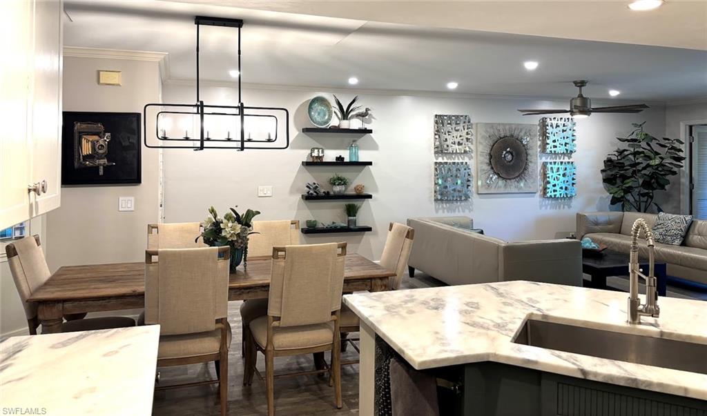 Impeccably maintained and move-in ready, this beautifully renovated first-floor condominium offers effortless living with no stairs and a refined coastal feel throughout. Featuring two spacious bedrooms, a dedicated office nook, and two fully updated bathrooms with walk-in showers, this residence combines comfort, functionality, and style. The home has been meticulously cared for and enhanced with all-new hurricane-impact windows and sliders installed in 2022, providing both peace of mind and abundant natural light. The open-concept floor plan captures serene water views and exceptional privacy from the rear of the unit, creating the perfect setting for relaxing mornings or entertaining guests. Recent upgrades include wood-grain luxury vinyl flooring in the main living areas, plush carpeting in the bedrooms, crown molding, decorative lighting and ceiling fans, an updated A/C system, a stackable washer and dryer, granite countertops, and a charming farmhouse sink in the kitchen. Located within The Colony at Wiggins Bay, a boutique three-building enclave with its own private pool just steps from the unit, residents enjoy both intimacy and convenience. The larger Wiggins Bay community is gated and secured 24 hours a day. Within the gates, the Tarpon Cove Yacht & Racquet Club offers optional membership opportunities featuring tennis, bocce, fitness facilities, waterfront dining and tiki bar, a club pool with towel service, and a boat shuttle to the beach. For boating enthusiasts, the Wiggins Bay Dock Owners Association provides dock slips available for lease or purchase, subject to availability. This is a rare opportunity to own a refined, low-maintenance coastal retreat in one of Naples’ most desirable gated communities.