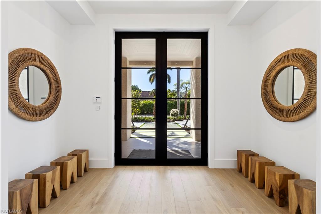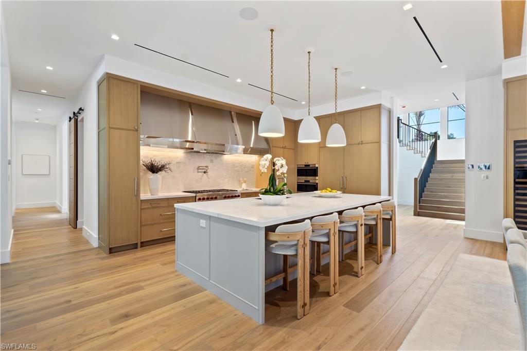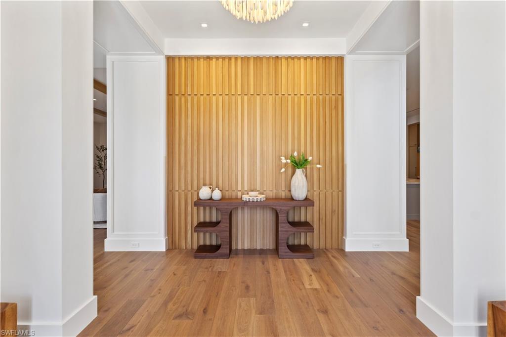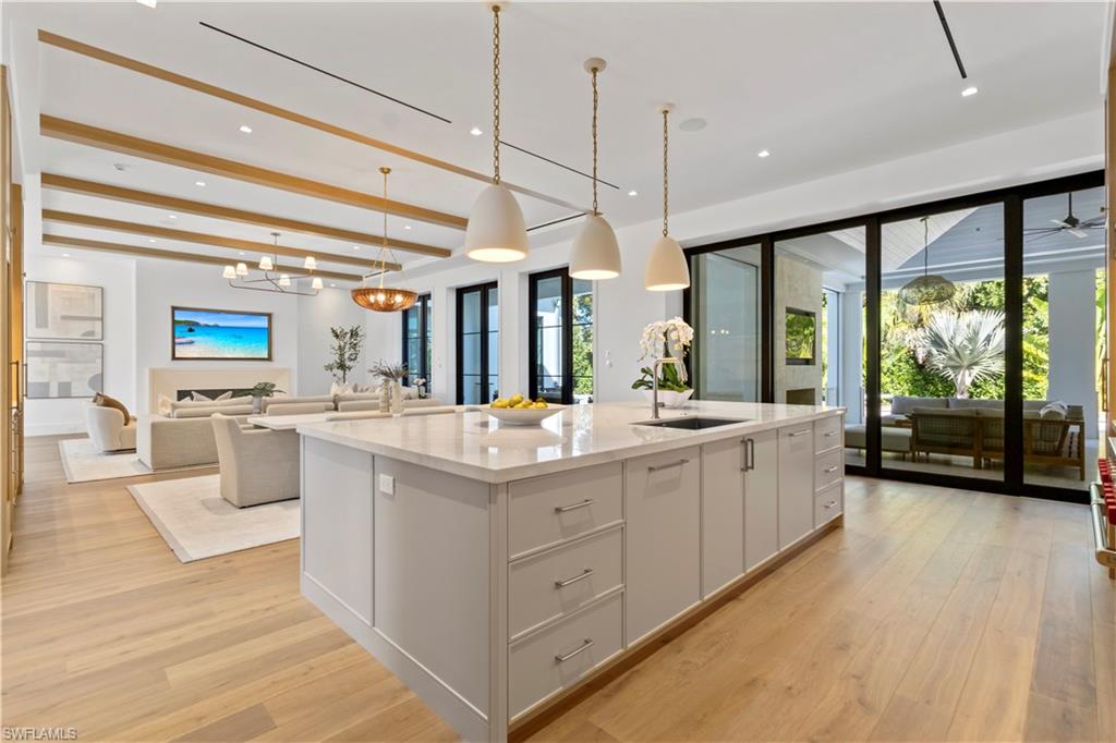Welcome to refined coastal luxury within this brand new home, thoughtfully positioned in the heart of the Coquina Sands neighborhood just blocks from the Gulf beaches and the new Four Seasons Resort. This five-bedroom, five-and-a-half-bath residence masterfully fuses timeless architecture with the finest finishes and seamless indoor-outdoor living, creating an effortless extension of your lifestyle to the outdoors. The great room serves as the perfect gathering space and is anchored by a custom fireplace and abundant natural light through impressive floor to ceiling windows. The gourmet chef’s kitchen is a true culinary masterpiece, highlighted by a full width custom fabricated stainless steel exhaust hood, a generous central island ideal for casual dining and entertaining, and a well appointed butler’s pantry that adds both convenience and elegance for effortless hosting. A striking front entry with White Coral Stone cladding delivers an unforgettable first impression, while custom Cumaru wood-wrapped detailing accents the stairwell and great room windows, infusing the interiors with rich warmth, natural texture, and superior craftsmanship throughout. Outdoors, the resort-style 60-foot pool complete with a spacious sun deck, covered outdoor kitchen, and fireplace offers the ultimate private oasis for memorable gatherings or relaxed lounging. Expertly balancing great design with a highly functional layout, this stunning new construction home is perfectly suited for both entertaining and family living, delivering an unparalleled lifestyle in one of Naples most sought-after communities.