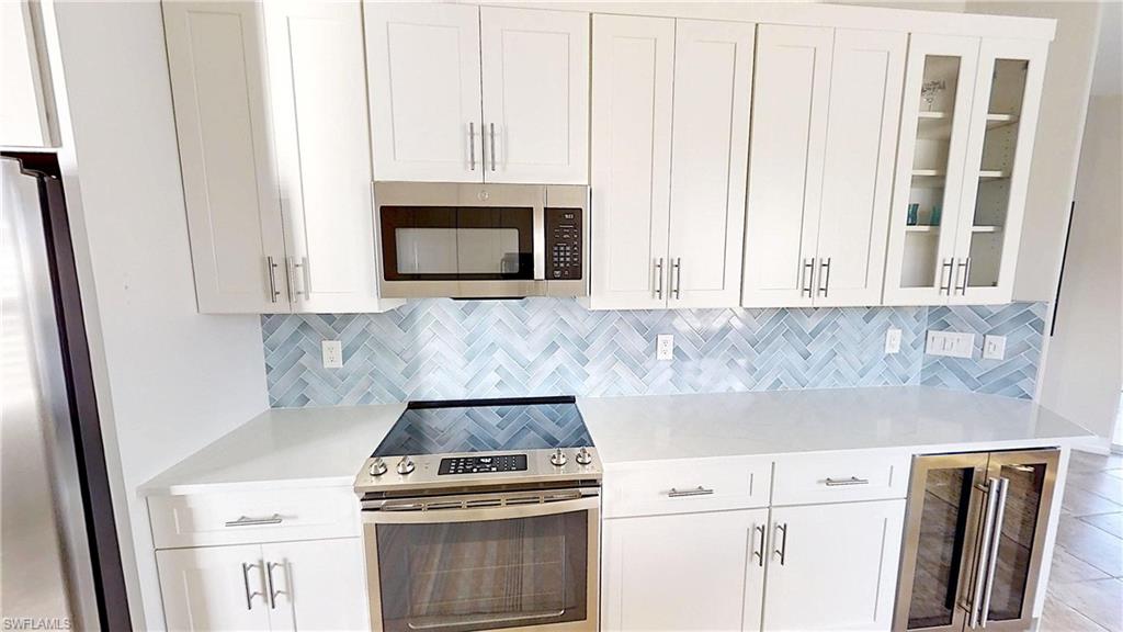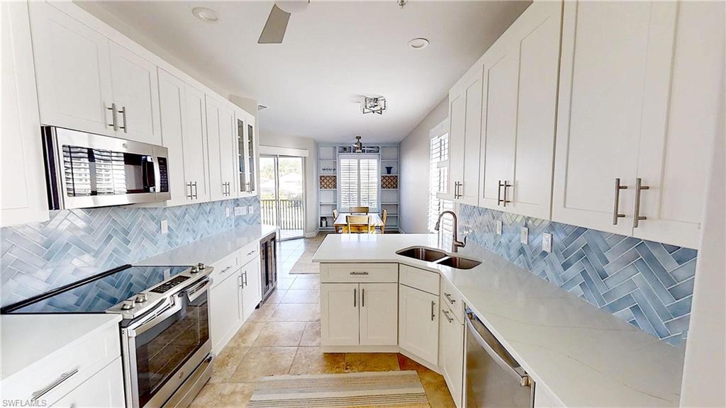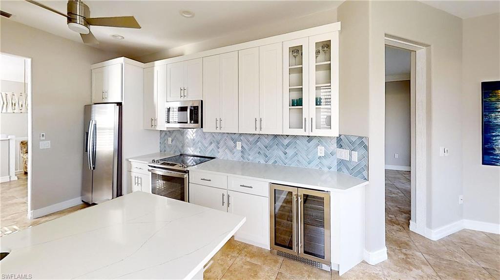 Rarely available 2-CAR GARAGE Tamarind floorplan! This impeccably maintained, move-in-ready Arielle residence blends comfort, style, and convenience in one of Naples’ most desirable communities. The partially furnished 3-bedroom, 2-bath home boasts a spacious 1,998 sq. ft. open floor plan with high-volume ceilings and abundant natural light streaming through three extra windows, unique to end units. The thoughtfully designed layout features a formal dining area, an eat-in kitchen, a gathering room with custom built-in cabinetry, and a generous living room—ideal for entertaining or unwinding. The gourmet kitchen has been tastefully updated with new cabinetry, quartz countertops, a designer backsplash, a deluxe wine cooler, and stainless steel appliances. The primary suite features an elegant, renovated bathroom with dual vanities, a seamless glass shower, and imported tile finishes. Additional highlights include a laundry room, newer AC, and a two-car attached garage with an exclusive 6x5 storage area unique to this floorplan. Enjoy picturesque views from the lanai, which features a Storm Smart electric hurricane shutter for added peace of mind. Residents can unwind at the nearby resort-style pool, spa, and cabana—making every day feel like a vacation. Pelican Marsh provides a vibrant, amenity-rich lifestyle in one of Naples’ premier gated communities, just minutes from Mercato, Waterside Shops, Shoppes at Vanderbilt, Artis Naples, and the area’s renowned white sand beaches. Enjoy access to 8 lighted Har-Tru tennis courts with pro shop and instruction, 6 lighted pickleball courts, 3 bocce courts with leagues and workshops, a state-of-the-art fitness center with trainers and spa services, and scenic walking and biking paths winding through more than 100 acres of preserves. An on-site restaurant provides weekly entertainment, while full-time social directors organize year-round events at the community center. Experience the best of Florida living in this nationally recognized, master-planned community. Schedule your private tour today and discover all this exceptional residence has to offer.
