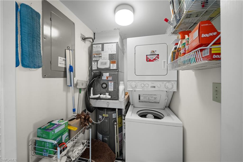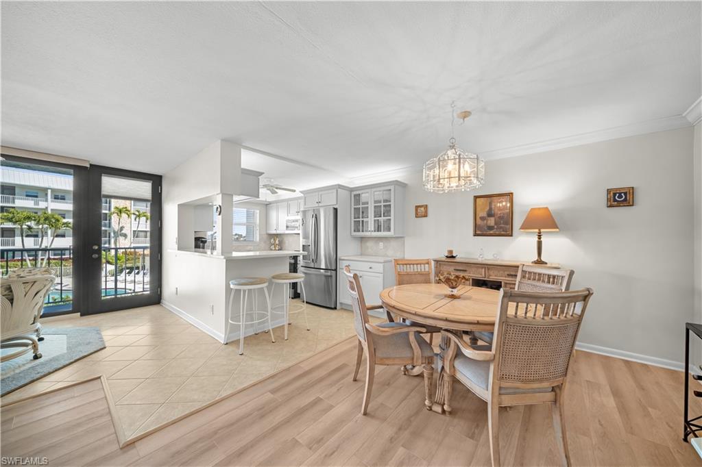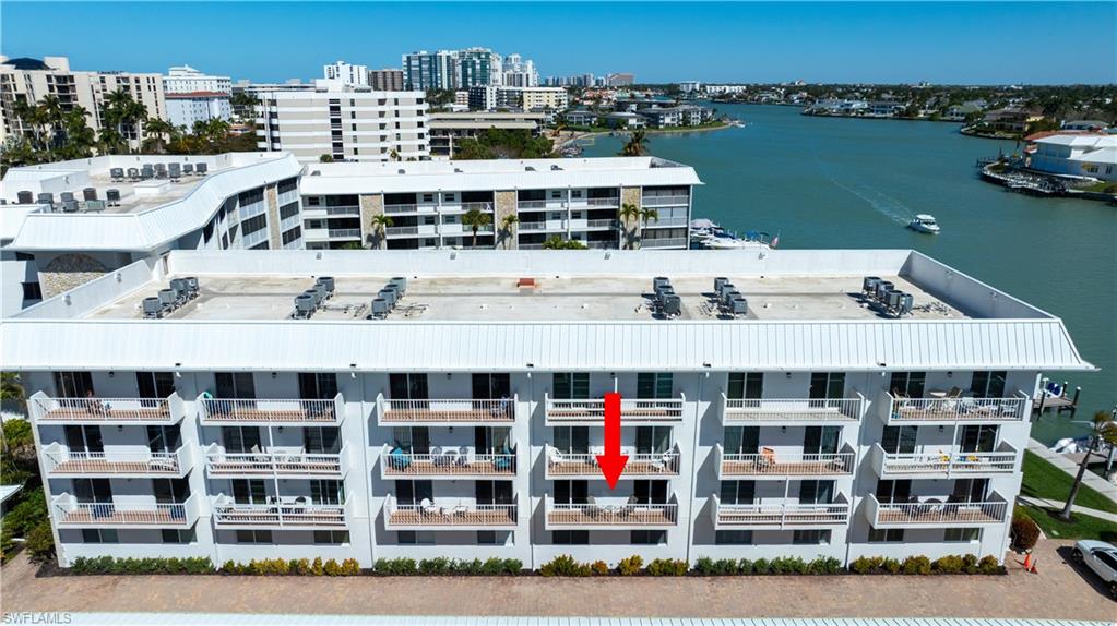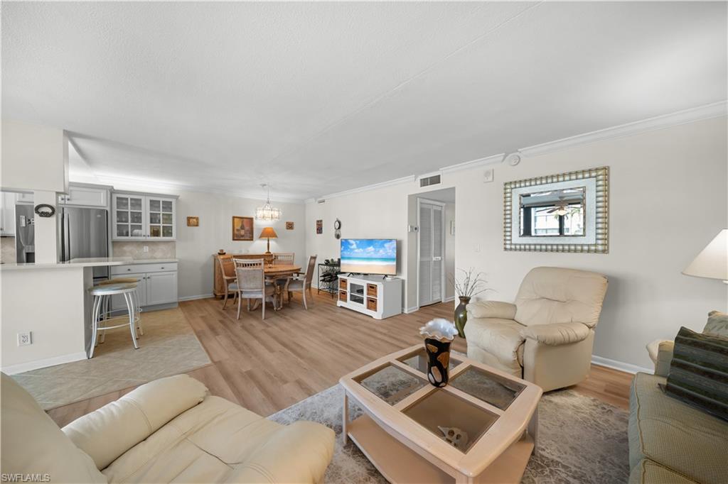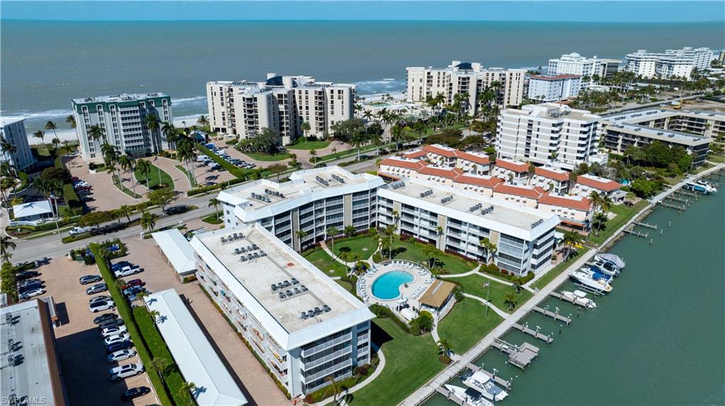 Beautifully updated residence located directly on the Bay and across from the Gulf of Mexico. This move in ready condo features an open concept floor plan with abundant natural light flowing from front to back of the unit. Impact resistant sliding glass doors frame water views and enhance both safety and efficiency, allowing you to enjoy your morning coffee overlooking the water and watching the dolphins frolicking in the bay without ever stepping foot outside your door. The updated kitchen includes brand new appliances and opens seamlessly to the living and dining areas, ideal for entertaining. The bedrooms offer access to a private balcony overlooking both the bay and the beach, ideal for watching the boats pass by. Additional features include in unit laundry, carport, and a private extra storage. The resort style pool is set on gorgeous grounds overlooking the water, surrounded by palm trees and lush tropical landscaping. The tiki hut host regular gatherings for residents and friends. At Harbour Cove every day will feel like the most relaxing vacation except this can be your home away from home. Boat and kayak slips are available for lease, providing convenient access to the water. Sidewalks along Gulf Shore Boulevard offer an ideal setting for walking and biking. The Village Shops and restaurants on Venetian Bay are within approximately one mile, with close proximity to downtown Fifth Avenue South and Mercato for additional dining, shopping, and entertainment. A true waterfront lifestyle opportunity in a prime Naples location.