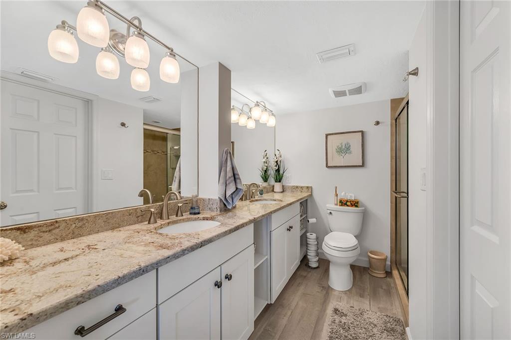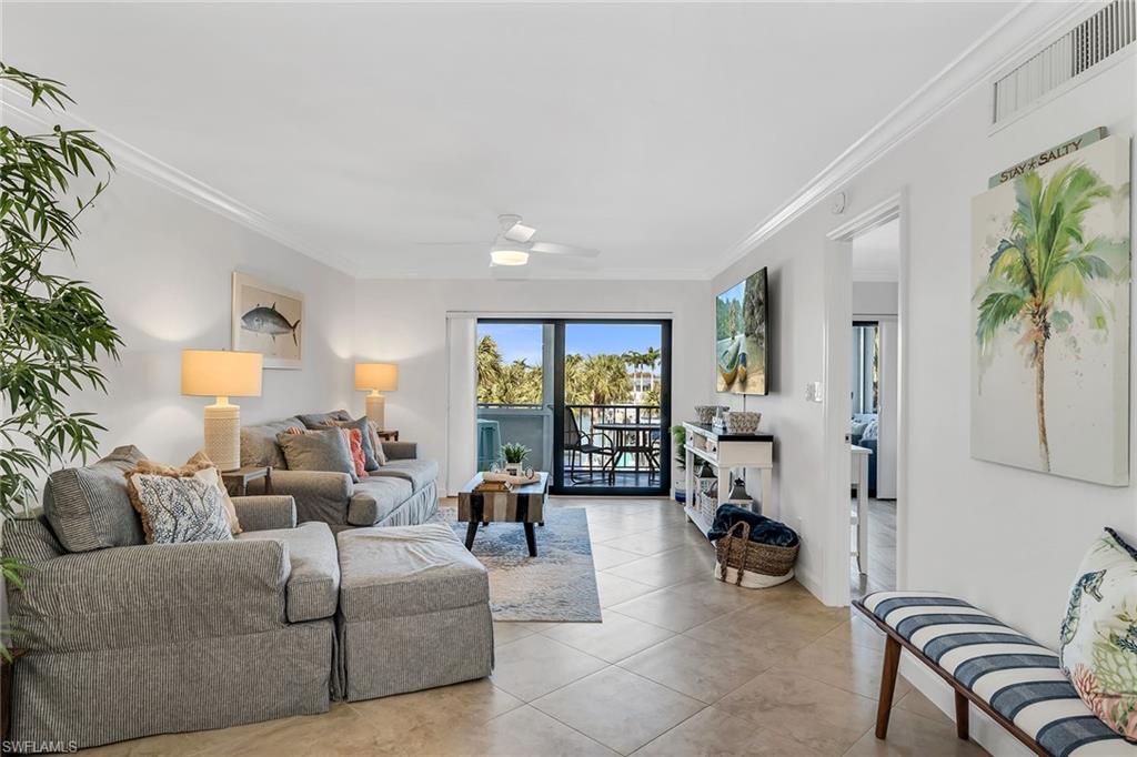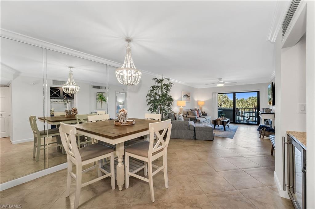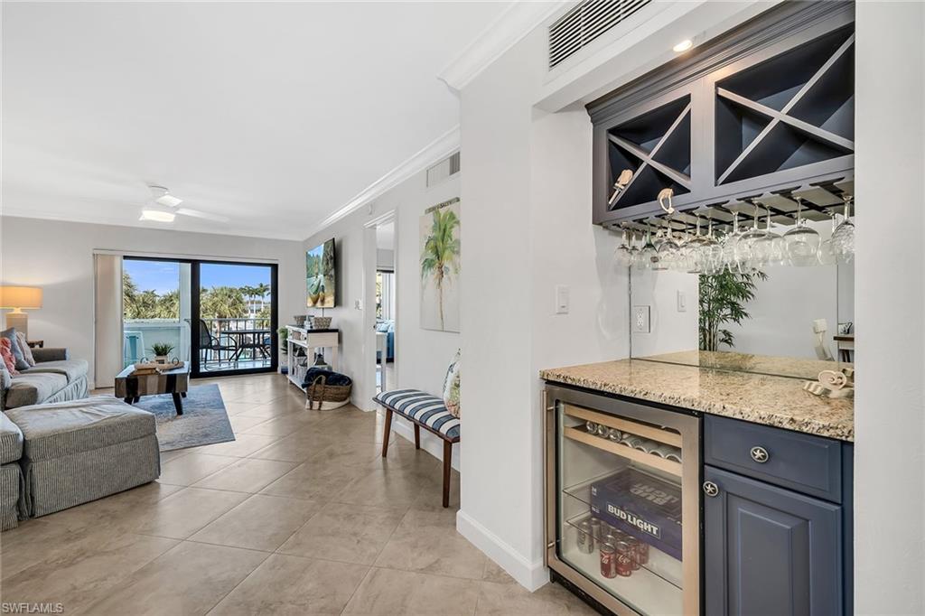 Remodeled and turnkey furnished with a fresh coastal design, this beautifully updated residence in the Moorings of Marco offers refined island living with tranquil water views. Thoughtfully reimagined with quality finishes and stylish appointments throughout, this two-bedroom, two-bath condominium presents an exceptional opportunity for effortless enjoyment, whether as a full-time residence, seasonal retreat or investment property. Light-filled interiors, elegant upgrades, and a spacious screened lanai create the ideal setting to relax and embrace the Marco Island lifestyle. Inside, diagonal tile flooring flows throughout the main living areas, complemented by crown molding and classic white plantation shutters that enhance the bright, coastal aesthetic. The inviting living room features a ceiling fan and glass sliders that open seamlessly to the tiled lanai, where a ceiling fan and peaceful water views provide an ideal backdrop for morning coffee or evening unwinding. Storm shutters offer added protection and peace of mind. The kitchen is beautifully appointed with granite countertops, a tile backsplash, cabinetry with glass-front uppers, under-cabinet lighting and a convenient bar counter for casual dining. Stainless steel appliances, including a range, dishwasher, refrigerator/freezer, and microwave, complete the space with function and style. Adjacent to the kitchen, the dining area is elevated by a custom mirror and a well-designed dry bar featuring a granite counter, under-counter beverage refrigerator, mirrored accents, and overhead cabinetry with dedicated wine and stemware storage, ideal for entertaining. The primary suite offers private lanai access through glass sliders and calming water views. Double doors lead to the en-suite bath, where a double granite vanity with full-width mirror, walk-in shower with floor-to-ceiling tile and glass enclosure, and a spacious walk-in closet with built-in shelving create a comfortable retreat. The guest bedroom includes a ceiling fan and is conveniently near the updated guest bath, appointed with a granite vanity and a walk-in shower with floor-to-ceiling tile and glass enclosure. Additional highlights include an in-residence laundry area with newer LG washer and dryer, overhead cabinetry for added storage, and a new water heater for enhanced efficiency and peace of mind. Community amenities include assigned covered parking, a sparkling pool with cabana area, bike storage, additional storage space, boat launch access and a convenient car wash station. Ideally just a short stroll to Caxambas Park & Marina and within a mile of dining and shopping, this residence is moments from Marco Island’s pristine beaches, boutique shopping, fine dining, parks, museums, golf courses and executive airport, offering the ideal blend of coastal luxury and an active waterfront lifestyle.