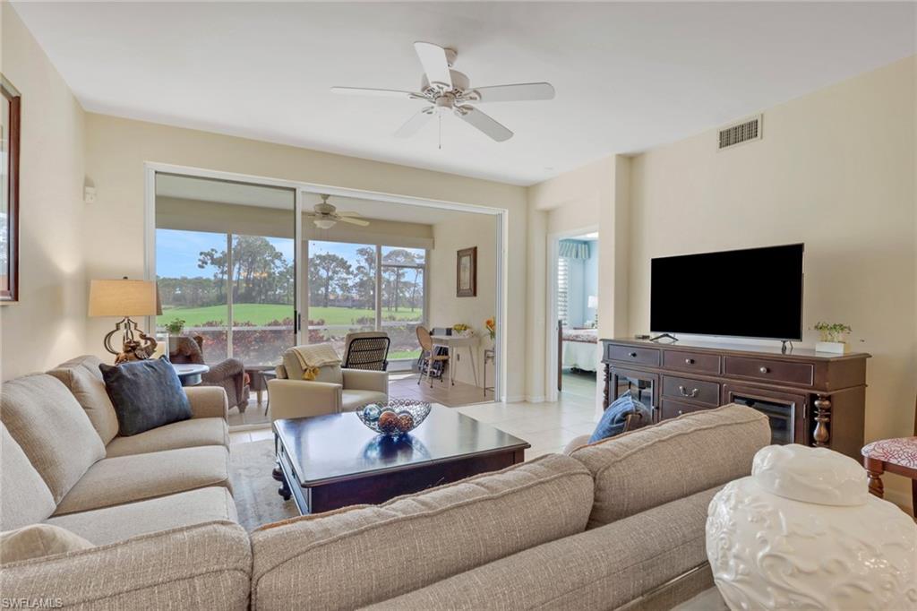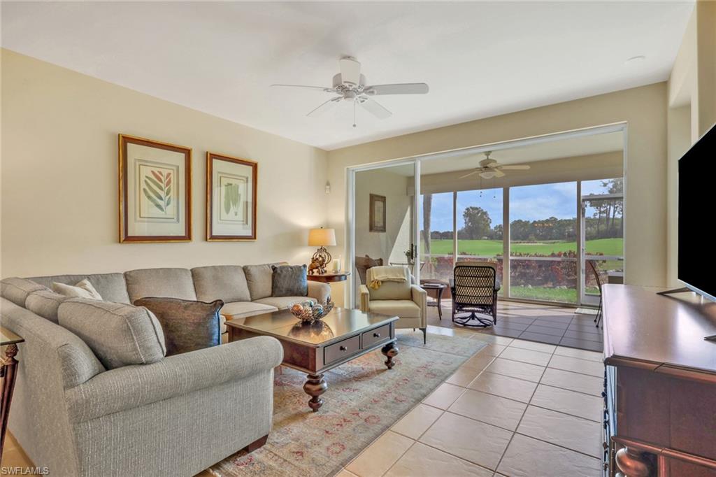 Welcome to this beautifully reimagined first-floor residence in the highly coveted community of Spring Run at The Brooks. This exceptional 2-bedroom, 2-bath condominium showcases sweeping golf course views and is offered turnkey with thoughtfully selected upgraded furnishings, making it truly move-in ready. Designed for effortless indoor-outdoor living, the screened lanai invites you to enjoy tranquil breezes and fairway views year-round, while sliding glass doors provide flexibility for cooler winter evenings. Inside, the home has been tastefully renovated with modern finishes throughout. Both bathrooms have been updated, and the designer kitchen is a standout feature, complete with a spacious gathering island, breakfast bar, upgraded cabinetry with pull-out drawers, and refined detailing ideal for both entertaining and everyday living. Additional improvements include a newer roof, hurricane impact windows, and a new AC motor, offering both comfort and peace of mind. Spring Run is a private bundled golf community, and ownership includes two golf memberships with cart fees only. Residents enjoy a newly expanded and renovated clubhouse featuring fine dining, indoor and outdoor bars, a resort-style pool, lighted tennis and bocce courts, pro shop, fitness center, and library. Optional memberships are available to the private beach club, fitness and spa center, and The Rookery restaurant. This active and financially sound community offers an impressive calendar of social events and amenities. Ideally located just 20 minutes from Southwest Florida International Airport and the Gulf beaches, and within walking or biking distance to Coconut Point Mall for premier shopping, dining, and entertainment. Experience the lifestyle. Schedule your private showing today.