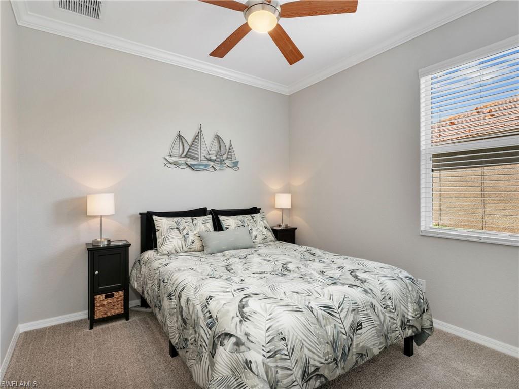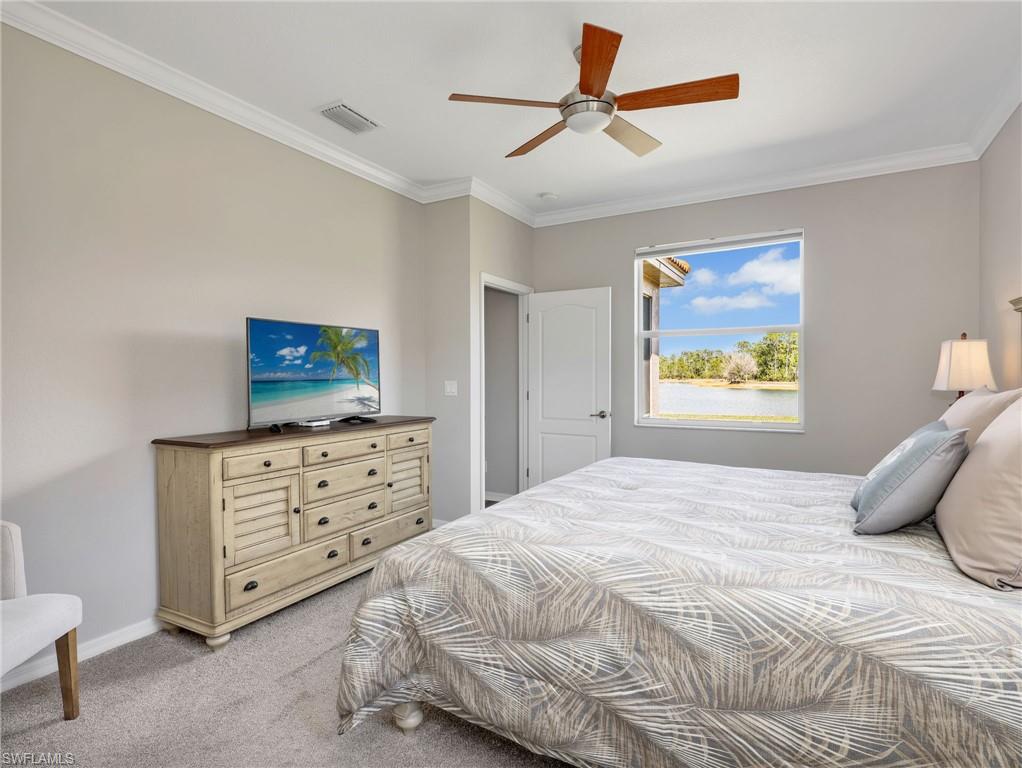 Lowest priced single family home located in the premier gated community of Bella Terra, located in Estero, FL. This immaculately maintained 3 bedroom, 2 bathroom property at 21187 Bella Terra Blvd offers 1,677 sq. ft. of living space with stunning lake and preserve views. The corner lot allows for extra space between properties- a benefit for those wanting a gated community lifestyle with a little extra space. This open concept Capri floor plan, features include high volume ceilings, luxury vinyl flooring, and a kitchen with an eat in breakfast area. The primary suite includes dual walk in closets and an en-suite bathroom with a separate tub and shower. Notable upgrades include custom storage and FLEXCore flooring in the 2 car garage. Bella Terra is a gated community off the Corkscrew corridor offering resort style amenities including a clubhouse, pool, fitness center, and courts for pickleball and tennis, all with low HOA fees. This Estero real estate gem is ideally situated in Southwest Florida near Coconut Point Mall, Miromar Outlets, Gulf Coast Town Center, beaches, boating, entertainment and RSW Airport, offering the best of Southwest Florida living.