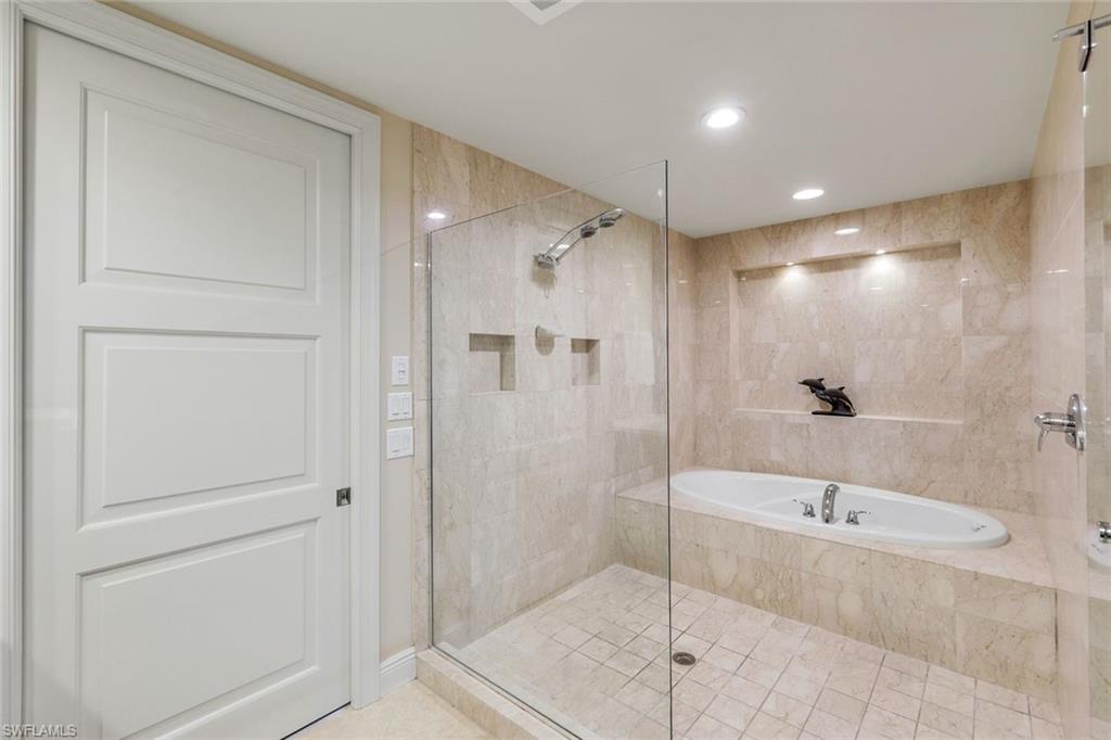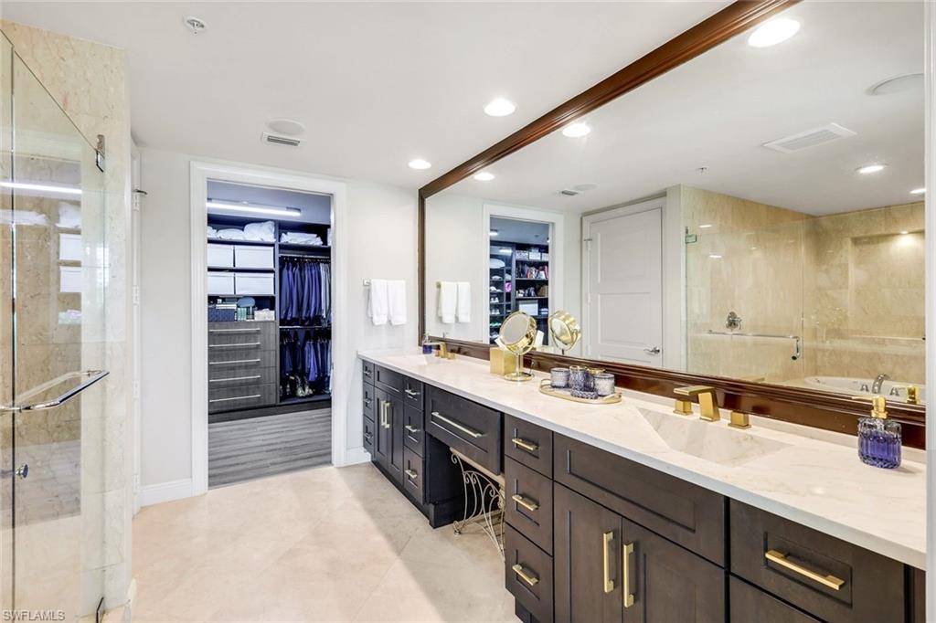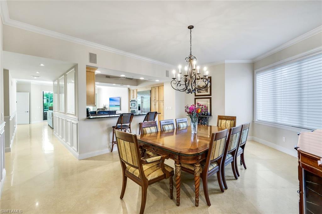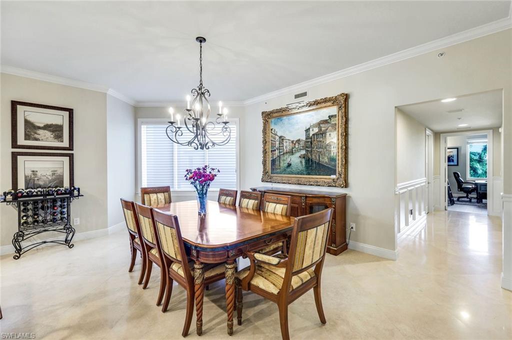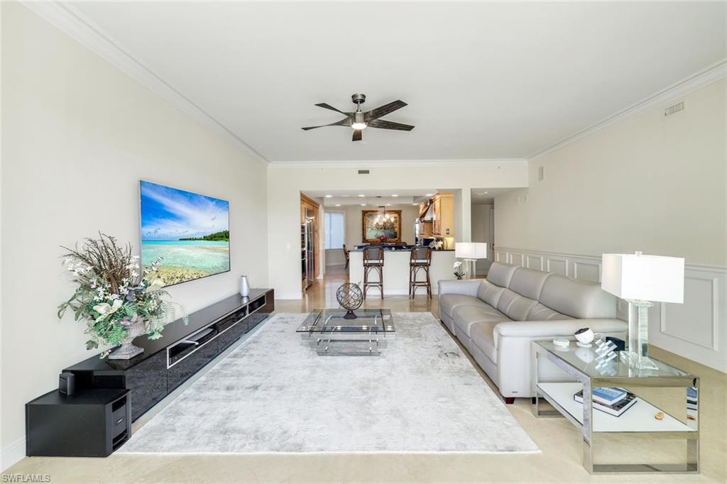 Positioned within prestigious Grande Geneva at The Dunes of Naples, this furnished ground-floor residence blends timeless elegance with expansive design and effortless resort-style living. Spanning 2,798 square feet, this three-bedroom, three-bath home offers a sophisticated coastal retreat with seamless access to exceptional amenities just beyond your lanai. A grand double-door entry and refined finishes set the tone for understated luxury. Inside, an expansive layout unfolds beneath crown molding and architectural detailing, including traditional raised panel wainscoting that adds depth and character. Marble flooring flows throughout the main living areas and bathrooms, enhancing the sense of scale while creating a polished aesthetic, while the bedrooms are appointed with luxury vinyl flooring for both comfort and durability. The gourmet kitchen is both functional and striking, featuring warm maple cabinetry, gleaming granite countertops, a built-in wine cooler, gas range with professional vent hood, built-in wall oven, and high-end refrigerator. A tray ceiling with soft cove lighting casts a warm ambient glow, elevating the space with subtle architectural detail. The owner’s suite is a serene sanctuary with a custom boutique-style walk-in closet featuring floor-to-ceiling built-ins. The spa-inspired primary bath offers an expansive dual vanity with designer gold fixtures, a full-width framed mirror, and an oversized glass-enclosed shower integrated with a soaking tub, creating a refined space designed for relaxation. Two additional guest bedrooms provide comfort and privacy, with one including its own private ensuite bath. Modern enhancements include newer HVAC systems, a newer hot water heater, and Bose surround sound hardwired throughout the main living areas and primary suite. French door sliders open to a screened lanai where this residence truly distinguishes itself. As a rare ground-floor offering, you step onto your own private terrace before enjoying direct walk-out access to the resort-style pool, spa, and community room. The seamless indoor-outdoor flow allows you to stroll to the amenities just steps from your door while maintaining the privacy of your own outdoor retreat. Residents of Grande Geneva enjoy a fitness center, pool and hot tub, grilling areas, and welcoming social spaces. Ownership includes access to The Club at The Dunes, featuring a spectacular resort-style pool, Tiki bar, upscale dining, state-of-the-art fitness center, and active tennis and pickleball programs. Also included is transferable membership to the exclusive Floridian Beach Club, providing private access to Vanderbilt Beach with a beachfront pool, restaurant, indoor and outdoor seating, attentive beach services, and private shuttle service from lobby to sand. Minutes from world-class shopping, fine dining, and Southwest Florida International Airport, this distinguished residence captures the essence of refined Naples living.