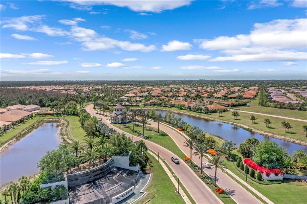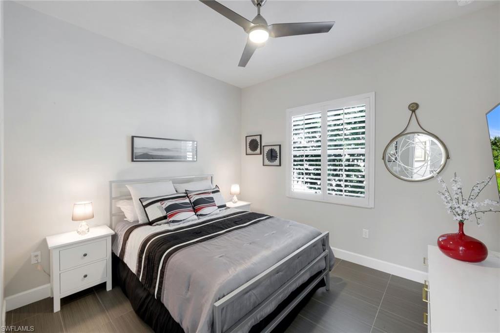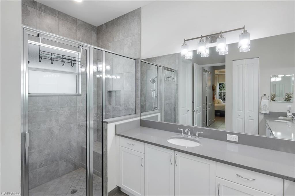 Welcome Home to the most amazing Southern Exposure in this Beautifully upgraded Cabernet model in Valencia Bonita. This fantastic wide-open great room floor plan is designed for effortless living and entertaining, offering 2,196 sq. ft. of refined interior space with 3 bedrooms+ Den, 2 Baths, and an insulated 2½-Car Air-Conditioned Garage with room for two vehicles plus a golf cart or hobby space. A rare 12’ x 7’ air-conditioned interior storage room provides exceptional, thoughtfully designed bonus space. Enjoy Resort living with the GOLF CART CONVENIENCE. High-end finishes are showcased throughout, including 12” x 24” premium plank tile flooring, designer curated lighting and window treatments, detailed tray ceilings, and crown molding. The open-concept great room flows seamlessly into a gourmet natural gas kitchen featuring quartz countertops and backsplash, upgraded appliances, soft-close cabinetry with pull-out shelving, breakfast bar, and casual dining area—perfect for everyday living and hosting guests. A custom entertainer’s beverage bar with built-in cabinetry and wine refrigerator adds style and function, along with a beautifully designed dining area ideal for gathering with family and friends. Step outside to your expanded screened lanai and private outdoor retreat showcasing panoramic screening, travertine decking, and a heated saltwater pool with spa jets and dual waterfalls. The generous outdoor living space extends your home for year-round enjoyment and includes a pre-plumbed gas line for a grill or future outdoor kitchen. A spacious screened front entry creates a warm and welcoming arrival for guests. Additional upgrades include a tankless water heater, whole-house water treatment system, whole-home fresh air purification system, landscape lighting, and custom primary closets, additional steel shelving in the air-conditioned garage, plantation shutters, custom mirrors, designer light fixtures and custom window treatments, Valencia Bonita offers a 45,000 sq. ft. clubhouse and lifestyle complex across 10 acres of amenities including tennis, pickleball, bocce, multiple resort-style pools, lap and resistance pools, state-of-the-art fitness center, indoor and outdoor dining, fire pits, cabanas, full-service spa and nail salon, pottery studio, 50+ social clubs, and a full-time lifestyle director. HOA fees include Xfinity cable and internet. No CDD. Natural GAS community. This home is TRULY A DREAM for someone who has a hobby and needs extra air-conditioned workspace or the owner who wants the most amazing closet space (shoes, handbags, crafting, art studio, workspace or simply exceptional organized storage) Live the ultimate Florida dream with a short drive to the beach and less than 30 minutes to RSW airport.
