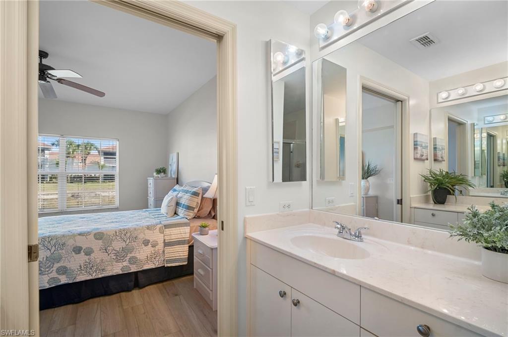 Welcome to your light and bright retreat in Bridgewater Bay, one of North Naples’ most inviting gated communities. This first-floor, two-bedroom, two-bath condominium has been thoughtfully updated with all-new flooring throughout the entire home, creating a fresh and cohesive feel from room to room. Step inside to an open, airy layout that maximizes natural light and easy flow between the living spaces. The updated flooring enhances the sense of space and brightness, perfectly complementing the neutral palette. The living area is ideal for both relaxing and entertaining, with a direct connection to a screened lanai — a perfect spot for morning coffee or an evening breeze. Both bedrooms offer generous space and privacy, with the primary suite featuring its own full bath, double vanities and a large walk-in closet. The second bedroom is comfortably sized and adjacent to the guest bath, making the layout ideal for guests and/or as a home office. Meticulaously maintained and oferred furnished, this residence is truly move-in ready and equiped with kitchen necessities. An in-unit laundry and single-car garage also provide additional extra space for storage, perfect for beach chairs and umbrellas. Living in Bridgewater Bay means enjoying resort-style community amenities just steps from your door. Residents have access to a newly renovated 36,000-square-foot clubhouse with a fitness center, sauna, social rooms, library, multiple swimming pools including a lap pool; tennis, pickleball, Playground, bocce and basketball courts; and well-manicured walking paths around scenic lakes. It’s a community designed for an active, social, and relaxed Florida lifestyle. Located in the heart of Naples, you’re just minutes from premier shopping, dining, and sugar-sand beaches, making this condo not only a lovely home but a central gateway to everything Southwest Florida has to offer.