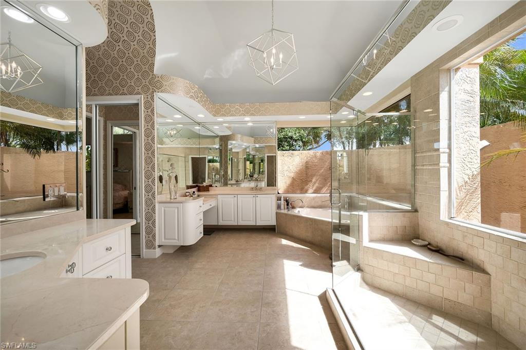 Set within the desirable Longlake enclave of Pelican Landing, this light-filled residence captures private tropical landscape views and effortless Florida living with spacious screened lanai, expansive pool and three-car garage. Designed for entertaining and everyday comfort, the home offers three bedrooms, two-and-a-half baths, and seamless indoor-outdoor flow enhanced by multiple French doors and expansive glass sliders. The covered outdoor living area features dual ceiling fans and overlooks the sparkling pool framed by lush, mature landscaping, creating a serene and secluded setting for relaxed afternoons or evening gatherings. A welcoming French door entry with transom window opens into the foyer and flows directly into the impressive great room, where a stunning chandelier and vaulted ceilings elevate the space. Glass sliders with transom windows invite abundant natural light indoors and connect effortlessly to the lanai. Diagonal tile flooring, white plantation shutters, and plentiful windows throughout create a bright, airy ambiance. The formal dining area is elegantly appointed with a bay window featuring an arched transom, chandelier, decorative wall trim, and a custom mirror for added sophistication. The kitchen blends functionality and style with granite countertops, stainless steel appliances, including a cooktop, wall oven, dishwasher, refrigerator/freezer, and under-counter microwave, along with an island featuring a bar counter for casual seating. A convenient pass-through window to the lanai enhances entertaining, while the adjacent dining area offers recessed lighting and a French door providing direct outdoor access. The family room showcases transom windows, vaulted ceilings and charming built-in shelving with a window bench, creating a cozy yet open retreat. The primary suite is a private sanctuary with glass sliders to the lanai and a spa-inspired bath designed as a tropical retreat overlooking a secluded courtyard through panoramic windows. Two mirrored-door closets provide ample storage, while the bath features dual vanities with a full-width mirror and makeup counter, a large walk-in shower with bench and glass enclosure, and a separate jetted soaking tub. Two guest bedrooms with ceiling fans are near a full bath with dual sinks and a shower-tub combination with glass enclosure, also serving as a convenient pool bath. A generously sized walk-in closet with shelving is off the hallway, and a powder bath adds further convenience for guests. Residents of Pelican Landing enjoy a premier lifestyle with championship golf (membership waitlist), private beach access, nature trails, kayak waterways, and tennis and pickleball. Just minutes from Gulf beaches and the shopping and dining of Mercato and Fifth Avenue South, this home offers exceptional privacy and convenience.