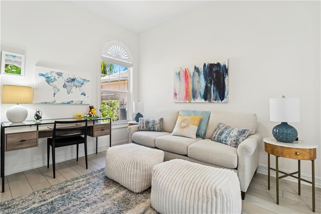 "Transitional Contemporary Living"...Take a look at this beautifully appointed home located in one of Grandezza Country Club's most sought - after neighborhoods, Saraceno. Blending transitional style with contemporary updates, this home offers a fully renovated modern open-concept design and a lush salt water pool and spa area that creates a truly private and tranquil setting. Inside this meticulously kept 3 bedroom, 2 bathroom home, you'll find thoughtful updates throughout. The redesigned kitchen features a large center island, all new appliances, quartz countertops, with modern cabinetry. New flooring flows seamlessly through the home, leading to an oversized primary suite with a remodeled shower, dual sinks and a soaking tub. With over 2000 sqft, this spacious layout is ideal for entertaining and includes a versatile flex room, perfect for an office or additional guest space. The screened salt water pool and spa area overlooks a peaceful preserve, offering a private outdoor retreat for relaxing or hosting. Additional upgrades include, new roof (2023), new HVAC system, salt-converted pool with new heater and pump, electric hurricane shutters, epoxy-finished 2-car garage flooring, and all new landscaping -making this an easy, move-in ready choice for the Buyer seeking style, comfort, and convenience. Grandezza Country Club offers 18 hole Championship Golf, tennis courts, fitness/wellness center, along with formal/causal dining and many social activities. Grandezza is minutes from SWFL International Airport, FGCU, I-75, shopping and restaurants.