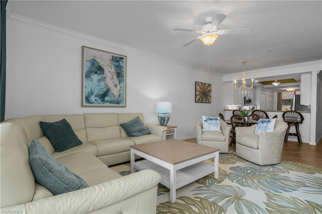 Welcome to 9518 Avellino Way #2312 in Treviso Bay, one of Naples, Florida’s most sought-after resort-style communities. This beautifully maintained first-floor veranda offers 2 bedrooms plus a den, 2 full bathrooms, and 1,414 square feet of thoughtfully designed living space, complete with a social membership and being offered furnished for immediate enjoyment of the Southwest Florida lifestyle. From the moment you step inside, you’ll appreciate the light, coastal design and open layout that makes this home feel both spacious and inviting. The white and bright upgraded kitchen serves as the heart of the home, featuring modern finishes, abundant cabinetry, and a seamless flow into the dining and living areas—perfect for entertaining or relaxing after a day in the sun. Luxury vinyl flooring in the bedrooms and den adds durability and style, while the tasteful coastal furnishings create a move-in-ready retreat that embodies paradise living. The split-bedroom floor plan offers privacy for both owners and guests, and the versatile den provides ideal space for a home office, reading room, or additional guest accommodations. As a first-floor veranda, this residence also offers the convenience of easy access along with serene outdoor living. The rear screened lanai showcases beautiful lake and preserve views, delivering peaceful mornings, nature sightings, and a place to relax after a funfilled day. A front screened lanai provides an additional outdoor space to enjoy Florida’s year-round sunshine and gentle breezes. Treviso Bay is known for its unmatched amenities and vibrant lifestyle. With a social membership, residents enjoy access to the stunning Club Rilassare resort-style pool with waterfalls and lap lanes, poolside restaurant and bar, state-of-the-art fitness center, full-service spa, aerobics room, and an active social calendar filled with events and activities. The community also features tennis courts, pickleball courts, bocce ball, scenic walking and biking trails, and beautifully maintained grounds throughout. Dining options, gathering spaces, and a true sense of community make Treviso Bay one of Naples’ premier gated neighborhoods. Located just minutes from downtown Naples, Fifth Avenue South, white-sand Gulf beaches, shopping, dining, and entertainment, 9518 Avellino Way #2312 offers the perfect combination of luxury, comfort, and convenience. Whether you are searching for a full-time residence, seasonal retreat, or investment opportunity in Naples real estate, this furnished first-floor veranda in Treviso Bay presents an exceptional opportunity to live where others vacation.