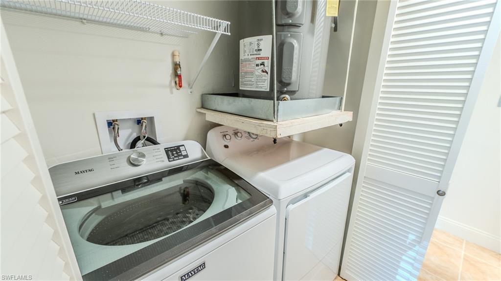 The Greens at Fountain Lakes is in one of the best locations in Lee County close to everything and across from Coconut Point This well kept and upgraded condo upstairs corner unit offers 2 bedrooms, 1 bathroom, and a large lanai. With ample storage and a bright & open floor plan, this condo lives very comfortably. Upgrades include tile flooring throughout, solid wood cabinets, granite countertops, stainless steel appliances, a new water heater (2021), in unit washer and dryer, a glass shower enclosure, and so much more. Situated on the back of the building, you'll enjoy privacy and a relaxing setting on your lanai. Community amenities include an executive 9 hole golf course, community pools, pickleball courts, tennis courts, bocce courts, shuffleboard courts, a well equipped gym, billiards room, and a playground. Situated in one of the most desirable locations in Southwest Florida you're close to Coconut Point Mall, Miromar Outlets, Bonita Beach & Lovers Key State Park, RSW International Airport, and so much more. Water & sewer is included in the HOA dues.