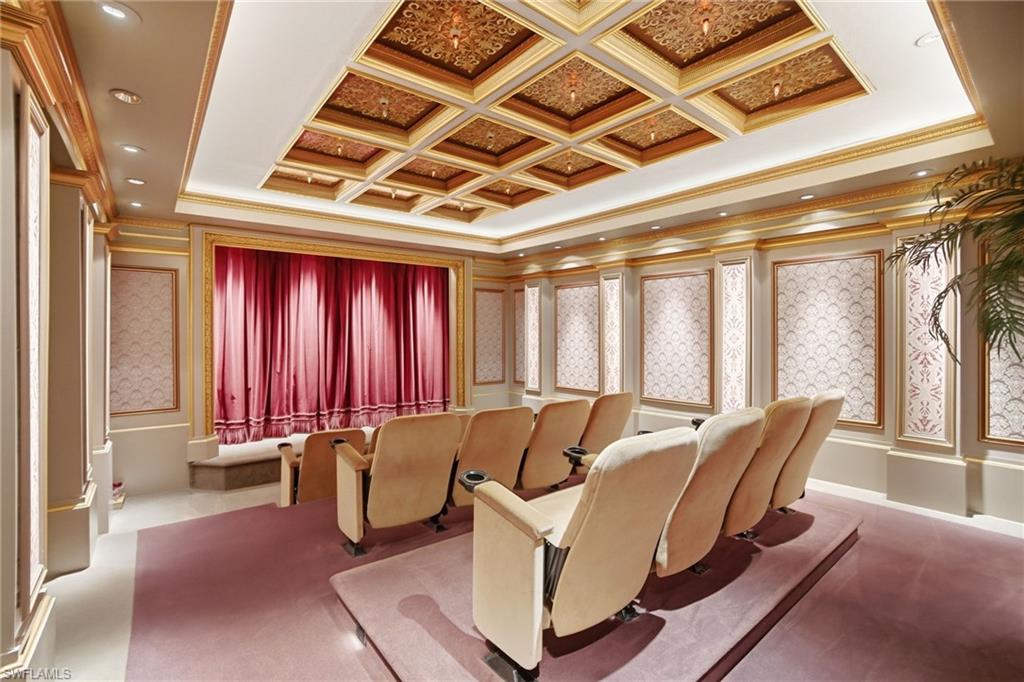 Experience true luxury living on one of the most premier lake and golf course homesites in all of Quail West. Perfectly positioned to capture sweeping water and fairway views, this exceptional estate offers an unparalleled Southwest Florida lifestyle defined by privacy, elegance, and extraordinary outdoor living. This expansive residence features 5 bedrooms, all ensuite, 1 dedicated office, 1 additional full bath, 1 additional half bath, and multiple gathering spaces designed for both grand entertaining and everyday comfort. Enter through handcrafted double doors into a dramatic foyer highlighted by marble flooring, soaring coffered ceilings, and a striking fireplace anchoring the grand salon. Floor-to-ceiling windows frame tranquil lake and golf course views, seamlessly blending indoor and outdoor beauty. The chef’s kitchen is both functional and refined, showcasing a gas range, prep island with sink, rich wood ceiling detail, and effortless flow into the inviting family room with zero-corner sliders opening completely to the outdoor living areas. A formal dining room and adjacent wet bar create an ideal setting for elegant evenings. The main-floor primary suite is a private retreat featuring a spacious sitting area, beverage center, spa-inspired bath with jetted tub and multi-head shower, dual walk-in closets, and a dedicated fitness space. A first-floor theater room that transports you back in time provides a nostalgic and immersive cinematic experience, offering yet another exceptional entertaining venue for family and guests. Upstairs, a loft-style game lounge with wet bar and two additional guest suites with private balcony access create the perfect environment for hosting extended family or large gatherings with ease. The outdoor living experience is truly extraordinary — a beautifully screened lanai with wood ceiling, outdoor kitchen, heated pool and spa, multiple private patio areas, and a stunning portico with sunken seating and fireplace overlooking the lake. A spiral staircase leads to an upper balcony ideal for sunset views and evening stargazing. A negotiable and nearly immediate transferable golf membership is available at Quail West Golf & Country Club, allowing the next owner to step seamlessly into one of Naples’ most prestigious golf lifestyles. This is more than a home — it is a legacy property and architectural masterpiece within one of Southwest Florida’s most distinguished communities.