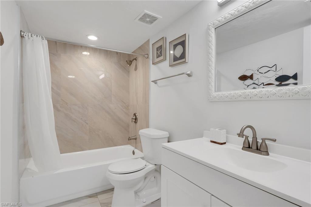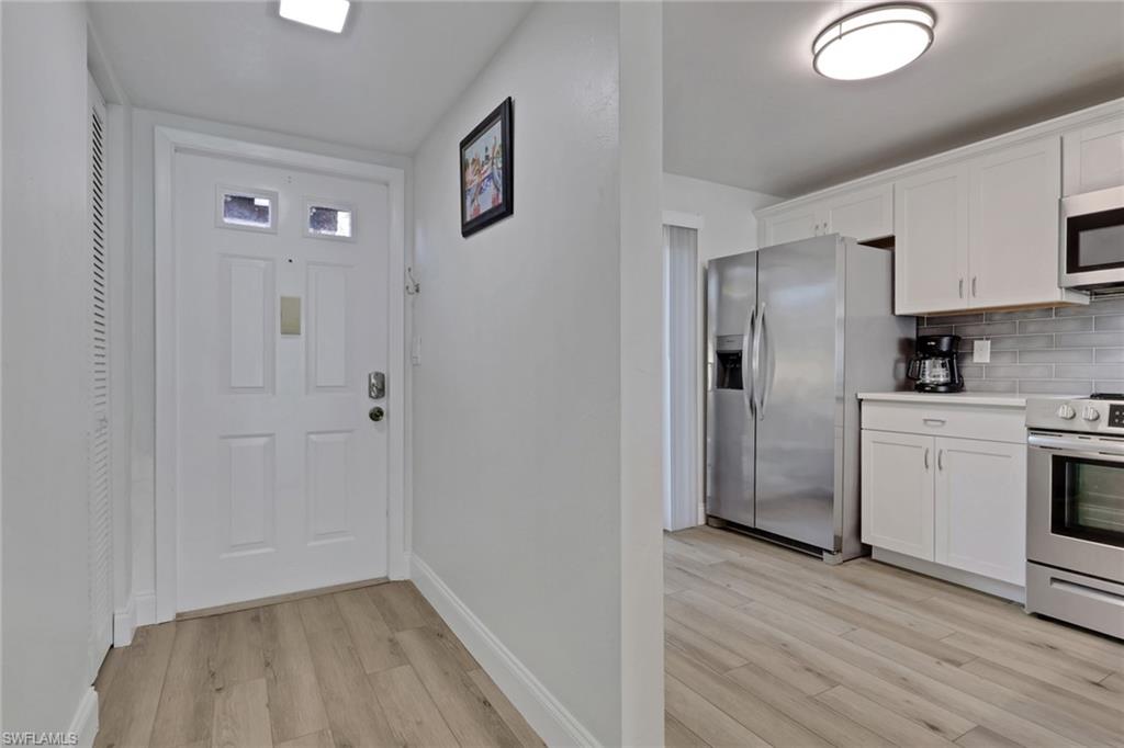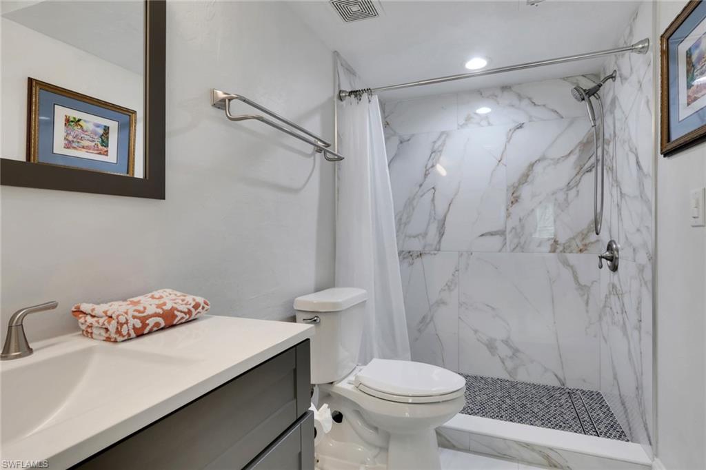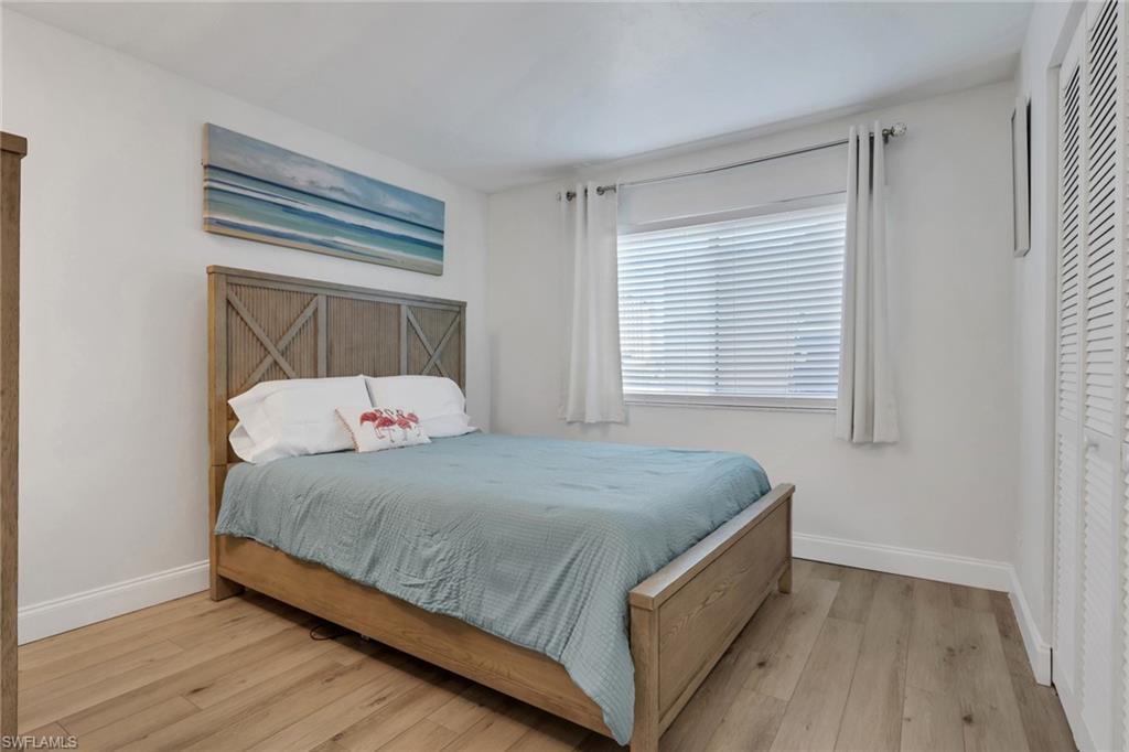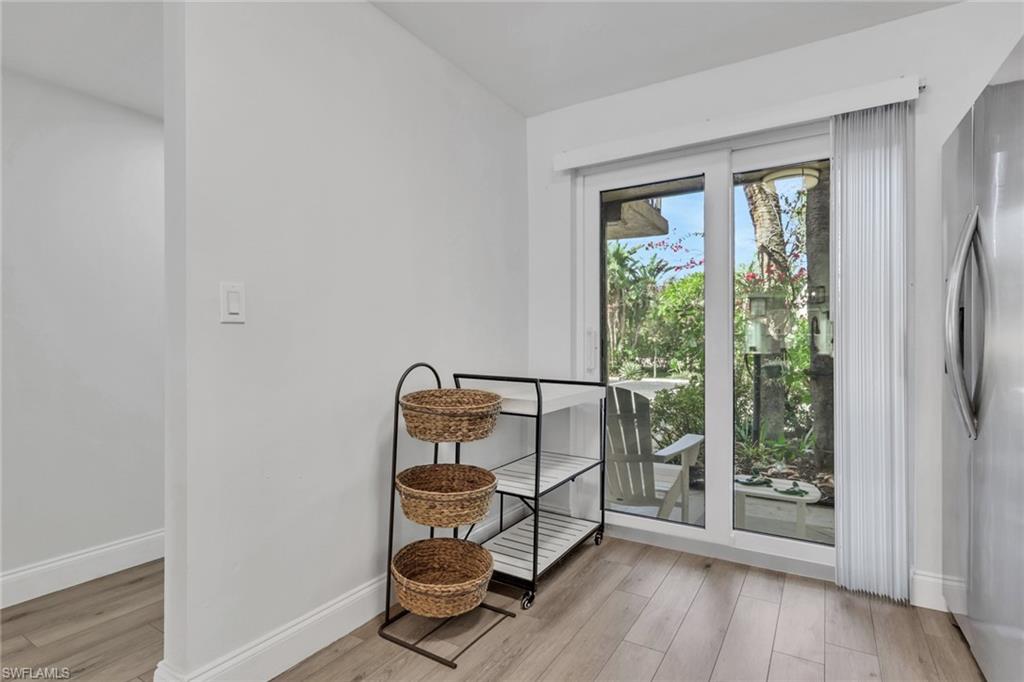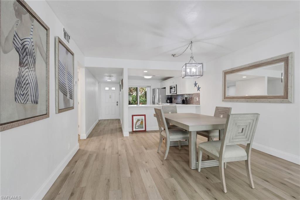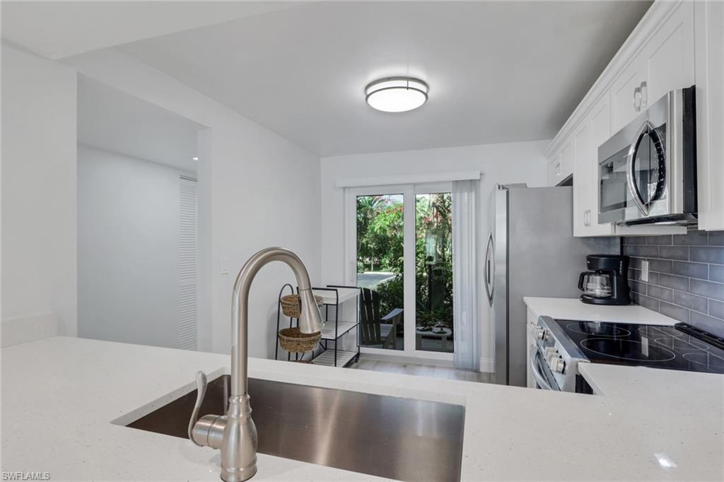 Fully renovated in March 2022 with brand new kitchen, floors and bathrooms. Quartz countertops, glass tile backsplashes, stainless steel appliances, new AC and water heater, luxury vinyl flooring, new hurricane windows and doors. Beautifully furnished/decorated with new furniture and art, this well-appointed home is being sold turnkey. The condo also features a large convenient outdoor storage for bicycles or beach toys which is perfect for enjoying Florida's sunny lifestyle. The community is complete with a Clubhouse, Resort-Style Pool, tennis, pickle ball and bocce courts and a lovely walking trail. Conveniently located in the heart of Naples with a short distance to the beach, downtown, 5th Avenue South, Publix and Interstate 75. First floor unit with assigned parking and low association fees.