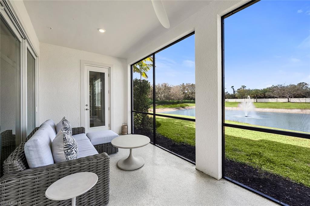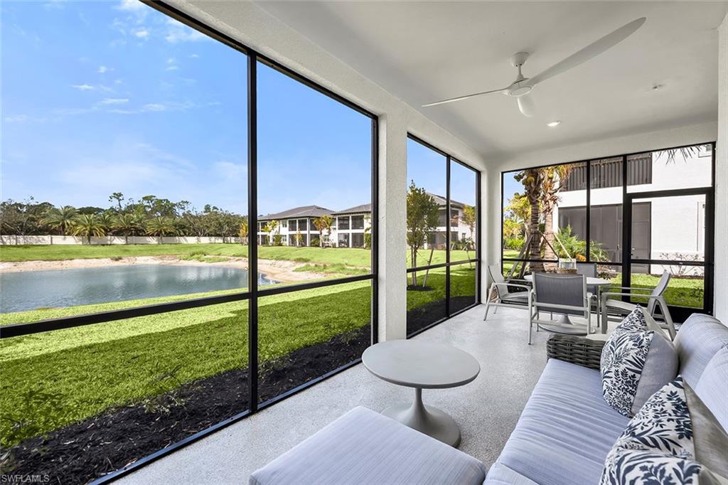 Welcome to Fairgrove at Talis Park — the newest completed coach home enclave within this nationally recognized luxury golf community. Completed in 2024, this first-floor residence presents a rare opportunity to own one of the final new construction coach homes in Talis Park. Offering three bedrooms, two full baths, and an attached two-car garage, the thoughtfully designed 1,710-square-foot floor plan balances open living with privacy and comfort. Professionally decorated with tile flooring throughout, quartz countertops, shaker-style cabinetry, impact-resistant glass windows and doors, and soaring 9-foot ceilings that enhance the sense of space and natural light. The open-concept great room flows seamlessly to the private lanai, where tranquil lake views and desirable western exposure create the perfect setting for enjoying Naples sunsets and warm evening light — an ideal backdrop for everyday living or entertaining. Fairgrove residents enjoy a maintenance-free lifestyle within Talis Park, home to the award-winning Vyne House clubhouse, Core Fitness Center, Esprit Spa, Fiona’s Market Café, tennis, pickleball, and bocce courts. The recently renovated championship golf course, originally designed by Greg Norman and Pete Dye, is consistently ranked among Florida’s top private courses. Conveniently located near the main entrance, this residence offers easy access in and out of the community while remaining close to the clubhouse amenities. Modern construction, never lived in, professionally curated, and ideally positioned within one of Naples’ premier private golf communities — an exceptional opportunity to enjoy luxury living at Talis Park.