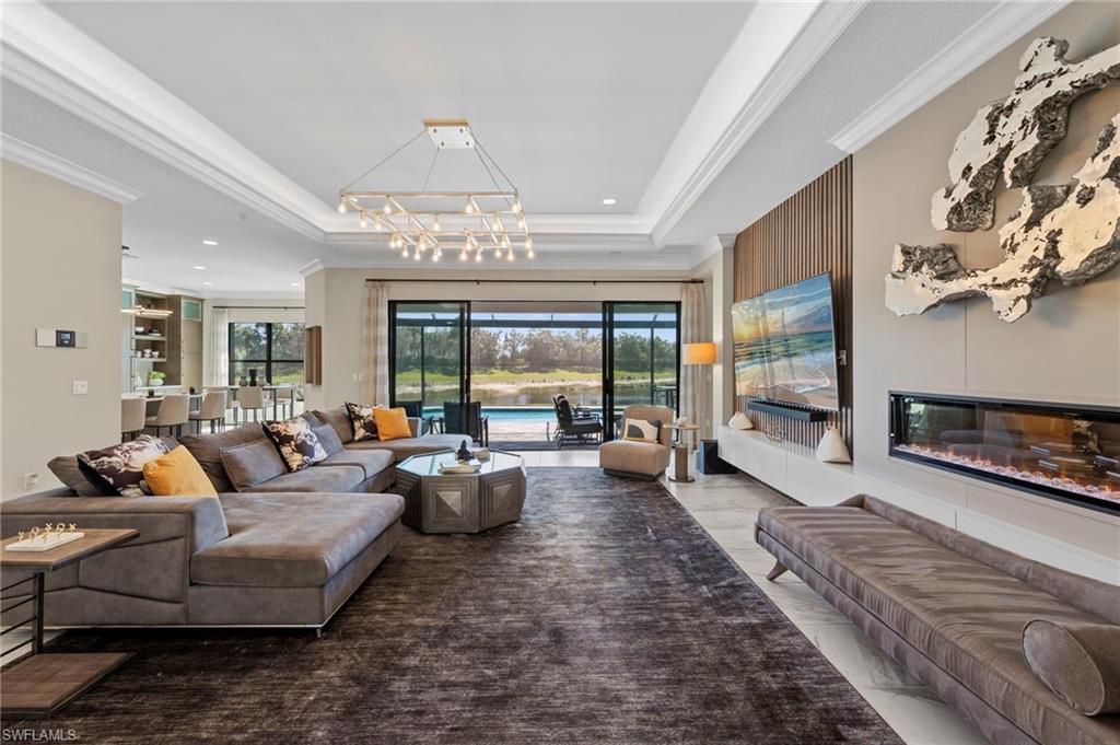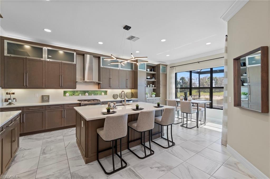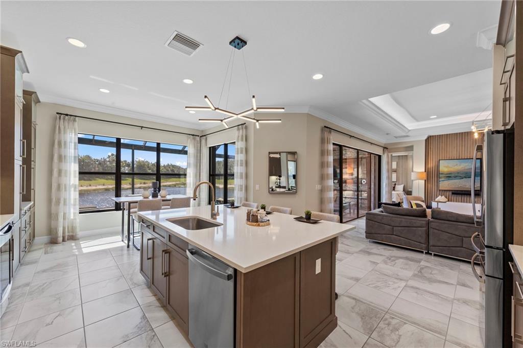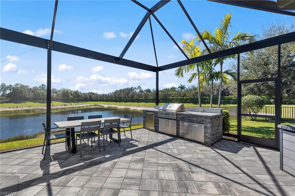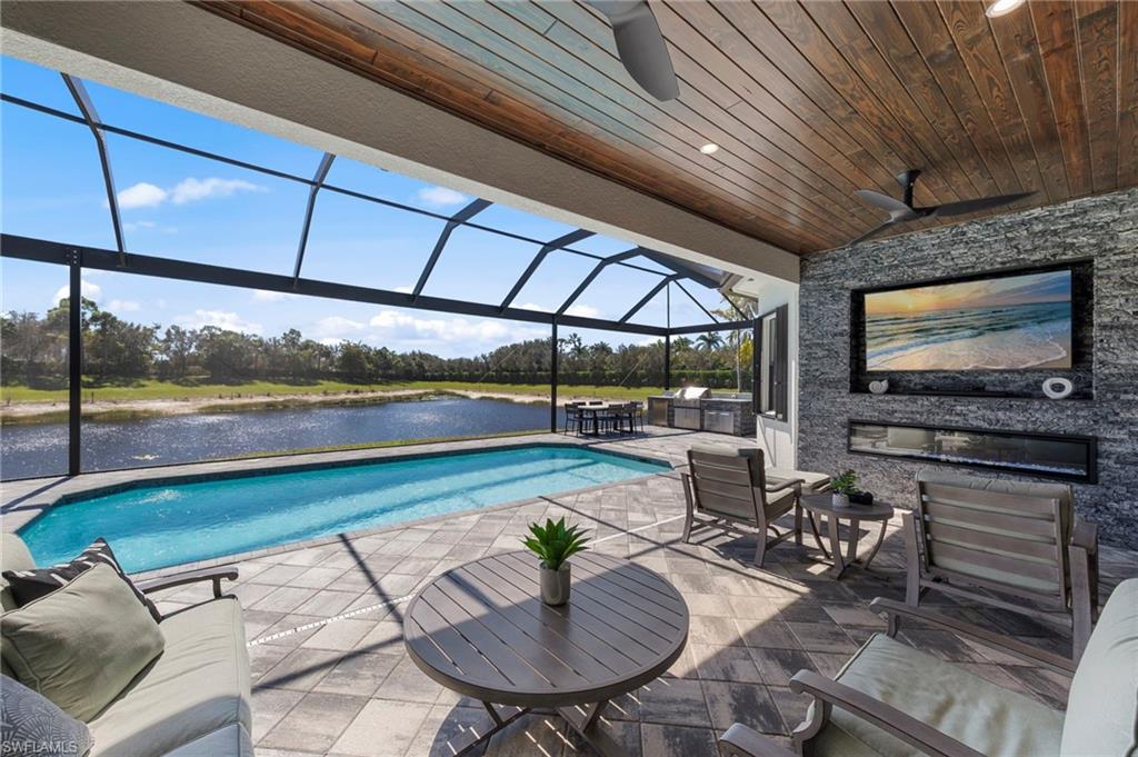 Positioned on a private cul-de-sac within Stonecreek, this former GL Homes Bellagio model showcases premium finishes, exceptional craftsmanship, and one of the most desirable settings in the community. Set on an oversized pie-shaped pie-shaped lot with highly sought-after southern exposure, the home captures long, tranquil lake views and all-day natural light across its expansive outdoor living spaces. Offering 3 bedrooms plus a den and 3 full baths, this residence lives like new and is being offered turnkey for a seamless move-in experience. Custom woodwork and designer detailing elevate the interior, creating a refined yet comfortable atmosphere throughout. The kitchen is thoughtfully designed with abundant cabinetry, a gas range, and a layout that flows effortlessly into the main living and dining areas, ideal for both everyday living and entertaining. The den features custom built-ins, providing a polished and functional workspace. The primary suite is a private retreat with sweeping lake views, custom trim accents, dual walk-in closets with built-in organizers, and a spacious ensuite bath complete with dual sinks, a soaking tub, and a separate walk-in shower. Outdoor living is equally impressive. The expansive lanai overlooks the private lake and features a heated saltwater pool, a sutoma wood-paneled ceiling, built-in fireplace with a stone accent wall, and a custom gas grill—creating a true extension of the home designed for year-round enjoyment. Accordion shutters throughout provide added peace of mind. Beyond the home itself, Stonecreek delivers a resort-style lifestyle centered around its 13,676-square-foot clubhouse and 6.25-acre recreation complex. Residents enjoy a social hall with catering kitchen, indoor sports court, card and game rooms, media room, multi-purpose fitness spaces, and a fully equipped fitness center. Multiple aquatic amenities include a resort-style pool, lap pool, whirlpool spa, and splash park. Sports enthusiasts appreciate the Har-Tru tennis courts, pickleball courts, basketball, and beach volleyball, while outdoor gathering spaces such as the tiki bar, fire pit, and lake overlook pavilion create the perfect setting for socializing. A full-time lifestyle director curates events and activities year-round, and miles of sidewalks wind throughout the beautifully landscaped community. This is a rare opportunity to own a former model home on a premier lot while enjoying one of Naples’ most amenity-rich gated communities.