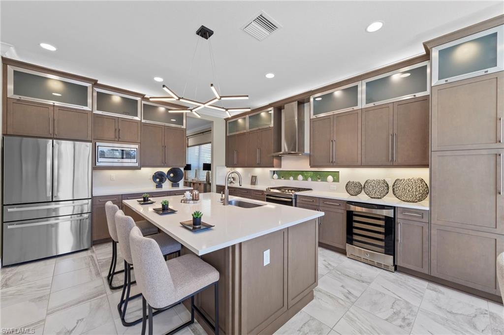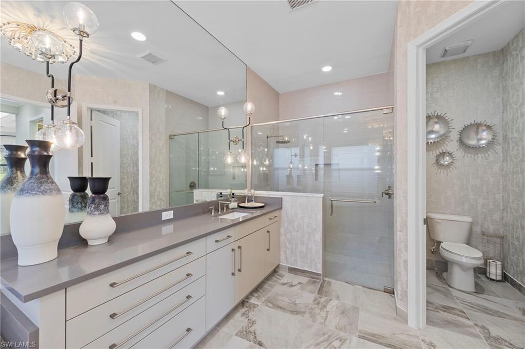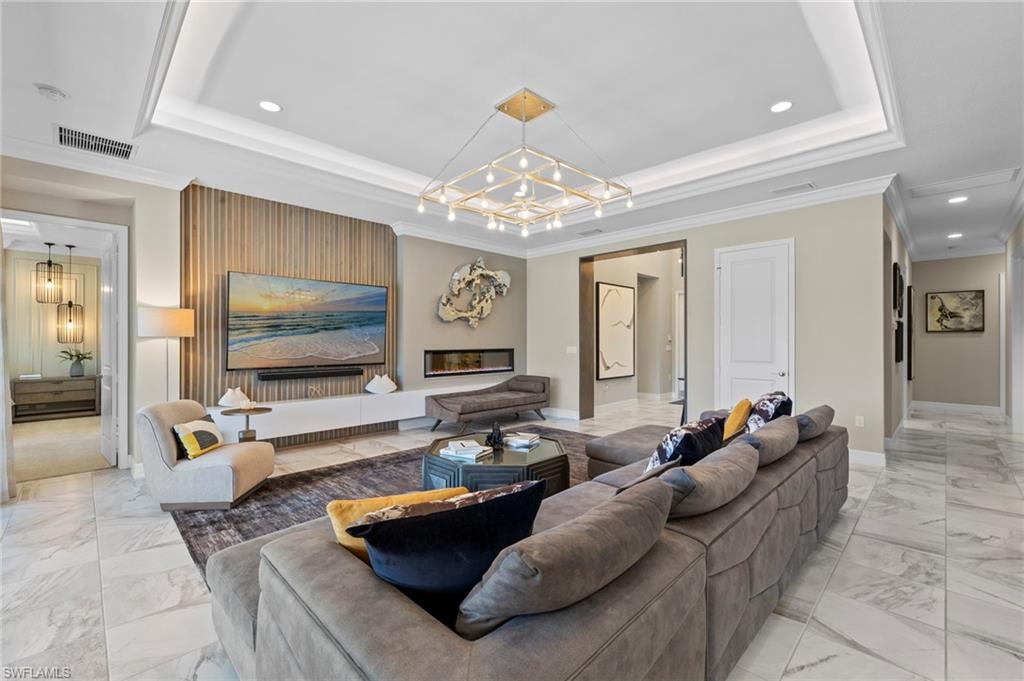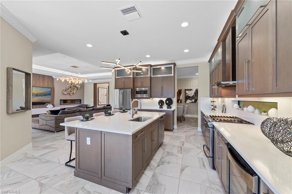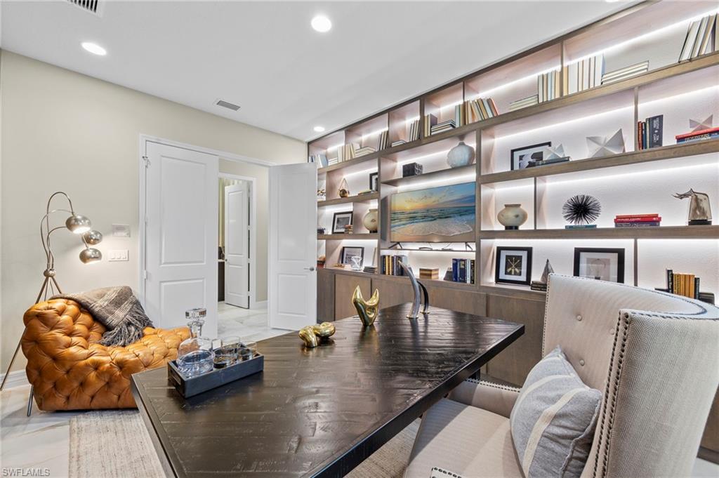 Positioned on a private cul-de-sac within Stonecreek, this former GL Homes Bellagio model showcases premium finishes, exceptional craftsmanship, and one of the most desirable settings in the community. Set on an oversized pie-shaped pie-shaped lot with highly sought-after southern exposure, the home captures long, tranquil lake views and all-day natural light across its expansive outdoor living spaces. Offering 3 bedrooms plus a den and 3 full baths, this residence lives like new and is being offered turnkey for a seamless move-in experience. Custom woodwork and designer detailing elevate the interior, creating a refined yet comfortable atmosphere throughout. The kitchen is thoughtfully designed with abundant cabinetry, a gas range, and a layout that flows effortlessly into the main living and dining areas, ideal for both everyday living and entertaining. The den features custom built-ins, providing a polished and functional workspace. The primary suite is a private retreat with sweeping lake views, custom trim accents, dual walk-in closets with built-in organizers, and a spacious ensuite bath complete with dual sinks, a soaking tub, and a separate walk-in shower. Outdoor living is equally impressive. The expansive lanai overlooks the private lake and features a heated saltwater pool, a sutoma wood-paneled ceiling, built-in fireplace with a stone accent wall, and a custom gas grill—creating a true extension of the home designed for year-round enjoyment. Accordion shutters throughout provide added peace of mind. Beyond the home itself, Stonecreek delivers a resort-style lifestyle centered around its 13,676-square-foot clubhouse and 6.25-acre recreation complex. Residents enjoy a social hall with catering kitchen, indoor sports court, card and game rooms, media room, multi-purpose fitness spaces, and a fully equipped fitness center. Multiple aquatic amenities include a resort-style pool, lap pool, whirlpool spa, and splash park. Sports enthusiasts appreciate the Har-Tru tennis courts, pickleball courts, basketball, and beach volleyball, while outdoor gathering spaces such as the tiki bar, fire pit, and lake overlook pavilion create the perfect setting for socializing. A full-time lifestyle director curates events and activities year-round, and miles of sidewalks wind throughout the beautifully landscaped community. This is a rare opportunity to own a former model home on a premier lot while enjoying one of Naples’ most amenity-rich gated communities.
