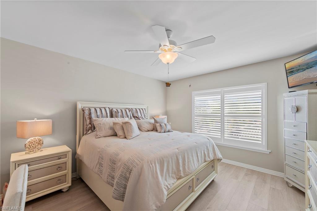 Location, Location, Location! Walk to every amenity in the community in minutes and not on the main road. A perfect little quiet street next to everything. The elegant design of this townhome creates a warm meticulously maintained home. The front porch overlooking the famous "Venetian bridges" and lakes are perfect for relaxing. Inside, you’ll find an open, airy living space that seamlessly connects the living, dining, and kitchen areas. Appealing interior colors with planation shutters, tile and wood laminate flooring ( No Carpet), lots of storage. The sleek kitchen features modern appliances, ample cabinetry, and a granite countertop, ideal for entertaining. This home offers three comfortable bedrooms, including two upstairs with en-suite bathrooms for a private retreat. The ground-level bedroom is generously sized for guests with a walk in closet, full bath or it can serve as a den or office. Permanent Hurricane storm protection and 2 car garage, home was built in 2013 so newer then most townhomes. Unwind in your private spa and screened outdoor lanai, with an extra large remote operated awning, includes TV and Bose speakers. Village Walk residents enjoy an impressive array of resort-style amenities, including multiple pools, a fitness center, tennis, pickleball, bocce, two on-site restaurants, a gas station, car wash, and over five miles of scenic walking paths. Cable, internet, and fiber optics are included in the HOA fees. This well-maintained home is perfectly suited for year-round living or seasonal retreat in one of Bonita Springs’ most desirable communities.