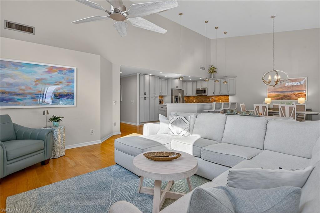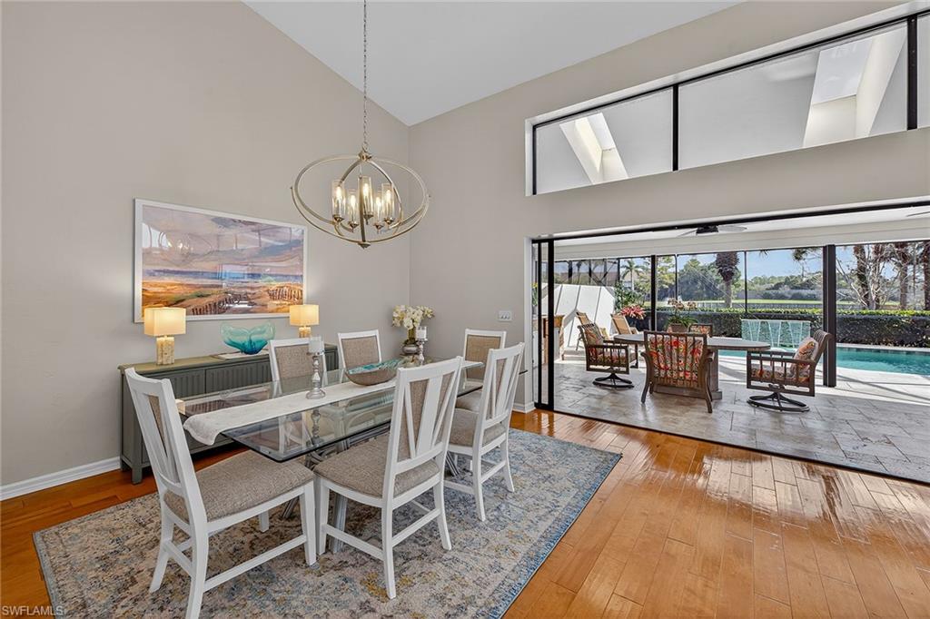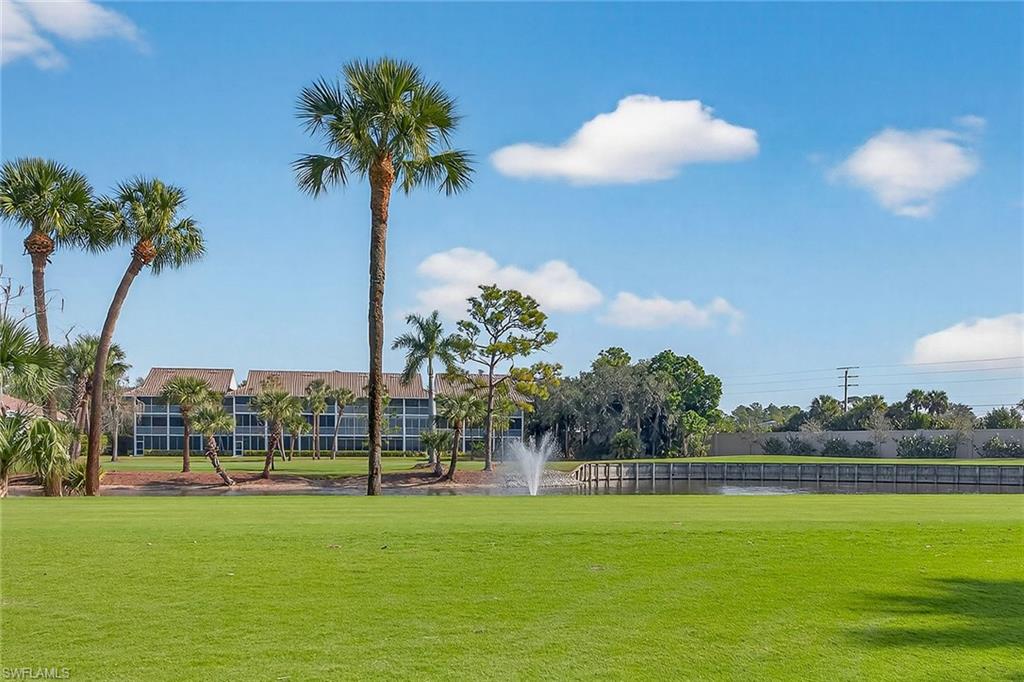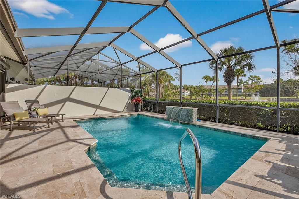 Experience refined golf course living in this furnished three-bedroom, two-bath villa within Eagle Creek Golf and Country Club, where sweeping fairway and water views create a picturesque daily backdrop. Designed to capture natural light, the open floor plan is anchored by a dramatic living room with soaring ceilings and engineered wood flooring that adds warmth and continuity throughout the main living areas. The kitchen has been thoughtfully updated with quartz countertops, solid wood cabinetry and premium stainless steel appliances, offering both visual appeal and practical functionality. The primary suite serves as a private retreat, featuring a renovated en-suite bath with quality finishes and a spacious walk-in closet enhanced by a custom organization system. The guest bedroom is privately situated near a beautifully updated bath, providing comfort and separation for visitors. A third bedroom, currently arranged as a study, includes a built-in desk and shelving unit along with a pullout sofa, allowing flexibility as a home office or additional guest space. Outdoor living is equally compelling. A spacious covered lanai overlooks the golf course and water, complemented by a full summer kitchen with gas grill and beverage refrigerator. The swimming pool, accented by water features and surrounded by marble decking, creates a resort-style setting for relaxation or entertaining. Additional features include a two-car garage, impact-resistant windows and doors and electric storm screens enclosing the lanai. Immediate golfing privileges are available with the club’s Social Golf Program. Eagle Creek Golf and Country Club is one of Naples intimate and established golf communities, limited to just 458 residences. The newly reimagined clubhouse offers fine and casual dining venues, a member bar, and social spaces for events and gatherings. The nearby Crystal Lake clubhouse features outdoor dining, a resort-style pool, a fitness center, and courts for tennis and pickleball—an unparalleled blend of recreation and relaxation.