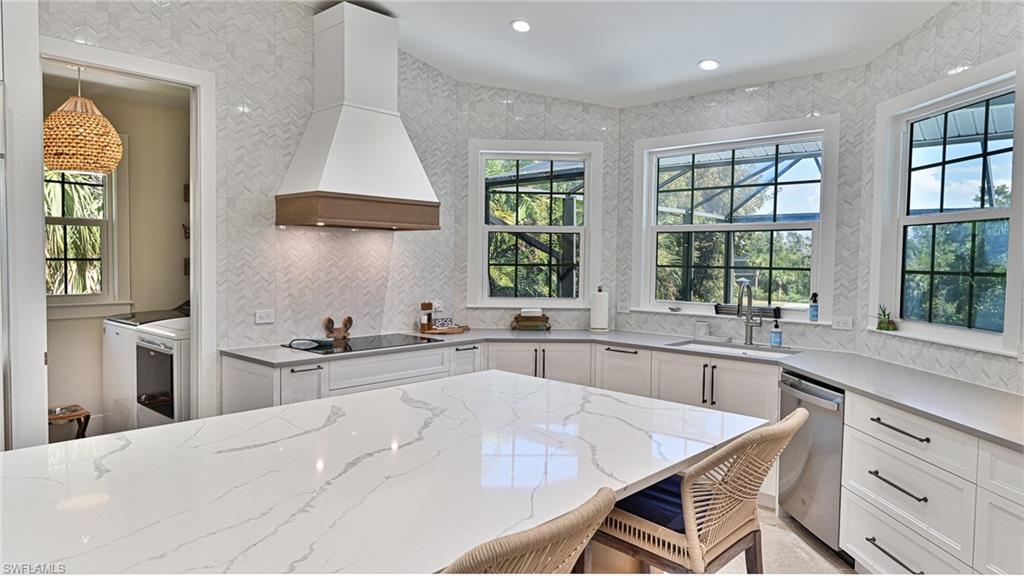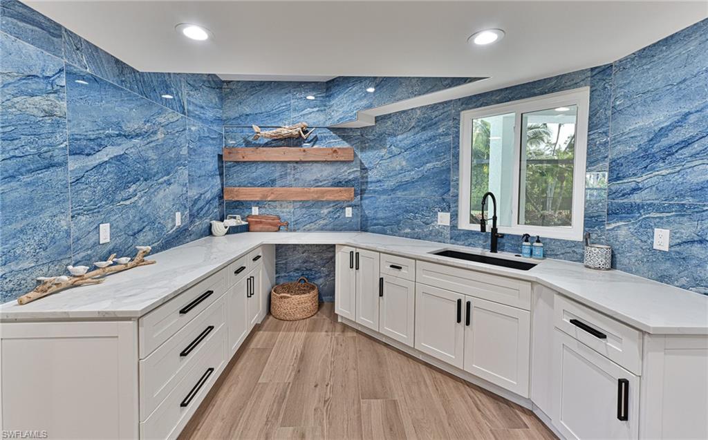This Southport on the Bay 6 bedroom 4 bath coastal designed home was completely reimagined! Southport on the Bay is a double gated community within Barefoot Beach. With lake front views the property also offers a rare horizontal open plan with grand 20' ceilings heights. This home features modern light coastal interior fixtures and finishes, new metal roof, impact glass windows & doors, all new pool & spa, new pool cage, new landscaping, fenced yard, private and private elevator. Expansive outdoor living with covered plantation style porch. The swimming pool enclave includes indoor and covered outdoor entertaining area that includes dual seating areas with HDTV, fireplace, pass thru bar, rope swing seats, marble paver deck, and summer kitchen. This home is a short stroll to the private beach access and boat slips are available for lease. Home is located on a lake with fountain and overlooks the private Barefoot Beach preserve. The master suite offers it’s own lanai access and an all new bath with wet space that includes shower with tub. This home is sold turnkey furnished, needs nothing and is ready for you to enjoy, plus offers new elevated pool equipment, full storm panels and a 3 car garage. Barefoot Beach, Collier County’s premier gated beach to bay community, amenities include 24 hour guards and patrols. Option to join the Club at Barefoot Beach (located in the community) which offers casual & fine dining restaurants, pool & beachside food, drinks, chair service, indoor & outdoor bars, ice cream & coffee shop, tennis courts with pro & a full events calendar. (waitlist with usage during wait period). Minutes to Mercato, Coconut Point Mall, Promenade & Waterside, the airports and golfing. Boat docks are available for lease or purchase right across the street.