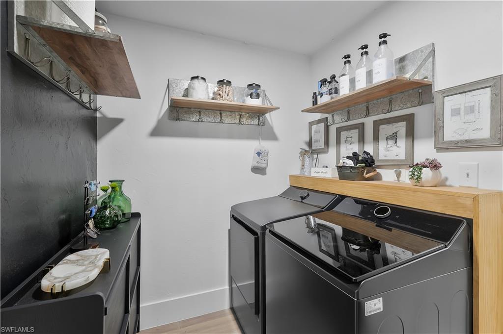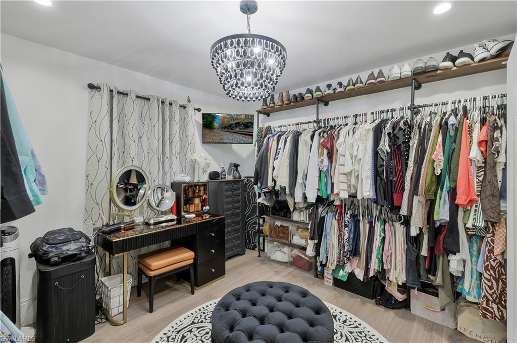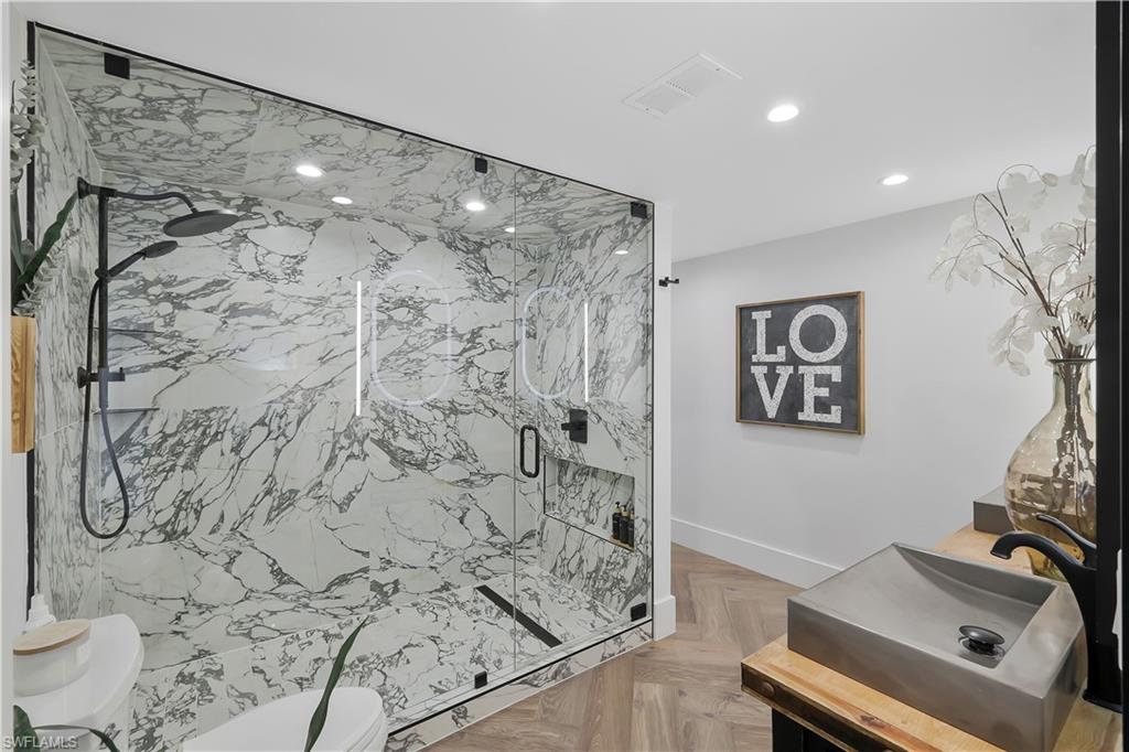 PREPARED TO BE WOWED! One of the most spectacularly remodeled residences in Park Shore — a true designer showpiece located in one of Naples’ most walkable and coveted neighborhoods. From the moment you arrive through lush tropical landscaping, you’re greeted by a home that blends sophisticated luxury with effortless coastal living. Inside, soaring vaulted ceilings and expansive light-filled spaces showcase oversized designer European hardwood flooring, custom cabinetry, fluted accent walls, and curated designer lighting throughout. The completely reimagined chef’s kitchen features GE Café built-in appliances, Thassos Marble back splash, Quartz countertops, custom solid wood cabinetry, and a striking modern aesthetic that flows seamlessly into the living and entertaining areas. A floor-to-ceiling porcelain fireplace wall anchors the space, creating warmth and architectural drama, while every detail — from custom closets to fully remodeled spa-inspired baths — reflects exceptional craftsmanship. The primary suite is nothing short of breathtaking, highlighted by a spectacular shower, designer vanities, and luxurious finishes that rival the finest new construction. The outdoor living space is equally unforgettable. Vaulted beam ceilings, a custom tile fireplace wall, live-edge wood bar, and serene views create a tranquil retreat designed for entertaining or relaxing in style. A rare advantage in Park Shore, this property sits 14 feet above sea level in an X FLOOD ZONE and includes storm protection- delivering both luxury and long-term confidence in one of Naples' most coveted neighborhoods. Located just moments from Waterside Shops, Publix, and the white-sand beaches of Naples, this extraordinary Park Shore villa offers a rare combination of walkability, luxury design, and turnkey living. Designed by one of Naples’ top designers as a personal residence, this home is truly a one-of-a-kind showstopper.