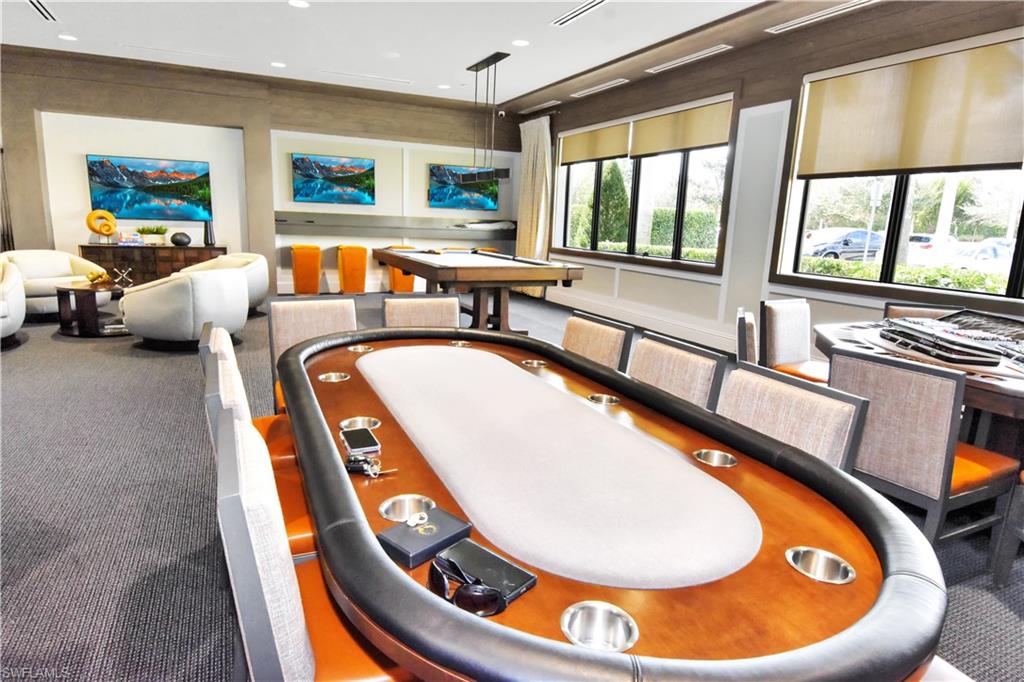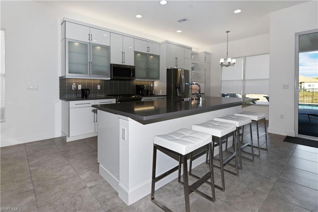 An exceptional Water View!! Cabernet model elevated 22 feet above sea level — no flood insurance required — offering rare, high-end upgrades and refined indoor-outdoor living that set it apart from the rest. Enhanced beyond builder standards, this home features high-impact glass windows, double glass entry doors, upgraded tile flooring in the den and all bedrooms, and added designer lighting. The chef’s kitchen is a true centerpiece with a dramatic 4’ x 10’ island, upgraded cabinetry with interior and under-cabinet lighting, custom coffee station, wet bar, designer backsplash, gas stove, upgraded wine fridge and oven, plus a new refrigerator (2026). The spa-inspired primary bath showcases ceiling-height tile, mirrors to the ceiling, and frosted privacy glass for a sleek, modern finish. Outdoors, the property becomes extraordinary — a saltwater pool with gas heater and auto water leveling, expanded entertaining patio, extended fencing, custom retaining wall for added flood protection, enhanced landscape lighting, and gas-ready BBQ area. A dedicated garage outlet for golf cart charging adds further convenience. Offered fully furnished (excluding select personal items), this is a rare turnkey opportunity in a community featuring a 45,000 sq. ft. clubhouse and the 5-star restaurant, The Oasis. Elevated. Upgraded. Truly one of a kind.
