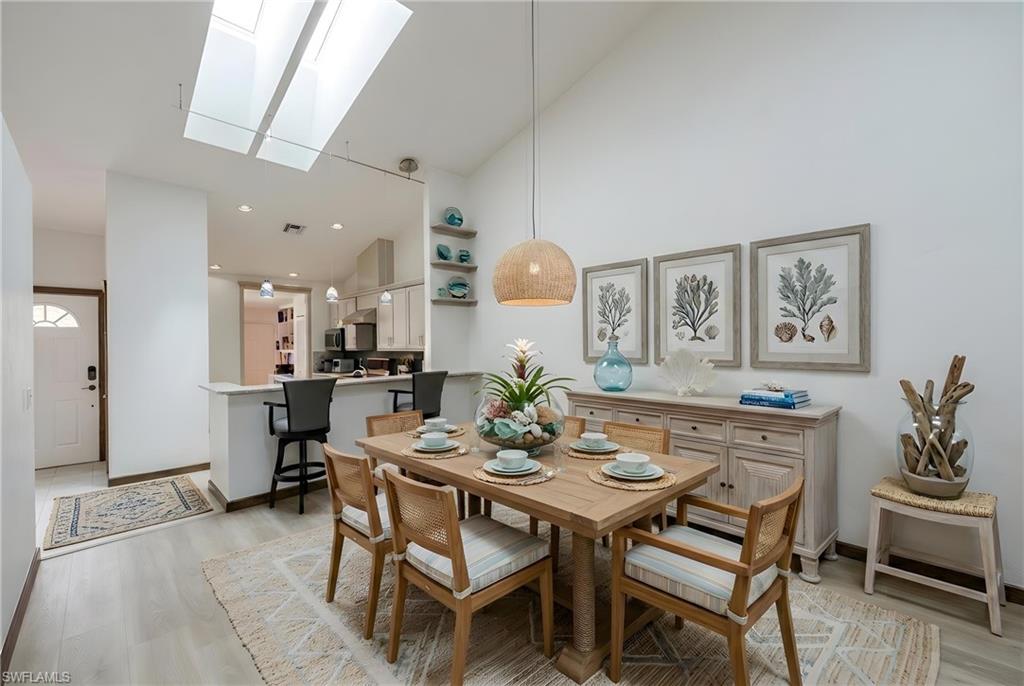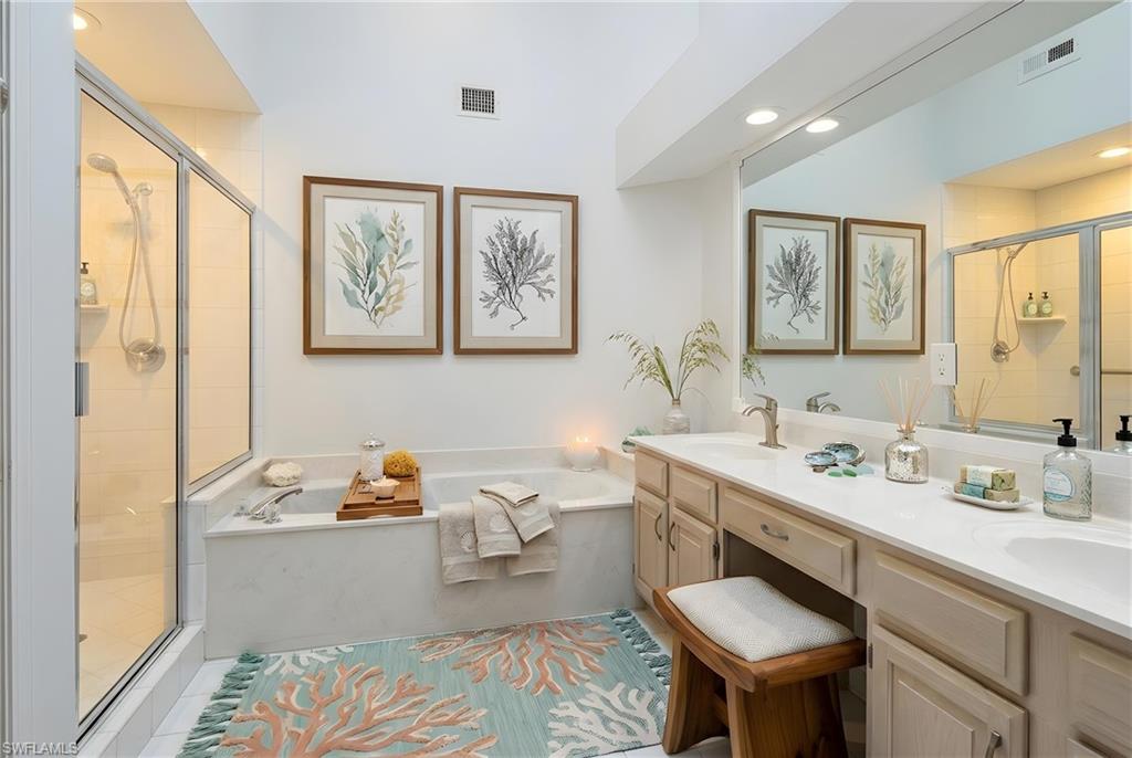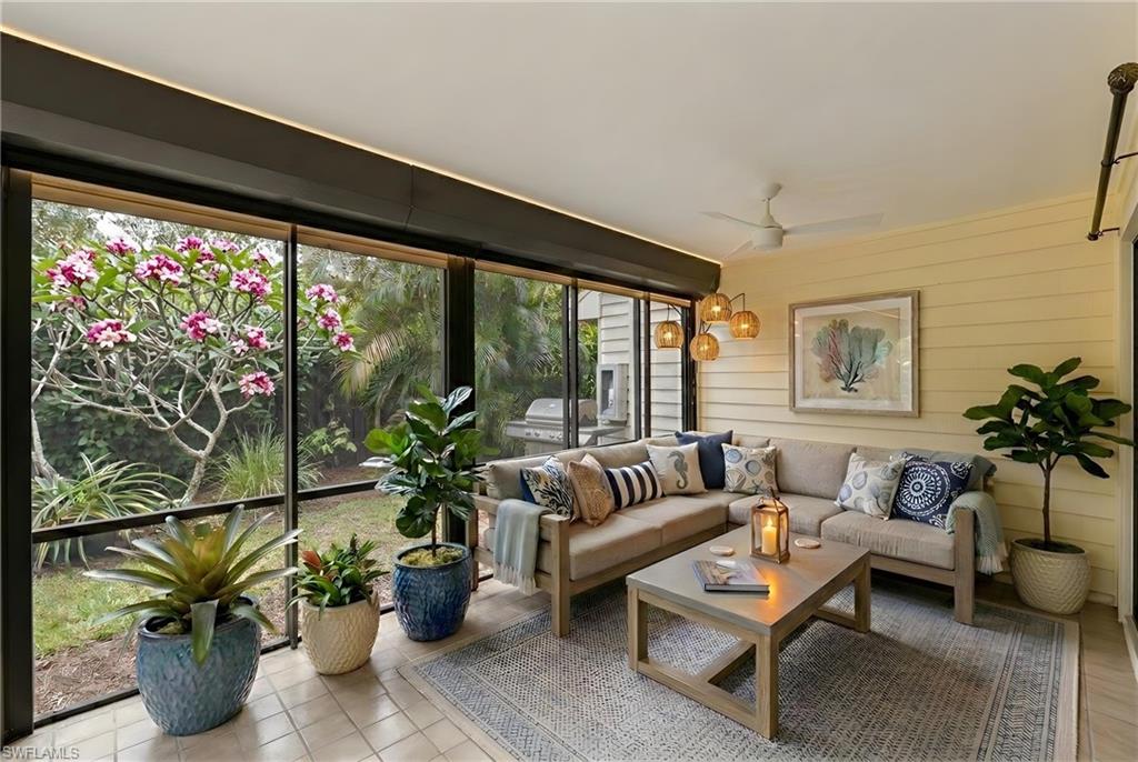 Light-filled single-story Villa Just Steps to the pool in Pelican Bay. Ideally positioned on a desirable southeast-facing lot, this well-maintained 2-bedroom + den residence offers flexible living in one of Naples’ most sought-after communities. The split-bedroom floor plan includes a spacious primary suite with dual vanities, soaking tub, and separate shower. A private guest suite and a versatile den/flex room that can easily function as a third overflow bedroom, office, or media space are also available. Vaulted ceilings and skylights enhance the natural light, while neutral finishes create a relaxed yet refined atmosphere throughout. The kitchen features light cabinetry, stainless steel appliances, stone countertops, and a sleek backsplash, opening to dining and living areas designed for easy everyday living and entertaining. Large sliders lead to the screened lanai and shared backyard, where a stunning mature plumeria tree creates a true tropical focal point. Additional highlights include: Attached 2-car garage, private courtyard-style entry, southeast exposure for optimal morning light, and pet-friendly association permitting two pets. Villas at Pelican Bay Amenities: Neighborhood clubhouse, Community pool and gathering area, professionally maintained landscaping, close proximity to tram stations, and beach access. Pelican Bay amenities include: nearly three miles of private Gulf-front beach, two beachfront restaurants with indoor & outdoor dining, beach attendants with chair and umbrella service, fitness center with professional services available, tennis center with 18 Har-Tru courts, 10 pickleball courts, miles of walking and biking paths, canoe/kayak launch through mangrove estuaries and robust social and wellness programming offering exceptional value within Pelican Bay and located moments from Waterside Shops, Artis–Naples, and Mercato, this residence delivers the best of Naples coastal living in a quiet, low-maintenance setting.