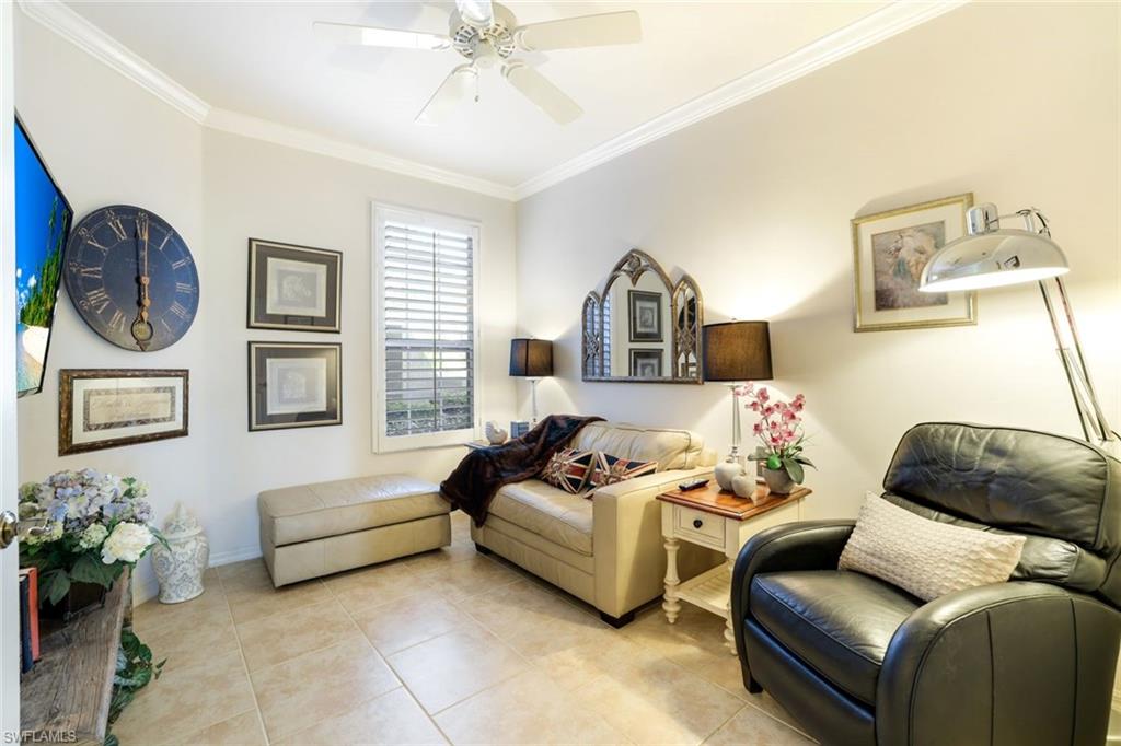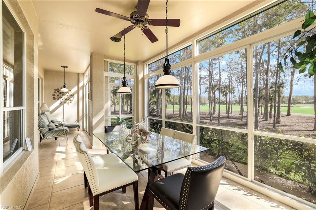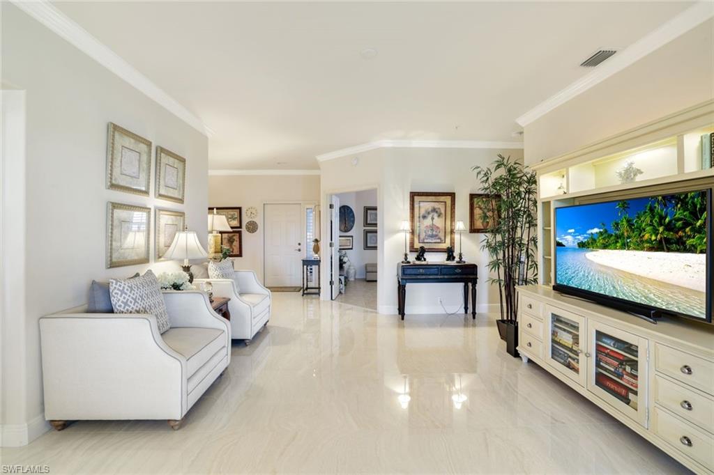 Location, Location, Location! Located in Naples is the perfect place to retire and this beautifully maintained furnished 3 bedroom/den carriage home with attached garage, tiled lanai, crown molding, upgraded baseboard, updated bathrooms, granite counters, porcelain tile living area and roll down storm shutters, offers the perfect blend of comfort, views, and resort-style living. Golf cart with new lithium battery is negotiable . Ideally positioned just steps from the clubhouse and directly across from a satellite pool, the home enjoys an exceptional setting within the community. Start your mornings with coffee on the oversized enclosed eastern-facing lanai, where you can watch the sunrise while taking in expansive views of the 18th fairway and a tranquil wooded buffer that provides privacy from the golf cart path. The bright open-concept floor plan is ideal for entertaining and everyday living, featuring double sliding doors to the lanai that seamlessly connect indoor and outdoor spaces. A split-bedroom layout provides privacy for residents and guests, while the versatile den with pull-out couch easily functions as a home office or additional guest space.