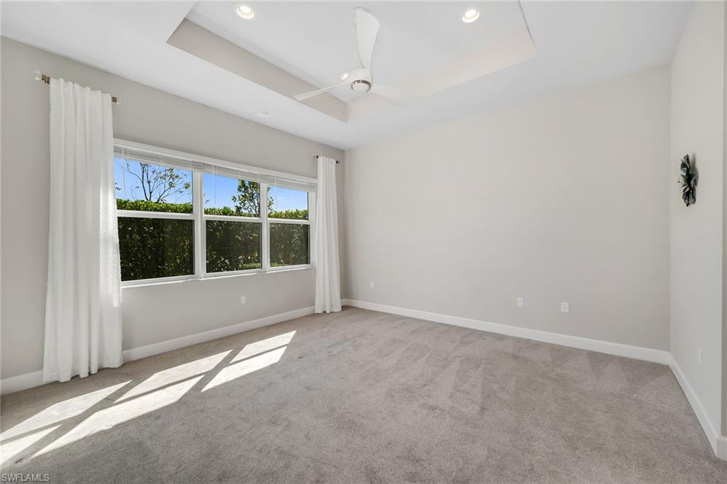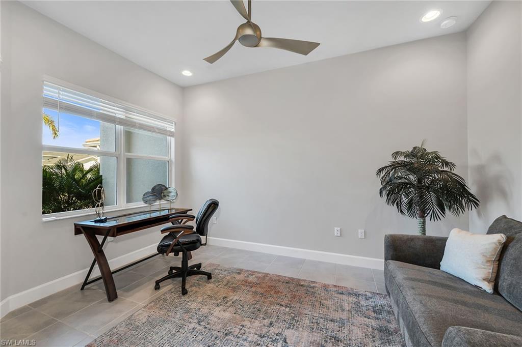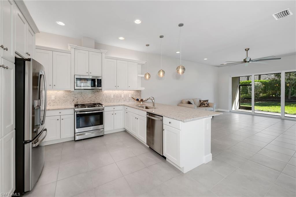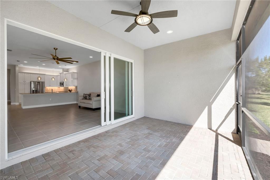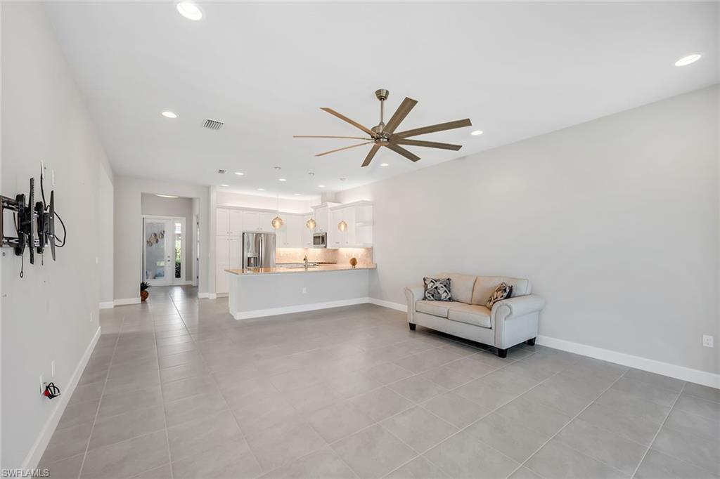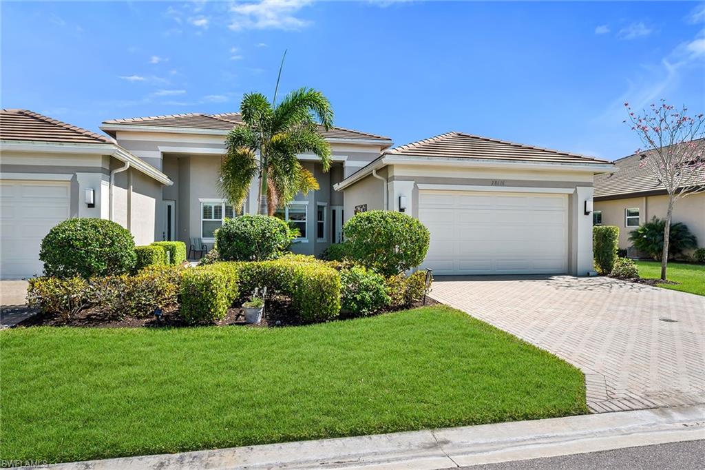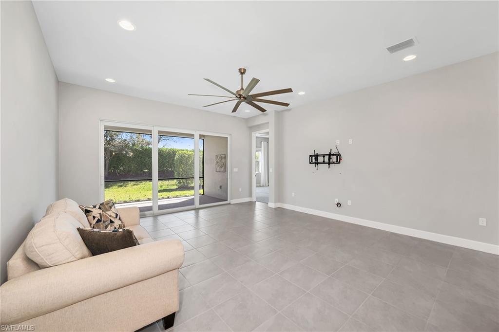 Enjoy serene privacy and lush landscaping views in this light-filled villa in the sought-after community of Valencia Bonita. Ideally on an oversized homesite, the property features an extended side yard on the south side of the home, providing additional green space and enhanced privacy rarely found in the neighborhood. With desirable eastern rear exposure for soft morning sun, this thoughtfully designed residence offers two bedrooms plus a den, two baths and a two-car garage, blending comfort, function and effortless Florida living. Inside, tile flooring flows throughout the main living areas, enhancing the bright and cohesive design. The open-concept living room is highlighted by recessed lighting and tranquil views of the paver lanai and lush landscaping beyond. A spacious formal dining room accommodates a table for six and features recessed lighting and a large window that fills the space with natural light. The den, accessed through double entry doors, provides flexibility for a home office or media room and includes recessed lighting for a refined finish. The kitchen is stylish and functional, appointed with white cabinetry, under-cabinet lighting, accent fixtures, and GE stainless steel appliances, including a gas range and French-door refrigerator. A four-seat bar offers casual dining, while the layout provides peaceful views of the lanai and surrounding greenery, ideal for entertaining or everyday enjoyment. Positioned at rear of the home, the primary suite serves as a relaxing retreat featuring a tray ceiling, recessed lighting, abundant natural light and lush landscape views. Two walk-in closets provide generous storage, while the en-suite bath offers dual vanities, a glass-enclosed shower and a linen closet. The guest bedroom is on opposite side of the home for added privacy and includes a ceiling fan and walk-in closet. A well-equipped laundry room with GE washer and dryer, upper cabinetry and utility sink adds everyday convenience. Go outside to the spacious paver lanai, where eastern exposure and mature landscaping create a peaceful outdoor setting ideal for morning coffee or evening relaxation. Valencia Bonita is a premier 55-plus community featuring a 45,000-square-foot resort-style clubhouse with a member-only restaurant, social hall, fitness center, spa, culinary studio, arts and crafts studio, card rooms and billiards lounge, along with a full calendar of clubs and activities. Outdoor amenities include pickleball, tennis and bocce courts, a resort pool with cabanas, lap and resistance pools, heated spa and dog park. Conveniently near Interstate 75, beaches and downtown Bonita Springs favorites like Sugar Shack and The Rooftop at Riverside, and approximately 45 minutes from Fifth Avenue South, Artis—Naples and The Baker Museum, it offers resort living year-round.