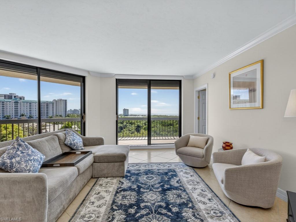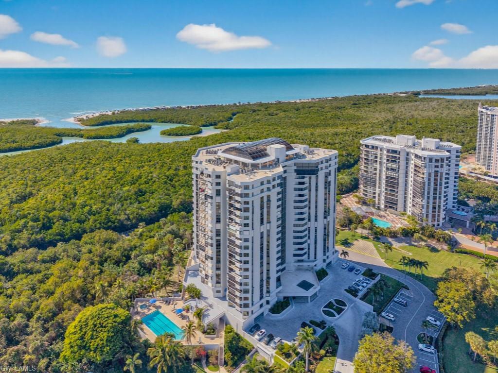 Enjoy sunsets over the Gulf and views of both mangroves and a sparkling evening-scape from your spacious balconyi. This SW facing bright and sunny condo offers a spacious and open great-room floorplan complemented by a large primary suite, split bedrooms for convenience, and a good-sized den that can be used as an overflow bedroom or home office. All living areas and both bedrooms have access to the oversized balcony. Offered turnkey furnished so new owners can just move in while deciding on their own finishing touches. The Grosvenor has completed many recent modernization updates to the extensive amenities, which include an on-site workout room, social room, billiards room, library and 3 guest suites. Enjoy an outdoor BBQ area overlooking the glittering communal pool set amongst the mangroves, and with direct access to ‘the berm’ for walks or bike rides, plus trams to the 3-miles of Pelican Bay’s white sand beaches with beach furniture and amenities. Pelican Bay has two private member-only Beach Clubs with open air bars and restaurants or more formal indoor dining, a Community Center with a full-service gym, fitness classes, and many other activities to suit all interests. There are 18 Har-Tru tennis courts with active tennis programs, and brand-new Pickleball courts. A truly unique Southwest Florida lifestyle awaits!
