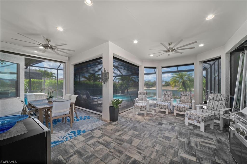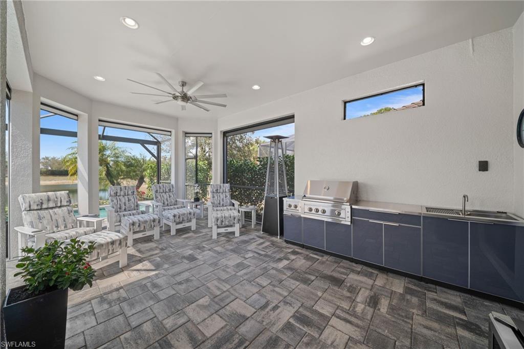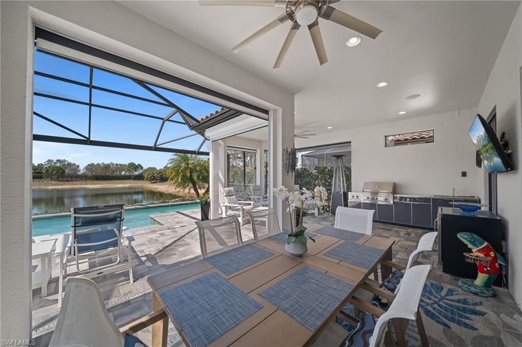 IT’S ALL ABOUT THE VIEW - LIVE A VACATION LIFESTYLE IN ESPLANADE! This immaculate and well appointed “Expanded Farnese” is situated at the end of a quiet cul-de-sac street on a premium WEST REAR FACING LAKEFRONT LOT overlooking the lake. Inside, you will find 3 en-suite bedrooms plus an additional powder room, den, and 2,100 sq ft of open concept living space. From the moment you walk in the door, you are greeted with 24”x24” porcelain tile floors that run throughout the common areas, primary suite, & den and two sliding glass doors that lead you to the extended covered lanai complete with outdoor kitchen, and GAS heated lap pool with sunken spa. The kitchen features shaker style cabinetry, quartz countertops, and stainless steel appliances including a GAS cooktop, new wall oven (with air fry), & wall convection microwave. Other fine appointments include: NEW WHOLE HOUSE GENERATOR; NEW motorized roll down hurricane screens on the lanai; air conditioned extended tandem garage with epoxy floor; NEW landscaping around the entire property including landscaping lighting; NEW salt water generator for the pool/spa; NEW washing machine; primary suite walk in closet with custom shelving/drawers; hurricane impact front door with matching sidelight; plantation shutters on all windows; freshly painted interior/exterior; spacious Laundry Room with extra cabinetry; 8' doors/10'; ceilings; and more! This property also comes with a Club/Sports Membership, granting full access to all the amenities of Esplanade Golf & Country Club (limited golf opportunities all year round!). These include the resort pool with cabanas and a poolside Bahama Bar, tennis and pickleball courts, bocce, a Koquina Day Spa, a fitness center, and a dog park. There are also 14 miles of trails and an 18-hole private golf course. On-site dining options include a restaurant, bar, wine tasting room, and a Starbucks-style café. The total quarterly fee of just $2,577 include property landscaping maintenance and full access to all the resort-style living amenities at Esplanade. COMING SOON TO ESPLANADE (2026): Fully renovated and expanded poolside Bahama Bar; expanded outdoor bar at the Barrel House; expanded golf practice range; and an AIR CONDITIONED INDOOR PICKLEBALL COMPLEX with four indoor courts.
