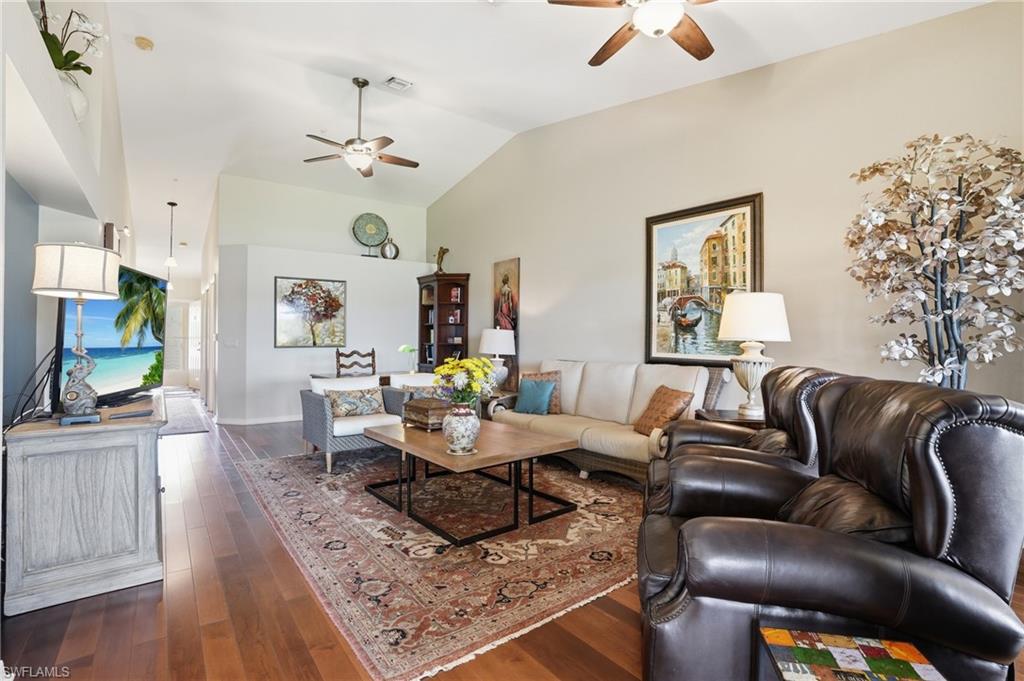 Experience serene golf course and lake views from this TURNKEY 2-bedroom, 2-bath condo in Bermuda Links at Bonita Fairways. This exceptional property features vaulted ceilings, gorgeous hardwood floors, a breakfast bar, and stainless-steel appliances. The spacious primary suite offers a sizable walk-in closet, while the primary bathroom features dual sinks and a walk-in shower. A well-appointed guest suite located across the hall is perfect for hosting company, complete with a large closet and an en-suite guest bathroom. The thoughtful layout makes this property ideal for entertaining friends or simply spending time with family. Relax on the screened lanai and take in the picturesque views, or enjoy the community’s exceptional amenities, including tennis, shuffleboard, bocce, and an affordable 18-hole pay-as-you-play golf course. A one-car detached garage and low-maintenance living—with exterior upkeep handled for you—enhance convenience and ease. Located minutes from beaches, dining, and premier shopping, this move-in-ready condo offers the perfect blend of comfort, style, and the vibrant Southwest Florida lifestyle.