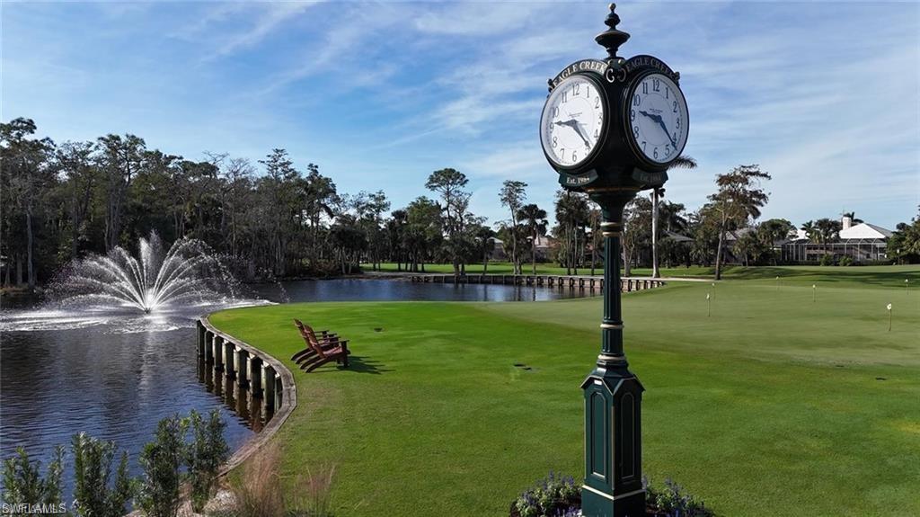 IMMEDIATE EQUITY GOLF. Fully updated 3-bedroom, 2.5-bath single-family residence showcasing high-end finishes and refined design throughout. Luxury vinyl flooring spans the main living areas and upstairs bedrooms, with plush carpet in the primary suite. The redesigned kitchen features granite countertops, a center island, wall oven, wine refrigerator, and upgraded CAFÉ glass appliances, complemented by a cozy sitting area nearby. The spacious first floor primary suite offers electric shades and master bath all remodeled with dual sinks, and an oversized walk-in shower with dual showerheads. Additional interior highlights include plantation shutters throughout, central vacuum, and a video security system. Exterior appointments include granite accents, stucco finish, and a tile roof, along with hurricane-resistant sliders and windows for peace of mind. The panoramic screened lanai provides uninterrupted views of the lake and golf course, complete with a pool, overflow spa, and fully equipped outdoor kitchen—ideal for entertaining. The garage features epoxy flooring and is both insulated and air-conditioned. Eagle Creek Golf and Country Club is one of Naples’ most intimate and established golf communities, offering an exclusive collection of just 458 residences surrounded by lush fairways and mature landscaping. Its newly reimagined clubhouse features refined and casual dining options, a welcoming member bar, and elegant social spaces designed for gatherings, celebrations, and everyday connection. Just moments away, the Crystal Lake clubhouse expands the lifestyle experience with outdoor dining, a resort-style pool, a modern fitness center, and courts for tennis and pickleball—creating a rare blend of recreation, relaxation, and community in a truly exceptional setting. Property has an immediate golf membership available for $125,000 initiation.
