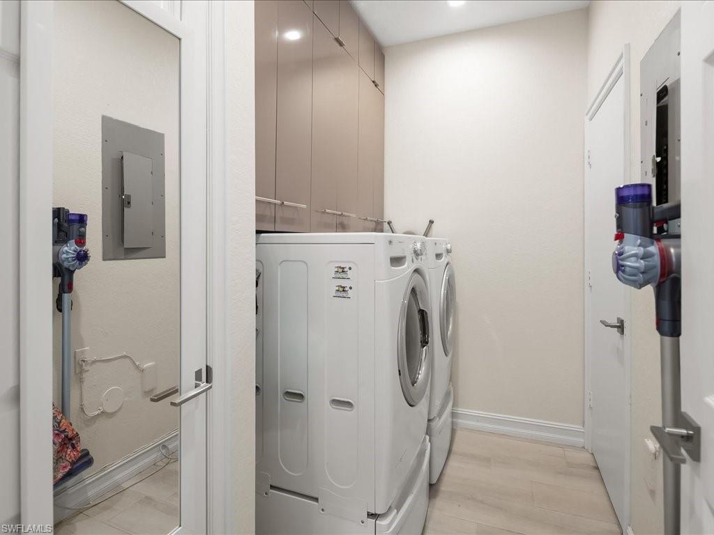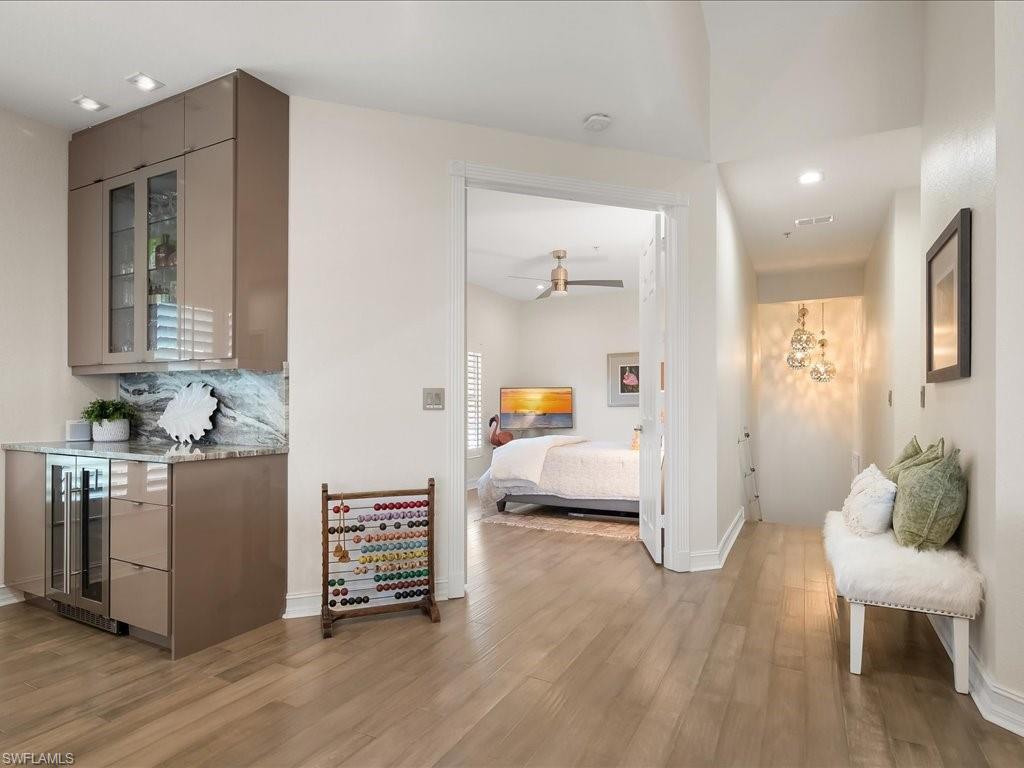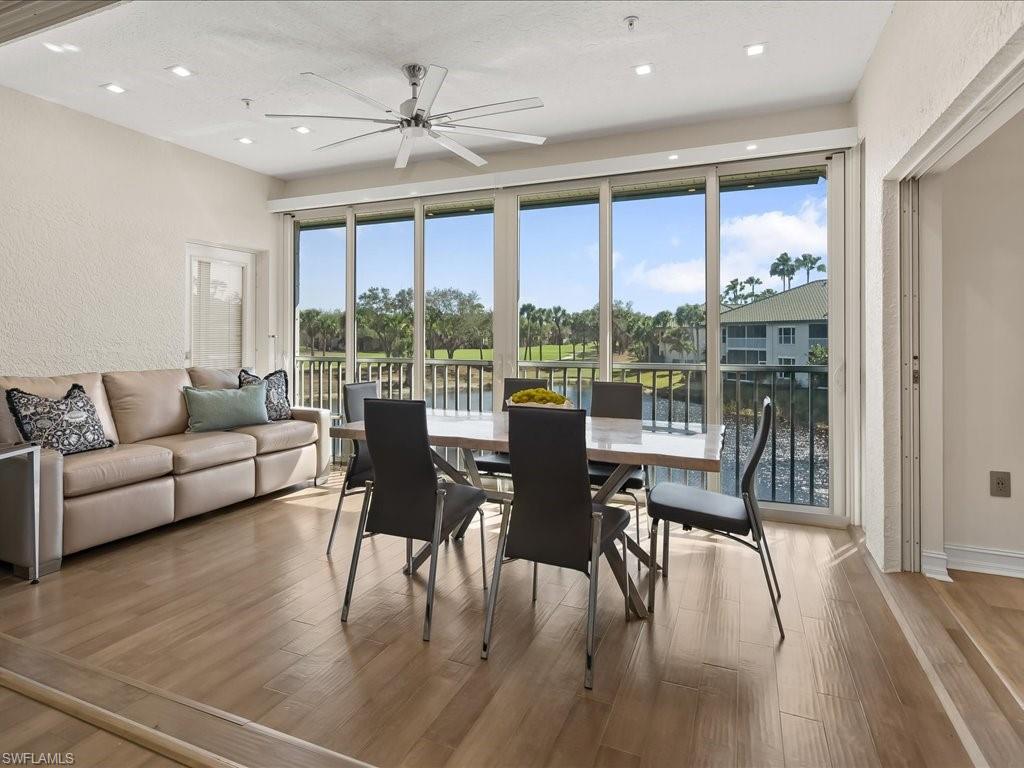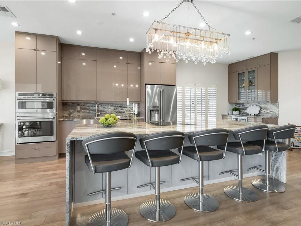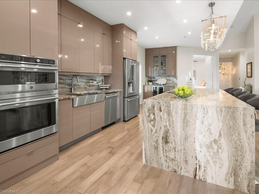 Beautifully renovated, impeccably designed, and perfectly located—this elegant residence offers the ideal blend of luxury, comfort, and the vibrant Southwest Florida lifestyle. Experience effortless Southwest Florida living in this completely reimagined and beautifully renovated residence in the highly sought-after community of Pelican Landing. Taken down to the studs and thoughtfully redesigned, this stunning condo blends casual coastal elegance with exceptional craftsmanship—offering a truly turnkey opportunity where every detail has already been perfected. The redesigned floor plan creates an open, inviting, light, bright, living space centered around a spectacular chef’s kitchen. A dramatic 10-foot island with a granite waterfall countertop and storage on both sides anchors the room. All complemented by sleek European cabinetry, a stainless double farmhouse sink, touchless faucet, and premium GE Café appliances—including a refrigerator with a built-in Keurig for effortless mornings. The spacious gathering area flows seamlessly into the enclosed all-season lanai, where impact glass sliding doors transform the space into an extension of the living area. From here, enjoy peaceful golf course and lake views that create the perfect backdrop for morning coffee or evening gatherings. Throughout the home, sophisticated design elements elevate the living experience—from stunning statement lighting and recessed LED lighting to engineered wood flooring, custom Lucite handrails, and thoughtfully designed storage solutions with fully outfitted closets. A brand new AC unit ensures your comfort won’t be interrupted. The serene primary suite offers a luxurious retreat, highlighted by a spa-inspired bath featuring quartzite countertops, dramatic tile work, and a walk-in shower with multiple shower heads and a rain shower for a true resort-style experience. Offered turnkey, this residence allows you to move in and immediately begin enjoying the Southwest Florida lifestyle. The home is beautifully appointed with elegant, designer-selected furnishings that perfectly complement the coastal aesthetic of the renovation. Every detail has been thoughtfully curated—from sophisticated décor to high-end finishes—creating a polished, luxurious space where nothing is needed except your suitcase. Located within the amenity-rich community of Pelican Landing, residents enjoy an unparalleled lifestyle including a private 34 acre beach park accessible by water taxi, tennis and pickleball centers, fitness facilities, kayaking, sailing, walking trails, and optional golf at The Nest or The Colony.
