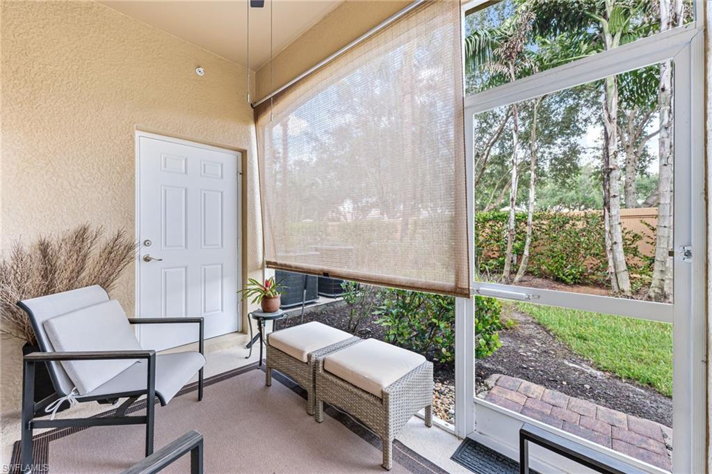 Don’t miss your opportunity to own this beautifully maintained, move-in ready condo! Convenient, first floor living - no stairs. NEW HVAC November 2024! Value-added upgrades—Both bedrooms updated with CoreTec, luxury wide-plank, no-maintenance flooring. Custom Bali Vertical Fabric Panels on slider door offers morning filtered light and privacy when needed. All lighting updated for a more contemporary ambient feel; interior freshly painted in April 2023, exterior April 2025. All hurricane-glass windows custom-fitted with privacy wood blinds. Featuring 2 bedrooms, a versatile den, and an open-concept design, this home is perfect for full-time living, a seasonal retreat or investment. The kitchen features stainless steel appliances, granite countertops, 42” cherry cabinets, a charming dining area, and convenient island, that flows seamlessly into the expansive great room with 10' ceilings and crown moulding—a welcoming space for entertaining and everyday living. Primary suite is generously sized, with en-suite bath complete with dual sinks and a walk-in shower. The second bedroom, located on the opposite side of the home, offers added privacy for guests or family. Second bath is wheelchair accessible. The den is the perfect spot for a home office, reading nook, or an extra bedroom. This first floor condo flows freely to backyard lanai offering convenience for pets with seamless access to the outdoors. This is a pet-friendly community. Residents of Sorrento enjoy resort-style amenities, including a palm tree-lined pool with waterfall, clubhouse, fitness center, and bocce courts. Noteworthy—quarterly fees offer more amenities compared to other communities in the area—includes water, sewer, trash, internet/cable, landscape/exterior maintenance. If so inclined, monthly get-togethers and pool gatherings are a great way to get to know your neighbors. This friendly community is located off a quieter section of Bonita Beach Road surrounded by natural preserves and walking trails to explore. Conveniently located near I-75 and just a short drive to the beaches as well as luxury shopping and dining at the future “Midway at Bonita”.