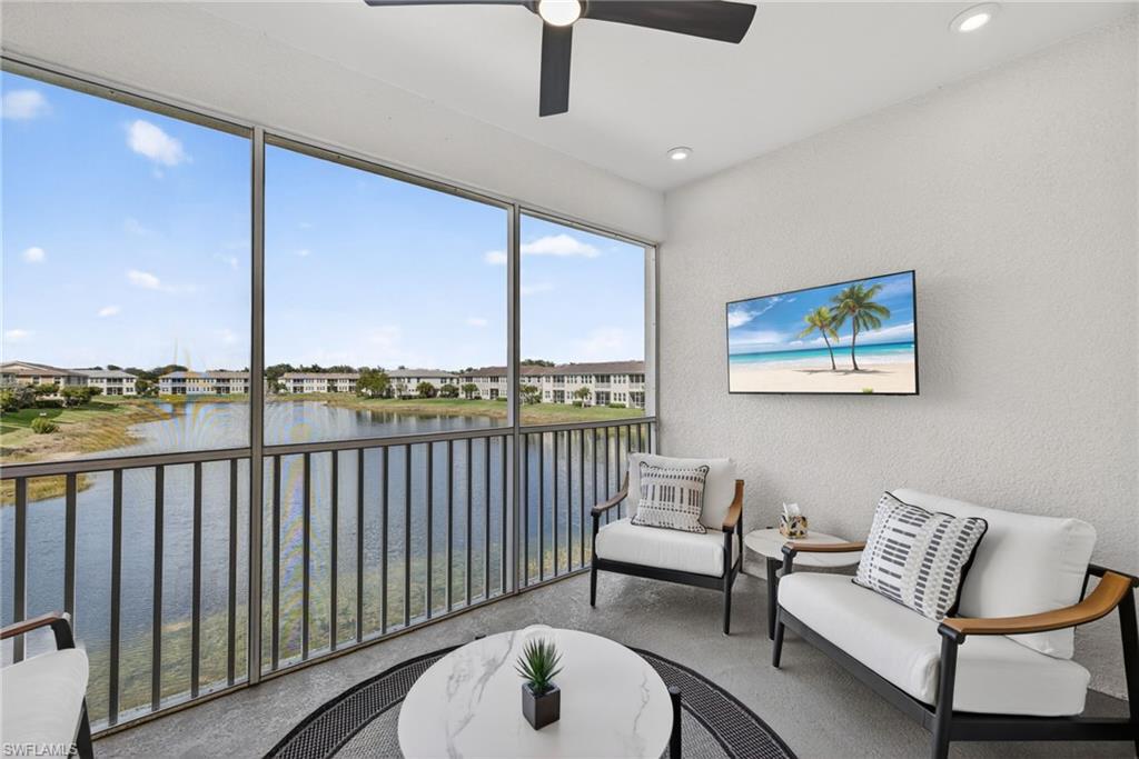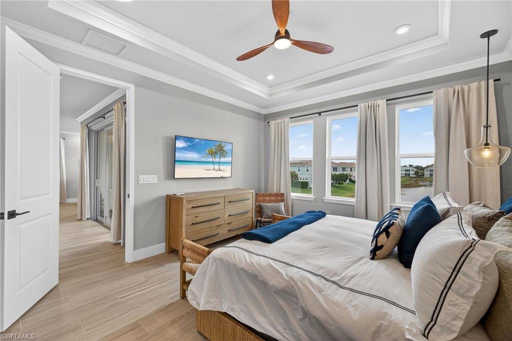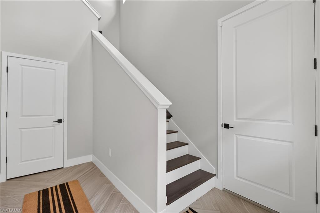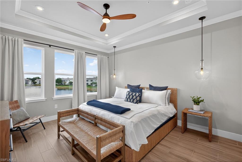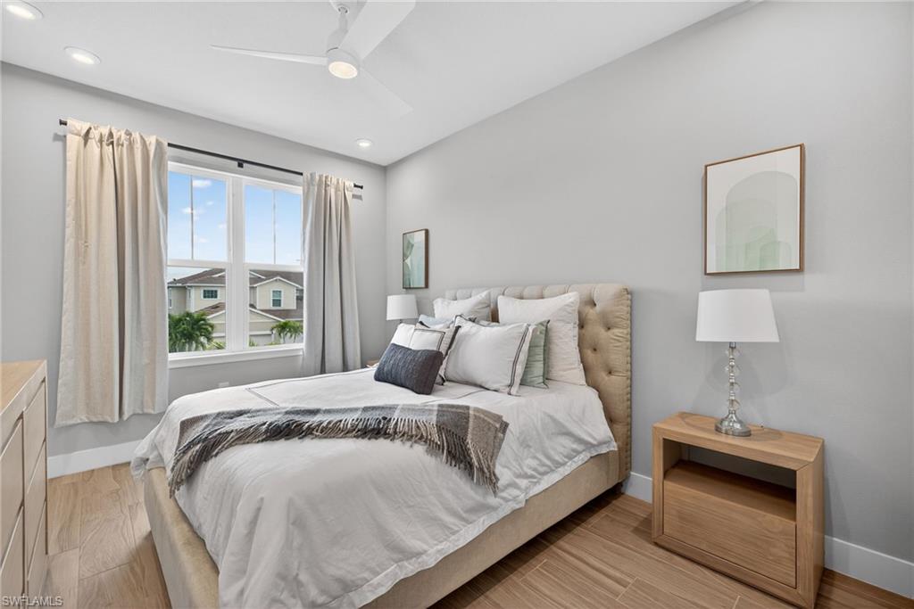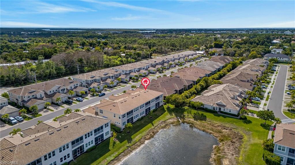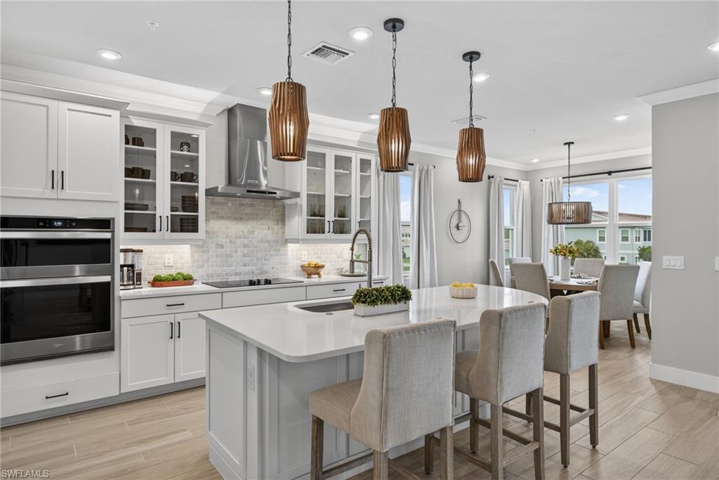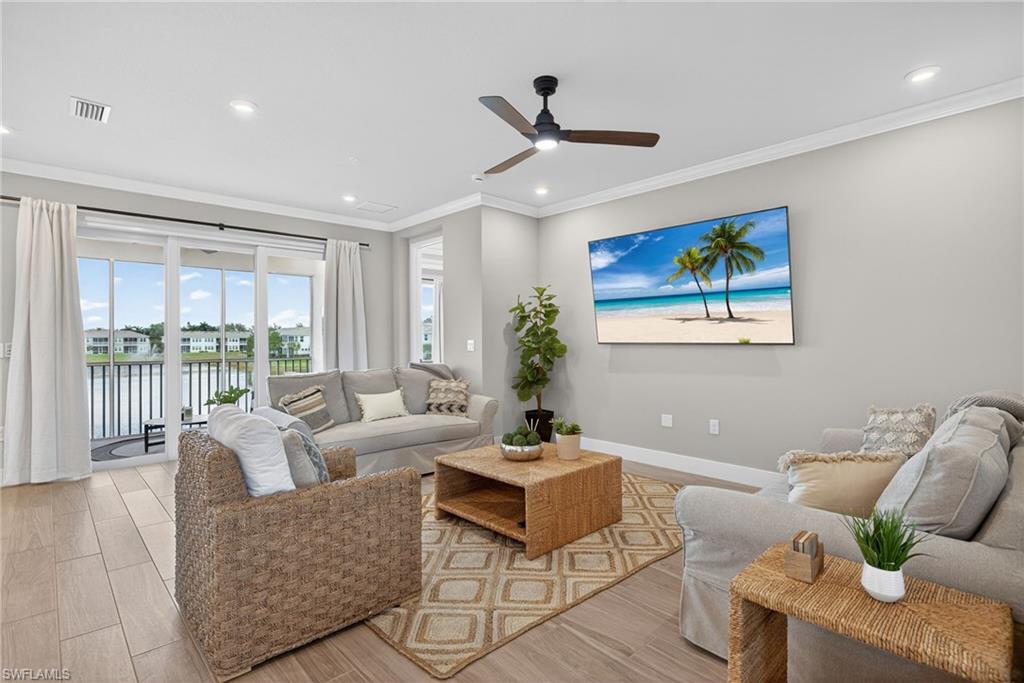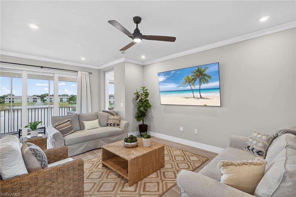 Set against sweeping panoramic lake views, this beautifully and fully upgraded better than new end-unit residence offers one of the most enhanced homes within the community. The two-story Oceangrove floor plan features three bedrooms, two full baths, and a two-car attached garage, combining modern design with thoughtful functionality in the vibrant Bayshore Arts District—just minutes from downtown Naples and the Gulf’s white-sand beaches. The open-concept interior is filled with natural light and finished in a coastal contemporary style, highlighted by beautiful wood-look tile flooring throughout the main living areas. At the heart of the home is a chef-inspired eat-in kitchen featuring white shaker cabinetry, quartz countertops, upgraded appliances including glass front refrigerator, Carrara marble backsplash, an oversized island ideal for entertaining, and a spacious walk-in pantry. The dining area and lanai both overlook the tranquil lake, creating an ideal setting for everyday living or relaxed gatherings. Endless upgrades including crown molding, hardwood interior stairs, upgraded light fixtures and ceiling fans throughout. Smart-home features enhance convenience and security, including Wi-Fi–enabled appliances, a smart thermostat, electronic door lock, whole-house surge protection, and a Ring security system. The home also includes an impressive 85-inch Samsung smart TV. A full-size laundry room with upgraded side-by-side washer and dryer provides additional storage and functionality. As an end unit, the home enjoys abundant natural light along with a lanai that captures expansive lake views plus a wall-mounted TV. The two-car garage features an epoxy floor. Residents enjoy access to community amenities including a pool and fitness center. The low HOA fee adds exceptional value and includes high-speed internet, water, sewer, landscaping, and exterior building insurance—making this an ideal full-time residence or seasonal retreat in one of Naples’ fastest-growing and most creative districts. An easy walk or bike right to Naples Pickleball center and Naples Botanical Garden. Offered turnkey furnished with $50k+ worth of furnishings. Originally the lot premium was $89k. Truly the most exceptional home in the community.