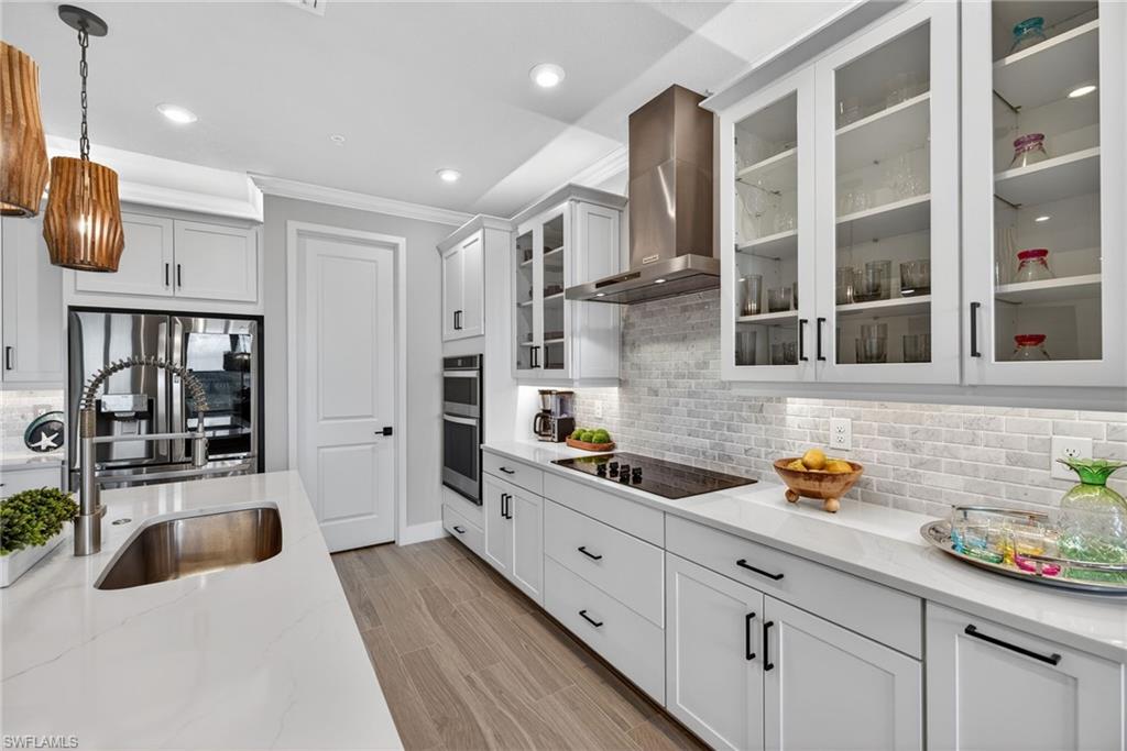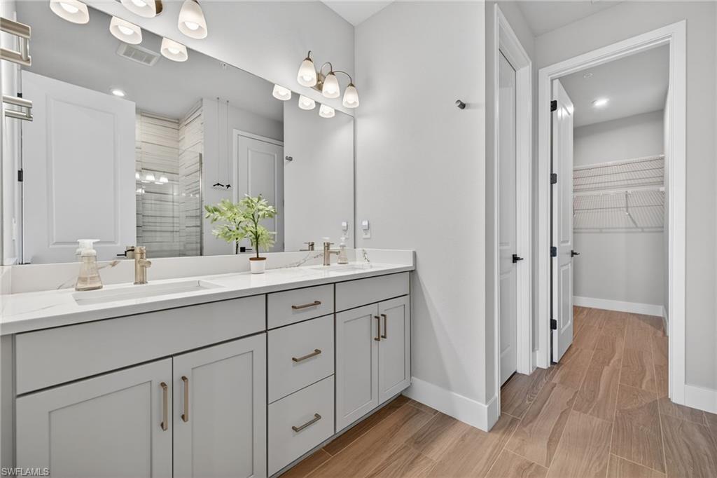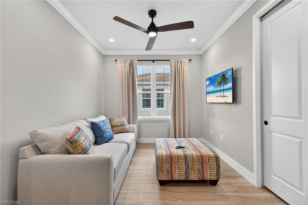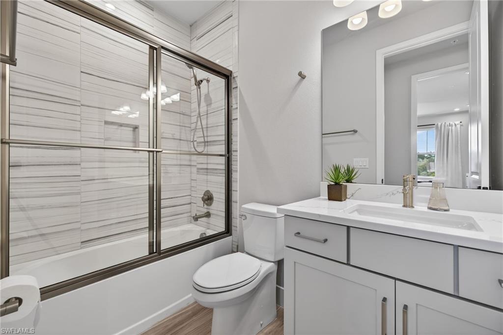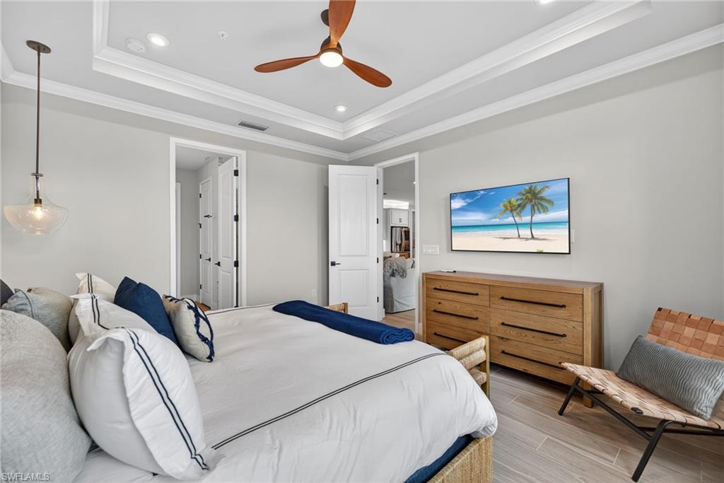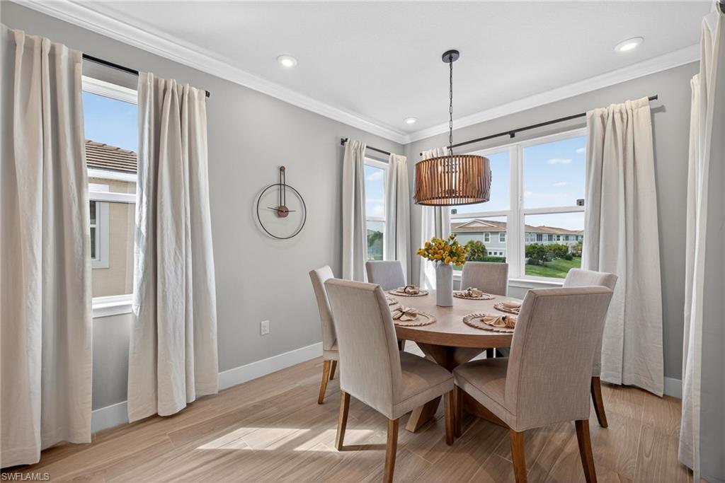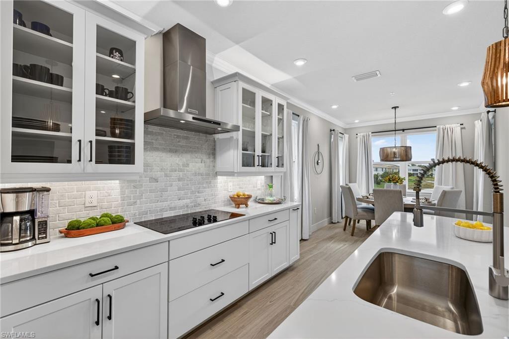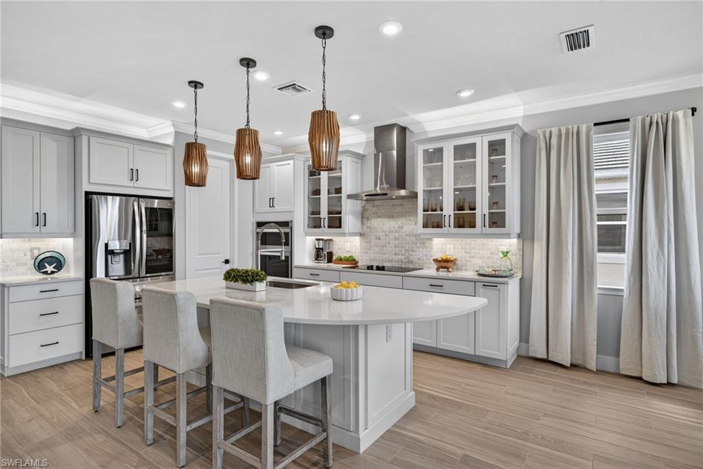 Set against sweeping panoramic lake views, this beautifully and fully upgraded better than new end-unit residence offers one of the most enhanced homes within the community. The two-story Oceangrove floor plan features three bedrooms, two full baths, and a two-car attached garage, combining modern design with thoughtful functionality in the vibrant Bayshore Arts District—just minutes from downtown Naples and the Gulf’s white-sand beaches. The open-concept interior is filled with natural light and finished in a coastal contemporary style, highlighted by beautiful wood-look tile flooring throughout the main living areas. At the heart of the home is a chef-inspired eat-in kitchen featuring white shaker cabinetry, quartz countertops, upgraded appliances including glass front refrigerator, Carrara marble backsplash, an oversized island ideal for entertaining, and a spacious walk-in pantry. The dining area and lanai both overlook the tranquil lake, creating an ideal setting for everyday living or relaxed gatherings. Endless upgrades including crown molding, hardwood interior stairs, upgraded light fixtures and ceiling fans throughout. Smart-home features enhance convenience and security, including Wi-Fi–enabled appliances, a smart thermostat, electronic door lock, whole-house surge protection, and a Ring security system. The home also includes an impressive 85-inch Samsung smart TV. A full-size laundry room with upgraded side-by-side washer and dryer provides additional storage and functionality. As an end unit, the home enjoys abundant natural light along with a lanai that captures expansive lake views plus a wall-mounted TV. The two-car garage features an epoxy floor. Residents enjoy access to community amenities including a pool and fitness center. The low HOA fee adds exceptional value and includes high-speed internet, water, sewer, landscaping, and exterior building insurance—making this an ideal full-time residence or seasonal retreat in one of Naples’ fastest-growing and most creative districts. An easy walk or bike right to Naples Pickleball center and Naples Botanical Garden. Offered turnkey furnished with $50k+ worth of furnishings. Originally the lot premium was $89k. Truly the most exceptional home in the community.