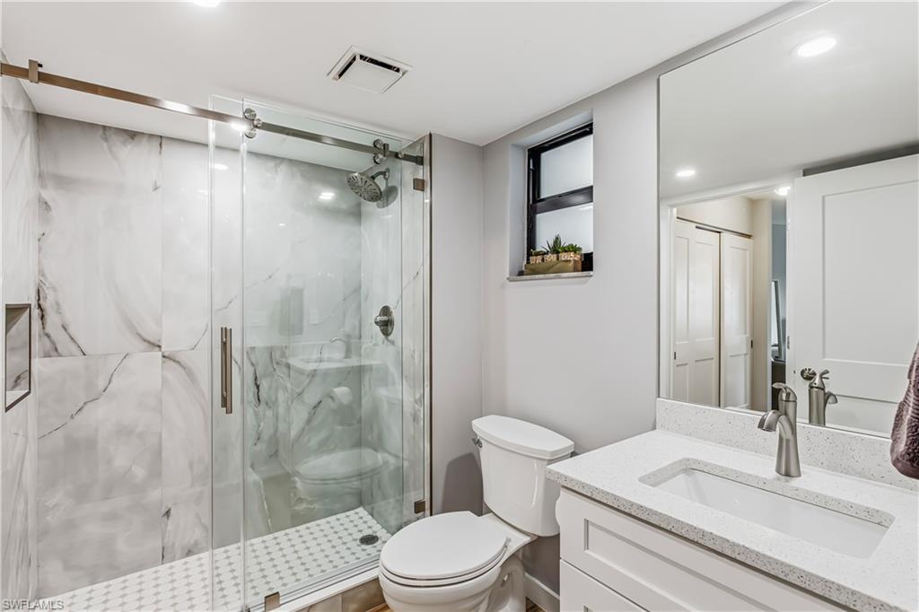 Stunning renovation just completed in this Anglers Cove unit with covered assigned parking space. You will enjoy the new kitchen, bath, living room and bedroom updates. New luxury vinyl floors, appliances, and lighting round off the fresh new feel. Enjoy a cocktail from the enclosed lanai with the tropical views of the grounds, pool and a peak of the bay. The 01 units offer a unique view advantage due to the building design. This unit already has the recently required impact windows and doors installed. Anglers Cove is a waterfront condominium overlooking Factory Bay and the Marco River. Amenities include two heated pools, hot tub, tennis courts and on-site Dolphin Tiki Bar & Grill. Boat docks are available for lease, offering quick access to the Gulf for boating or jet skis. Conveniently located on the island, it is close to dining, shopping and beaches. The highly sought after, assigned parking spot next to the elevator offers convenience in this popular destination for both personal use or proven investment opportunities offering weekly rentals. The tropical landscaping and association updates make paradise retreat a relaxing experience. Electric, water and cable are included in the HOA fees. Easy to show so book your private showing today.
