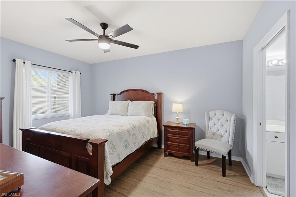 Exceptionally clean and fresh looking, ground floor Palmdale model with its large great room and open living area concept. 2 Bedrooms and den area off the living room with 2 full baths. Southern exposure gives you winter sun alone with the golf course and lake view. A spacious kitchen with lots of counterspace and a tasteful backsplash for elegance. Tile flooring in the wet areas with laminate on the other floors. This building is more private than most and is easy to enter and exit. The upgraded windows make this a quiet home both day and night. Relax, knowing this home as never had any flooding. The windows have been upgraded with impact glass and an electric roll down shutter protects the lanai. Breckenridge is an affordable, friendly and socially active community with bundled golf, 5 pools, 8 Har Tru tennis courts, pickle ball, bocce, shuffleboard and clubhouse has just been updated. Estero is in the heart of Southwest Florida only minutes from the airport, beaches, 3 huge shopping malls, restaurants galore, public library and state park. Short drive to Naples or Fort Myers. For those desiring public transportation, a stop is just outside the Breckenridge gate. 5G WiFi is included. Please check out the 3D virtual tour.