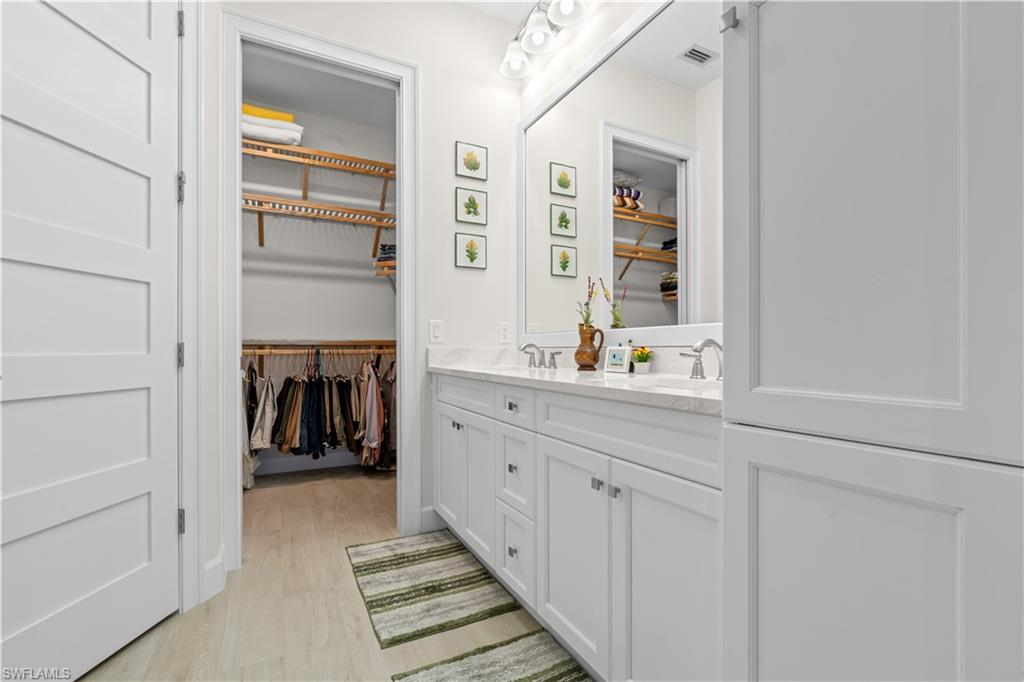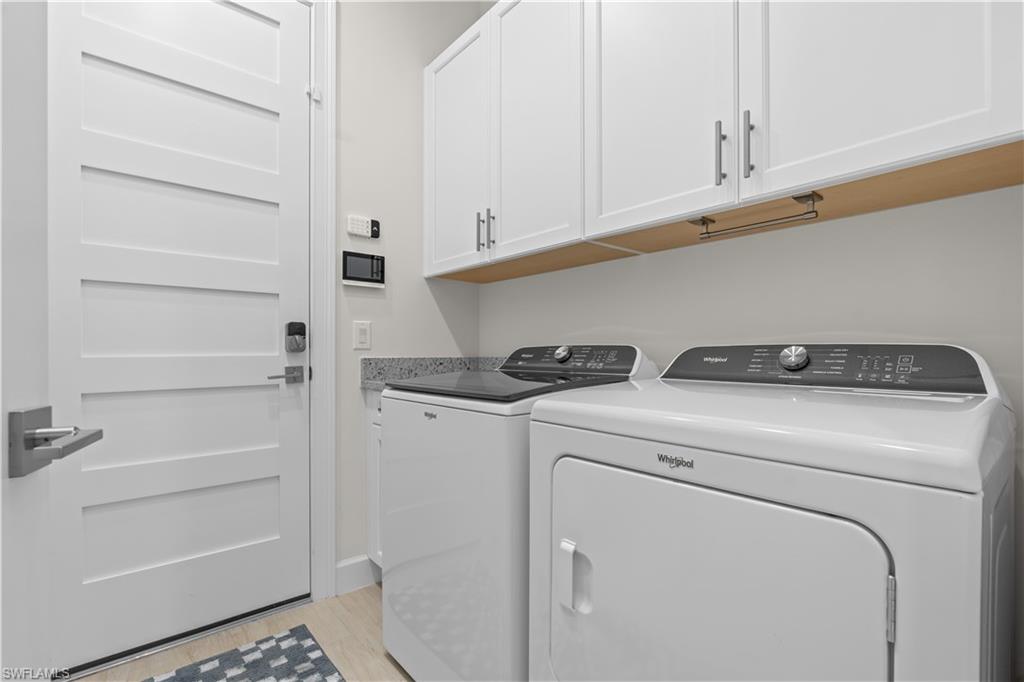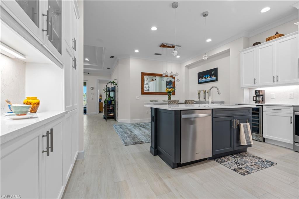This is the one! Clean and like new 2-bedroom + den, 2-bath, 2-car garage pool/spa villa in the highly desirable Isles of Collier Preserve offers the perfect combination of luxury, privacy, and resort-style living. Built just two years ago, this beautifully upgraded Dahlia model features light plank tile flooring throughout, elegant double crown molding, and a whole-house Allini water treatment system so you can enjoy purified water from every faucet. The stunning bright and inviting kitchen is both stylish and functional, showcasing white cabinetry, striking blue and white quartz countertops that extend up the backsplash, a contrasting blue island, under-cabinet lighting, a beverage cooler, and a full wall of custom cabinetry for extra storage. The spacious living area and primary suite are enhanced with custom remote-controlled shades that offer both light-filtering and room-darkening options while framing peaceful private lake views. Step outside to your covered lanai and experience your own private retreat with a heated pool and spa overlooking the water—perfect for relaxing or entertaining. Additional upgrades include hurricane-impact windows and doors, block construction with a tile roof, epoxy garage flooring, ceiling-mounted storage racks, extra closet shelving, a high-efficiency mini-split A/C in the garage, MyQ garage keypad with camera, and Yale electronic locks for convenience and security. Residents of Isles of Collier Preserve enjoy an unmatched lifestyle with resort-style amenities including a beautiful clubhouse, resort and lap pools, pickleball, tennis, bocce, a state-of-the-art fitness center, on-site restaurant, and kayaks for exploring the scenic Cypress Waterway. Located just minutes from the world-class shopping, dining, and beaches of downtown Naples, this home truly offers the best of Southwest Florida living. Agent owned.