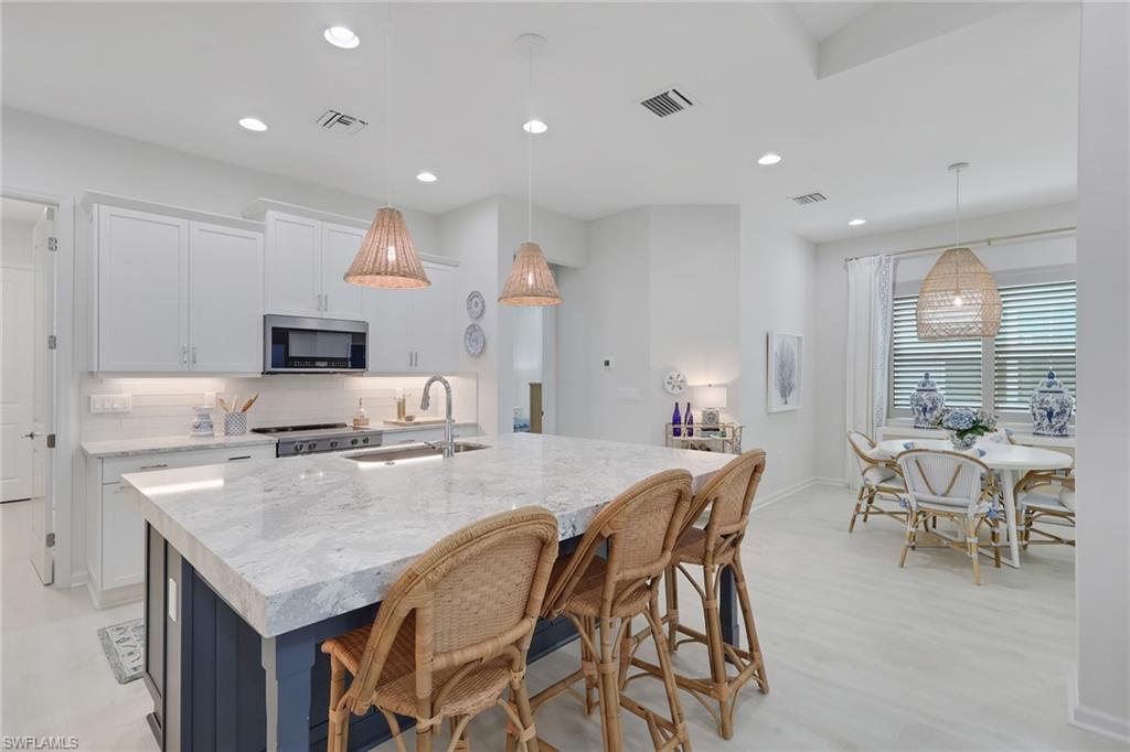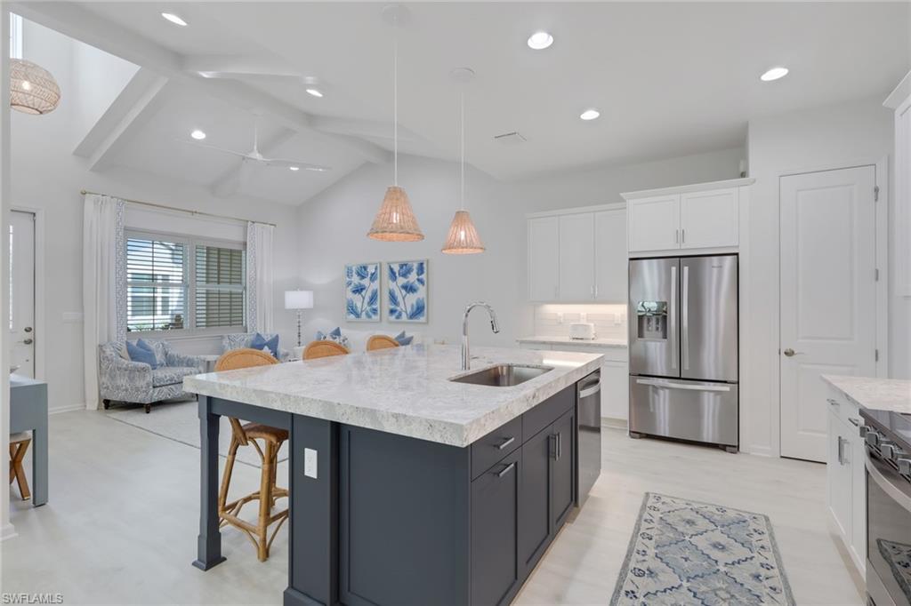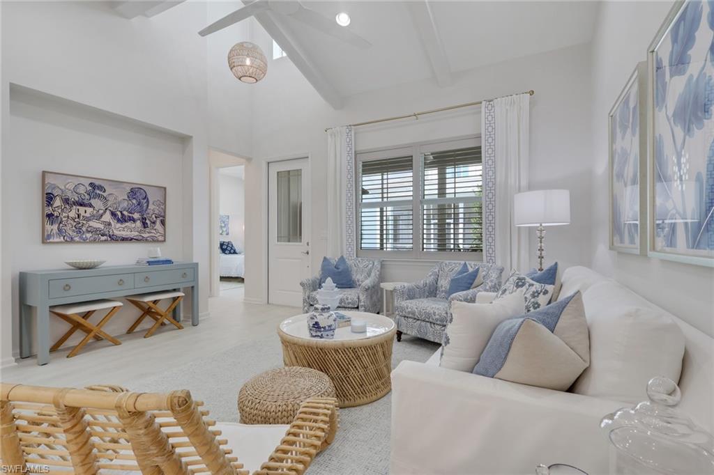 Experience coastal cottage living at its finest in this beautifully appointed Sanibel model home located in the highly sought-after gated community of The Isles of Collier Preserve in Naples, Florida. Light, bright, and airy, this exceptional residence features distinctive upgrades and designer interiors that truly set it apart and is being offered mostly furnished, with only a few exclusions. The home is beautifully styled with coastal decor and furnishings inspired by Serena & Lily and Pottery Barn, creating a warm and timeless cottage aesthetic throughout. The open-concept floor plan showcases a spacious great room with soaring ceilings and striking exposed beams that seamlessly flow into the gourmet kitchen and formal dining area—an ideal layout for both everyday living and entertaining. The chef’s kitchen features elegant white soft-close cabinetry, sleek quartz countertops with oversize double thick island, a generous double-sized island, and a large pantry, while refined finishes such as plantation shutters, crown molding, and impact-resistant doors and windows provide both style and peace of mind. Thoughtfully designed for privacy, the Sanibel layout places the primary suite and guest suite on opposite sides of the home. Step outside to the private screened lanai, perfect for enjoying morning coffee, outdoor dining, or relaxing while taking in the peaceful surroundings. A convenient rear-entry two-car garage completes the home. Residents of this remarkable 2,400-acre community enjoy miles of scenic walking and biking trails, preserved natural habitats, and an impressive array of resort-style amenities including a grand clubhouse, state-of-the-art fitness center, resort and lap pools, tennis, pickleball, bocce, a kayak launch, dog parks, and waterfront dining at the popular Overlook Bar & Grill. Ideally located just minutes from the world-class shopping, dining, and entertainment of Fifth Avenue South and the beautiful beaches of Marco Island, this exceptional coastal cottage offers the perfect blend of luxury, comfort, and the vibrant Naples lifestyle.
